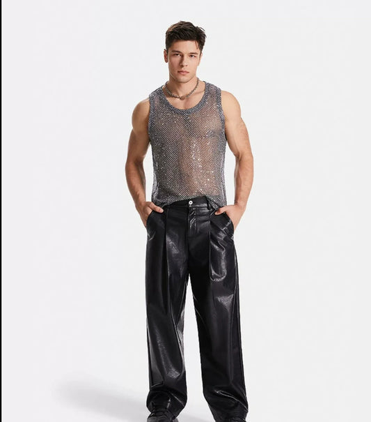 Devil Fashion Gothic Punk Crop Top - Black Leather with Fishnet Insert and O-Ring Detail (Women's)