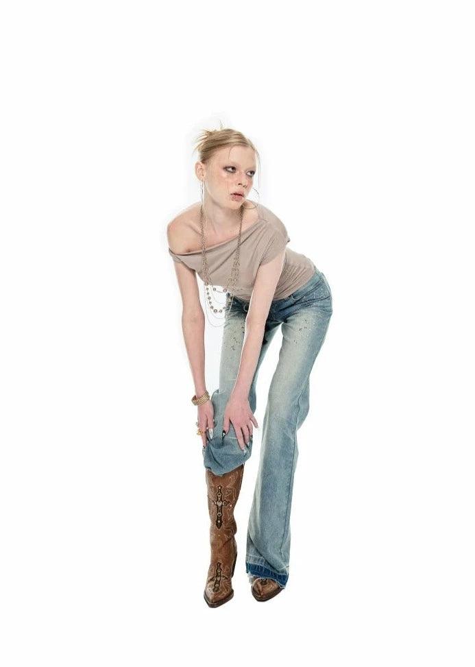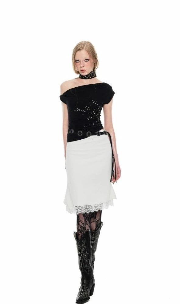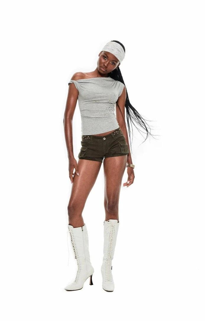 This T-shirt features an irregular twisted design with rivets and an off-shoulder style. The asymmetrical slanted neckline and single off-shoulder design beautifully accentuate the neck and shoulder lines. creating a relaxed and effortlessly chic look.Â