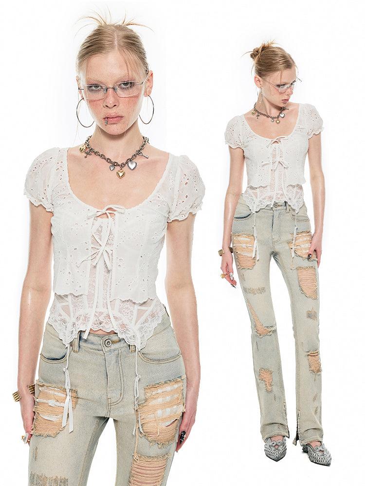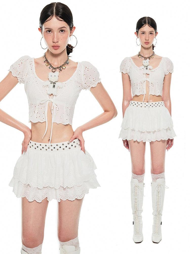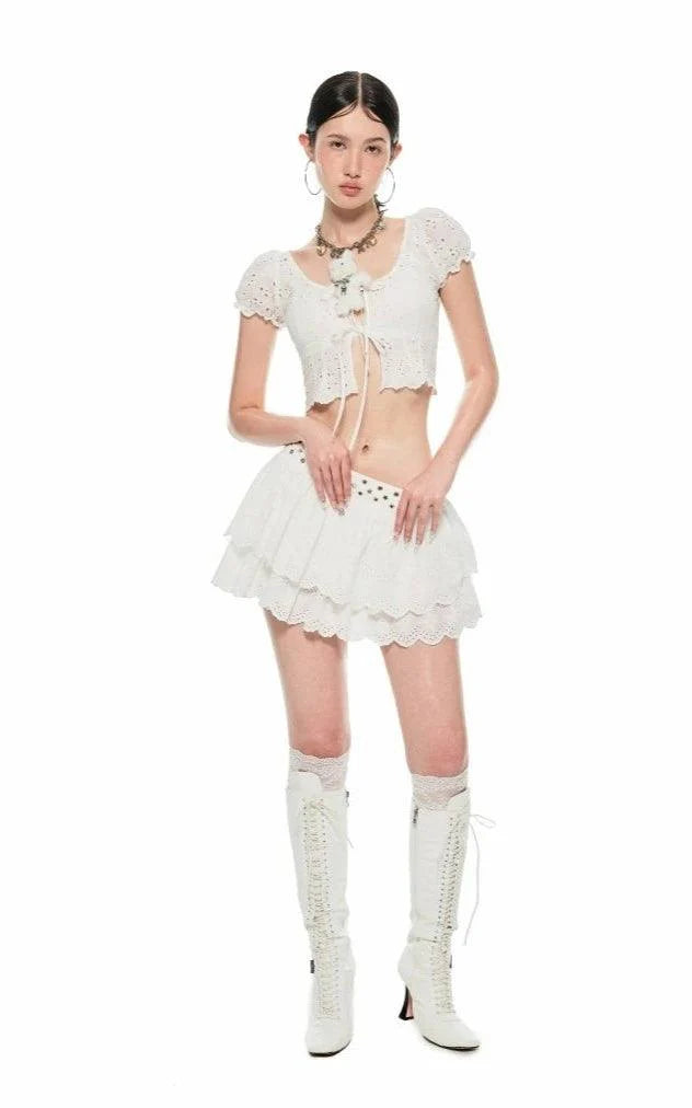 1Jin White Eyelet Lace-Up Crop Top - Women'S Puff Sleeve Ruffle Hem Top