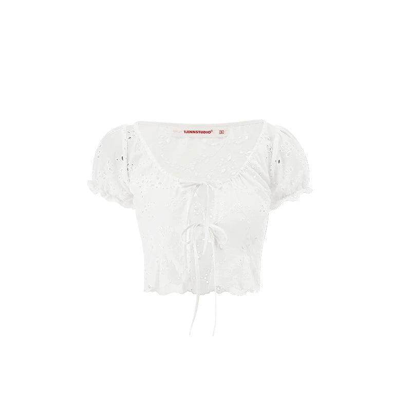 This short top features a pure cotton jacquard fabric with puff sleeves. The fitted. waist-cinching design with a cropped length accentuates the waistline curves. It has a large round neckline with an adjustable drawstring for versatility. The delicate puff sleeves are designed to flatter the arm lines. The placket features a tie design that can be styled in various ways according to preference.
