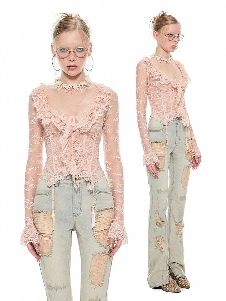 This is a short lace-edged cardigan with an ultra-short length design. The fitted style hugs the shoulders and arms. creating a slimming effect. It's perfect for layering over various summer outfits and provides sun protection. Versatile yet eye-catching. it exudes a vintage and relaxed French romantic atmosphere.Â