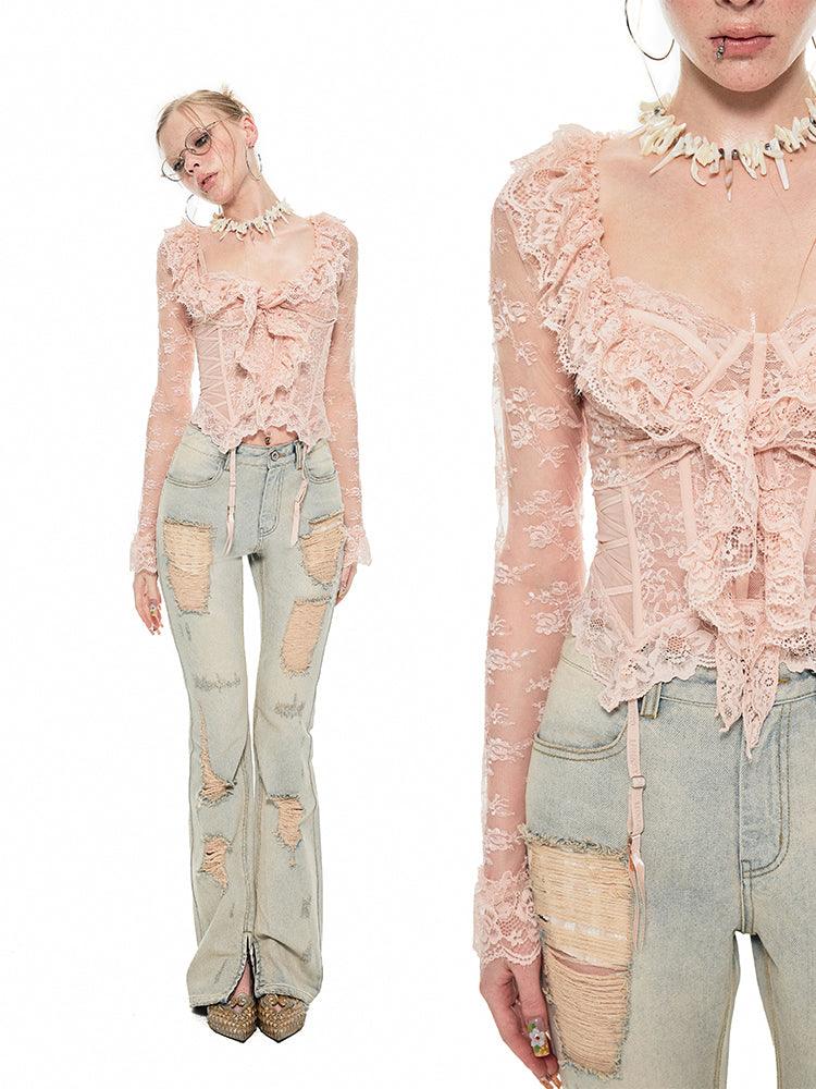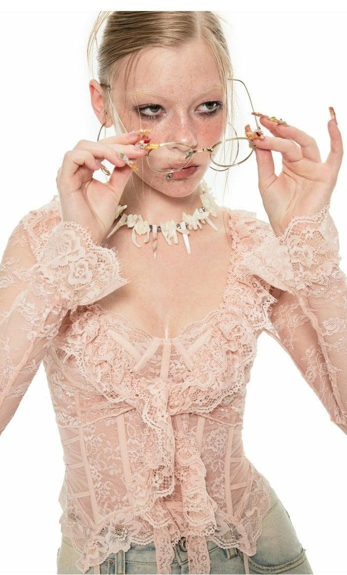 1Jinn Lace Shirt - Women'S Long Sleeve Ruffle Trim Tie Shirt