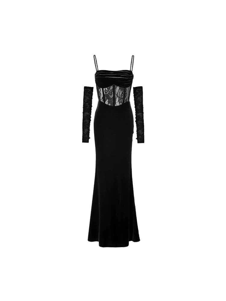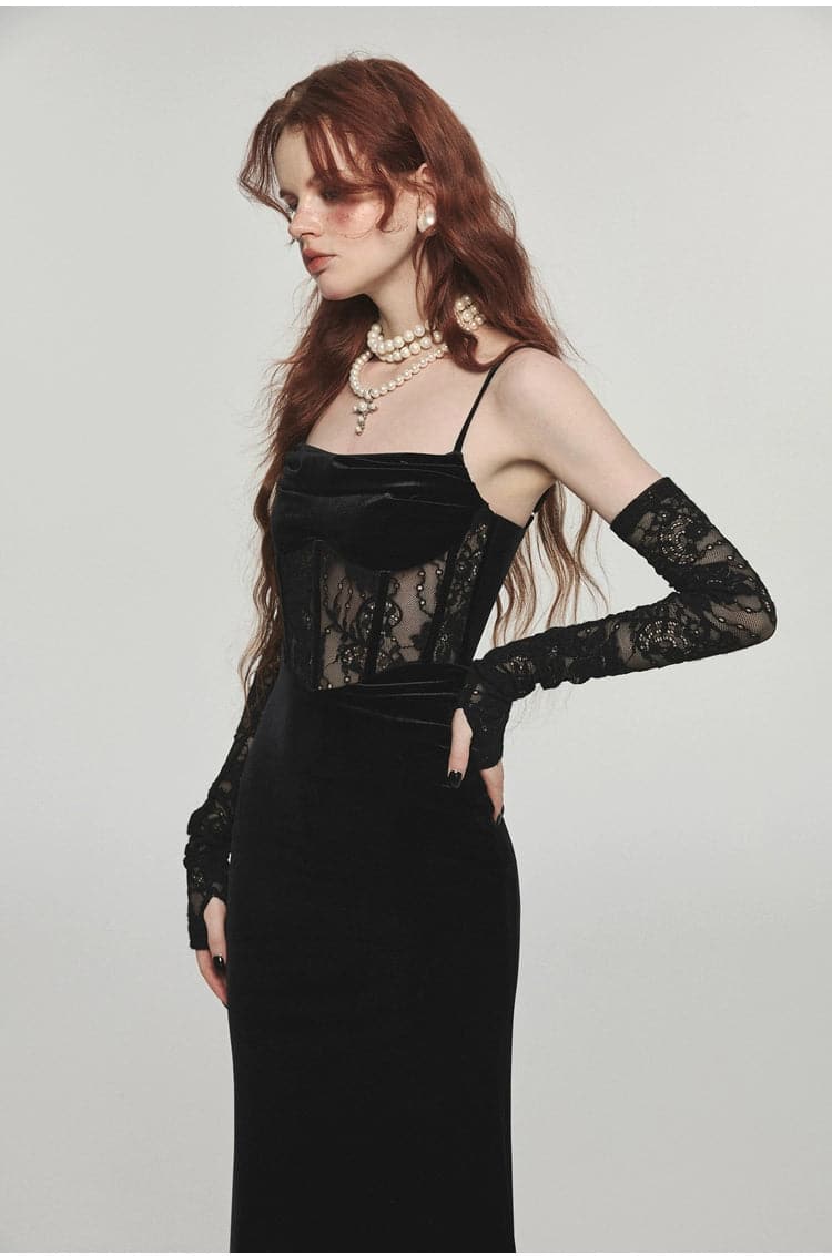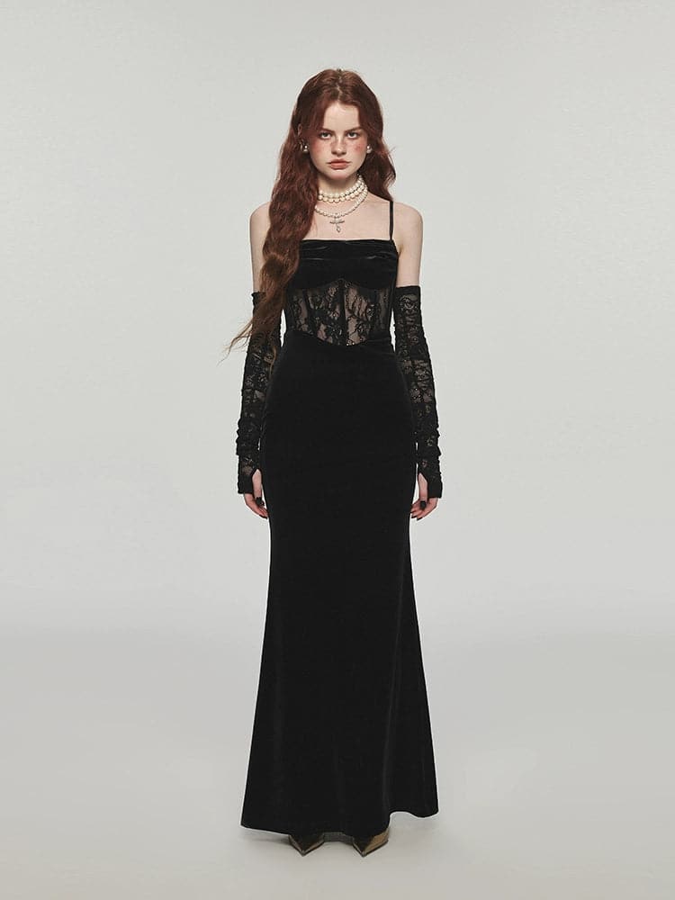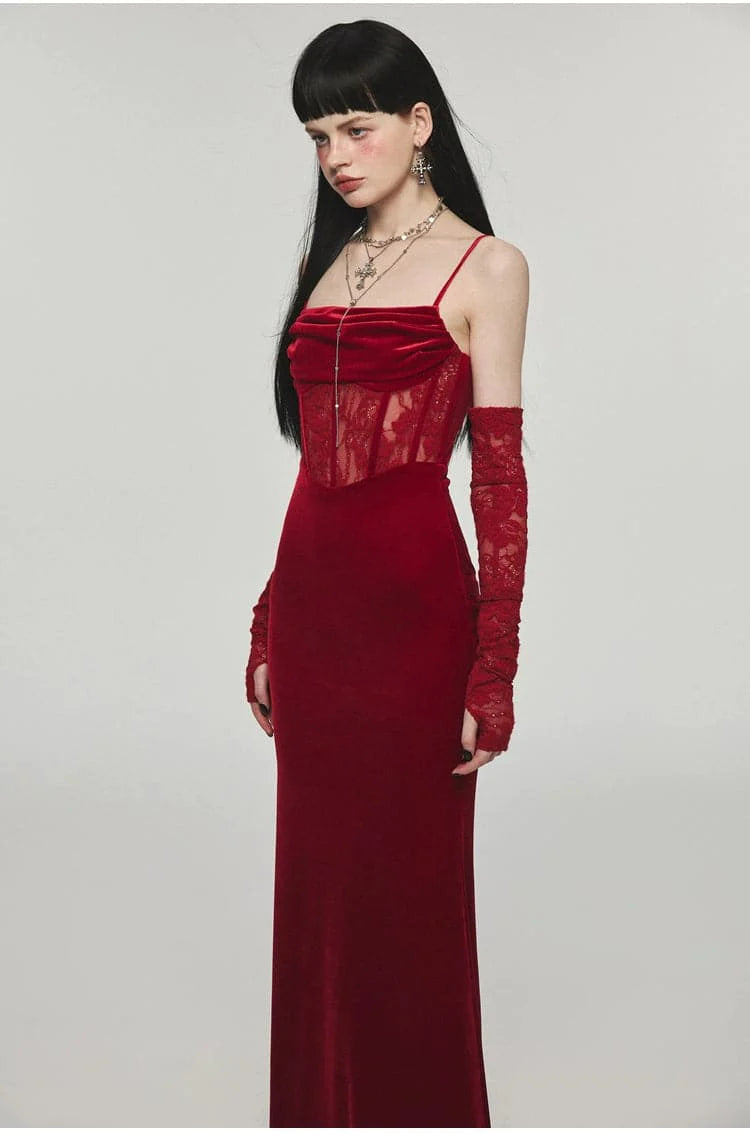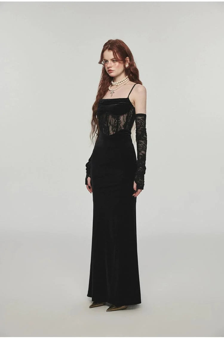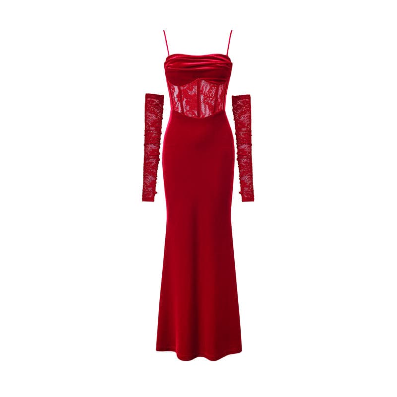 This long velvet dress with its unique fishbone strap design exudes elegance. The slim. Hip-hugging silhouette offers a flattering fit. making it the perfect choice for any festive or formal event.