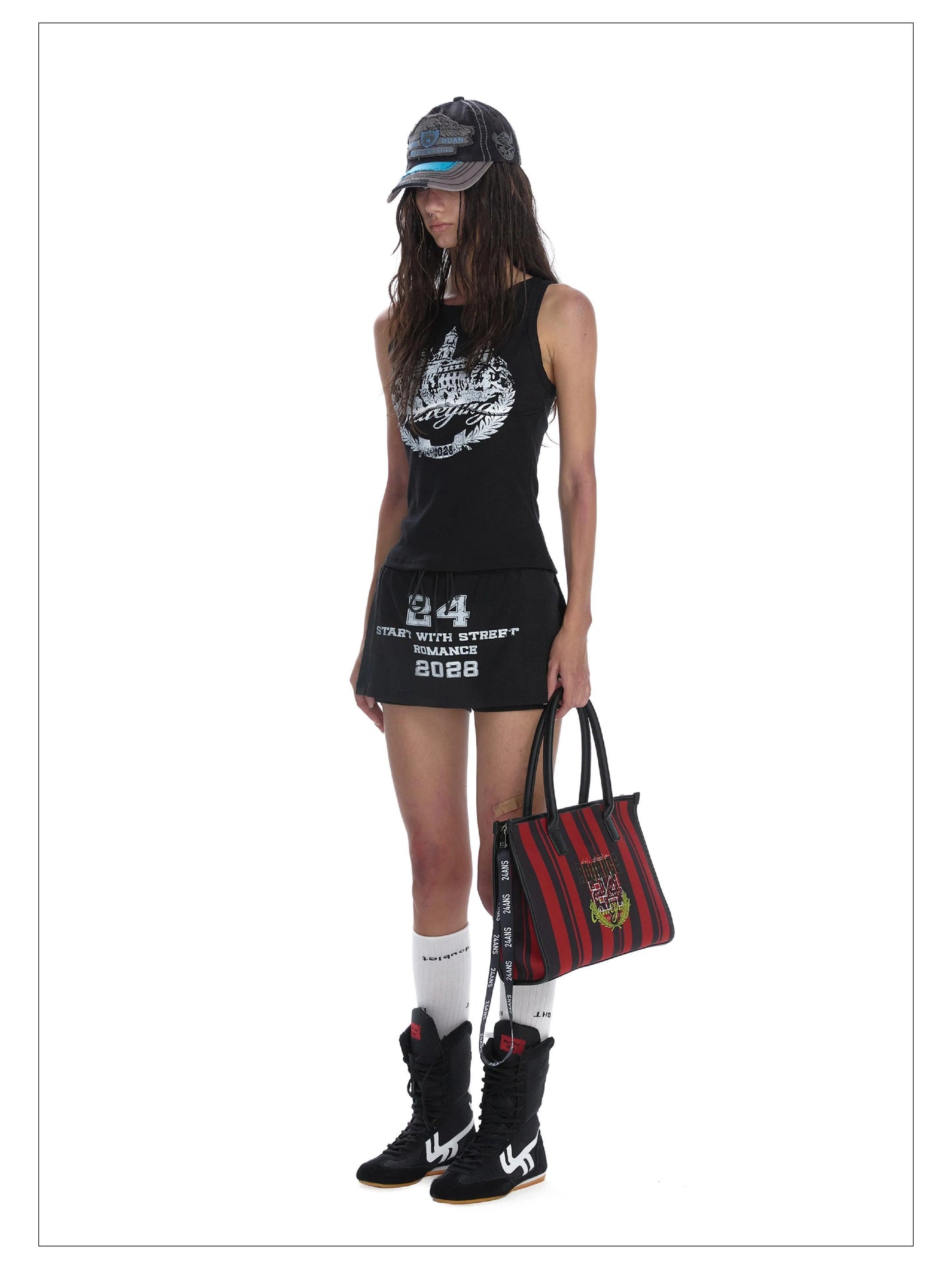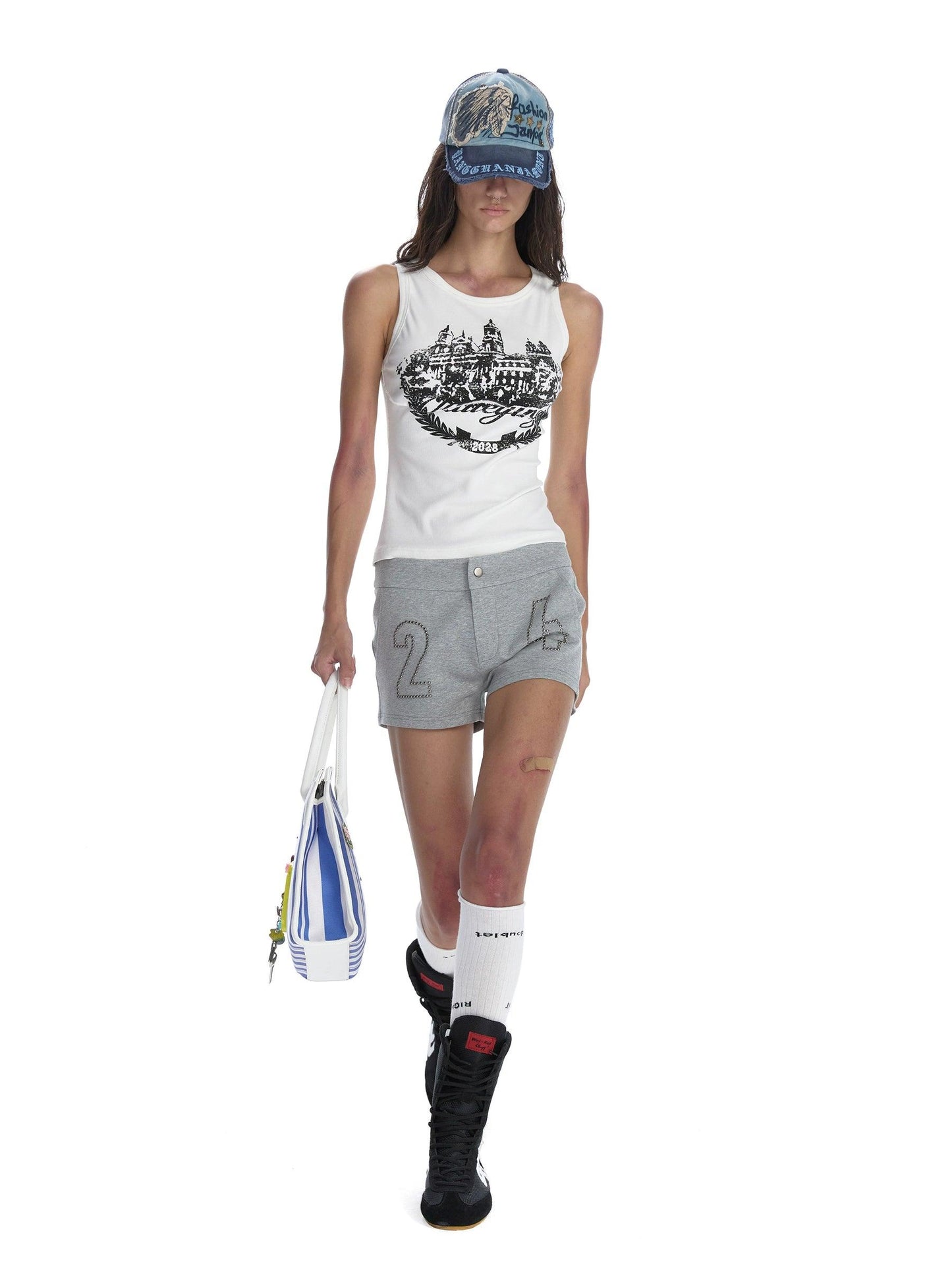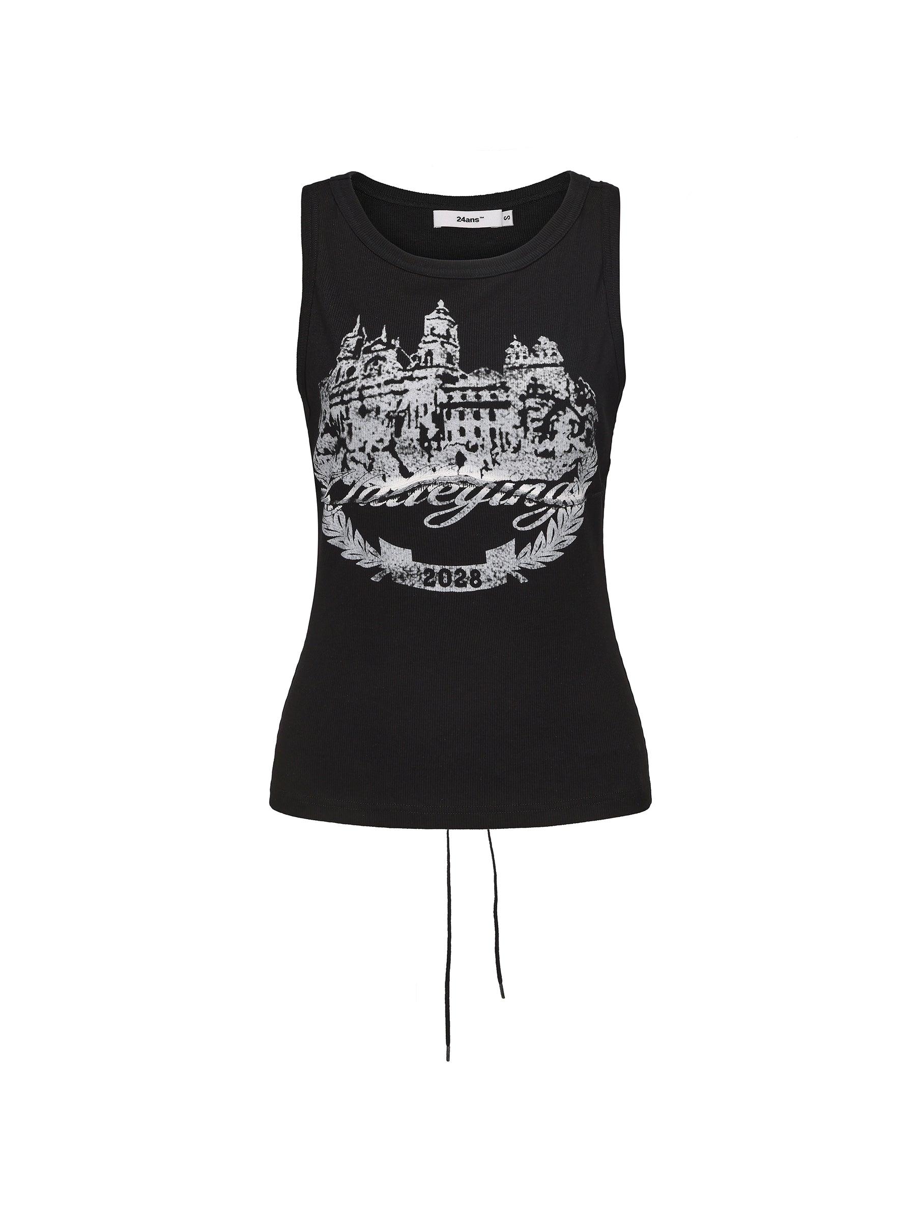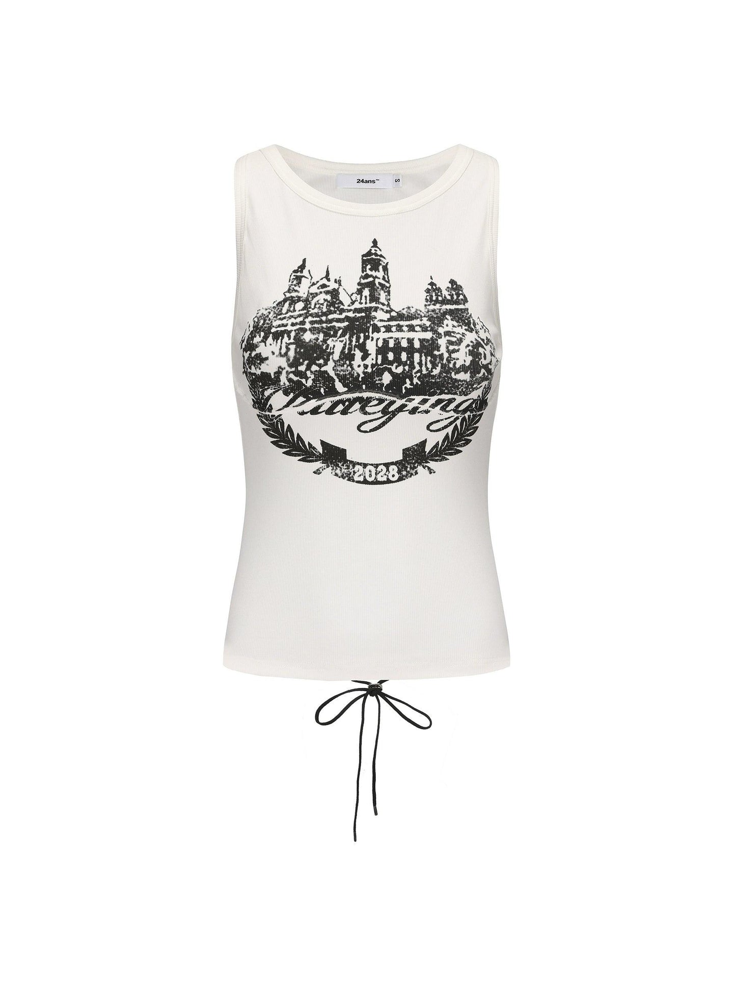 The 24ans Vintage Cityscape Graphic Tank Top is a women's sleeveless drawstring hem t-shirt that showcases a nostalgic cityscape graphic. Made from high-quality. breathable fabric. this tank top ensures comfort and style.Â