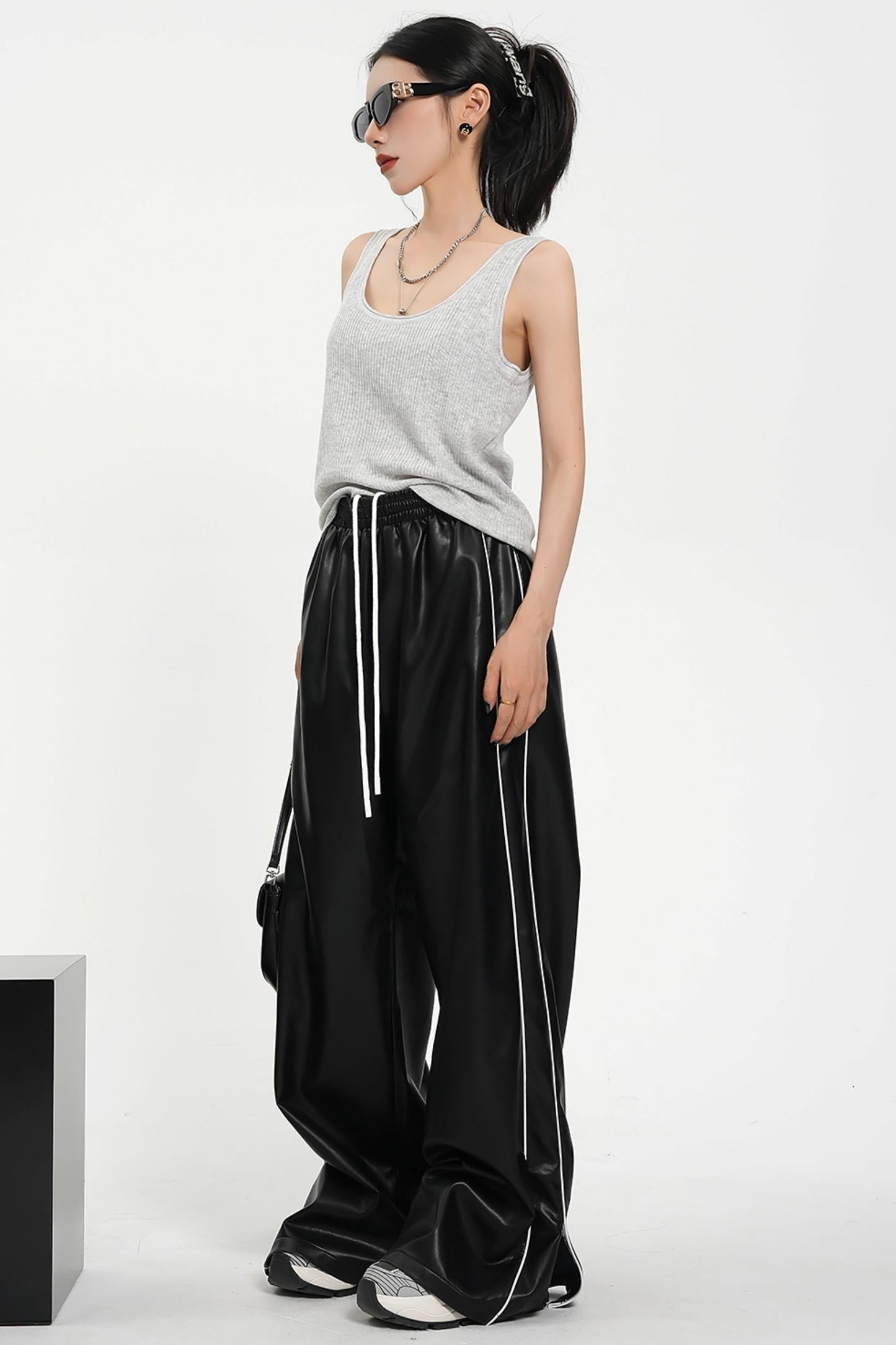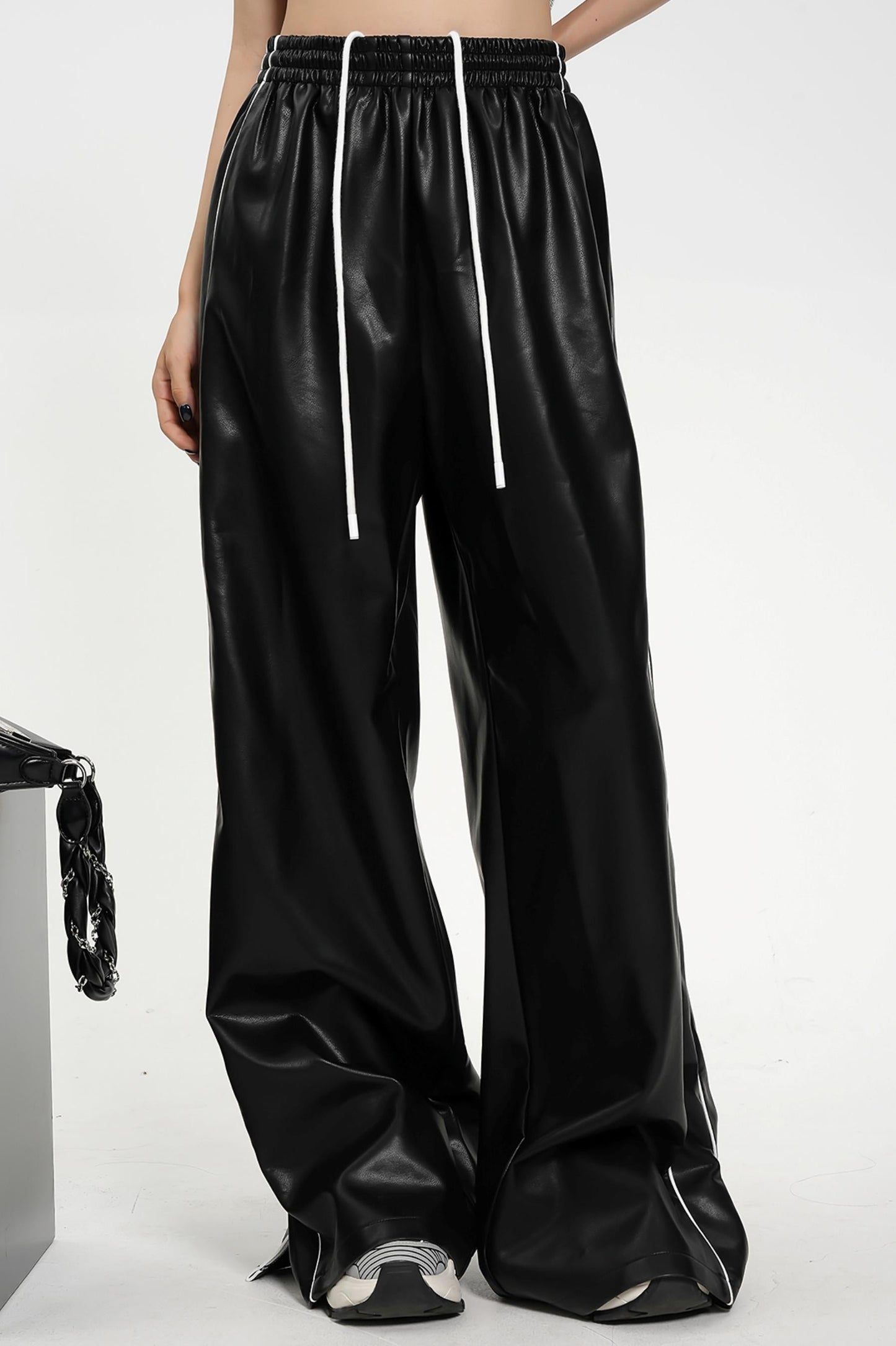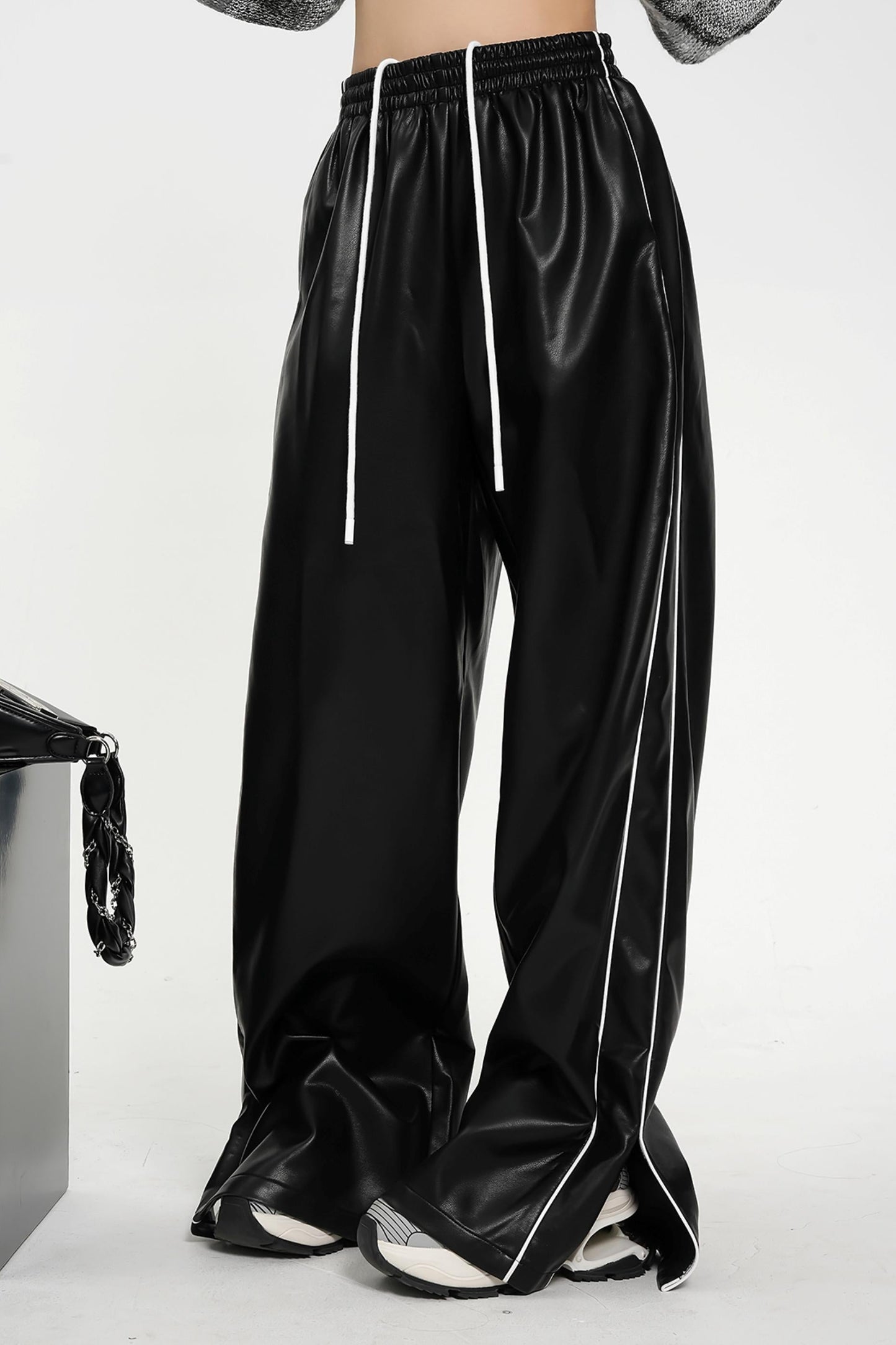 Elevate your sporty attire with our Luxe Satin-Look Drawstring Pants. Made with a wide leg design and a striped track bottom style. these pants offer both style and comfort. The drawstring waist allows for a customizable fit while the satin-look fabric adds a touch of luxury. Perfect for any fashion-forward athleisure look.
