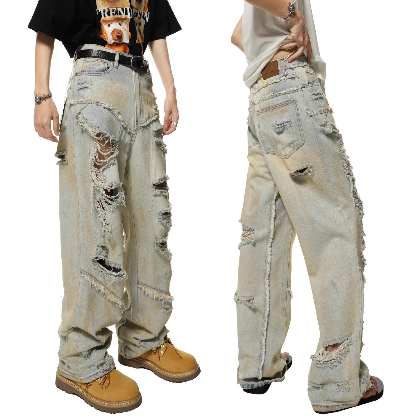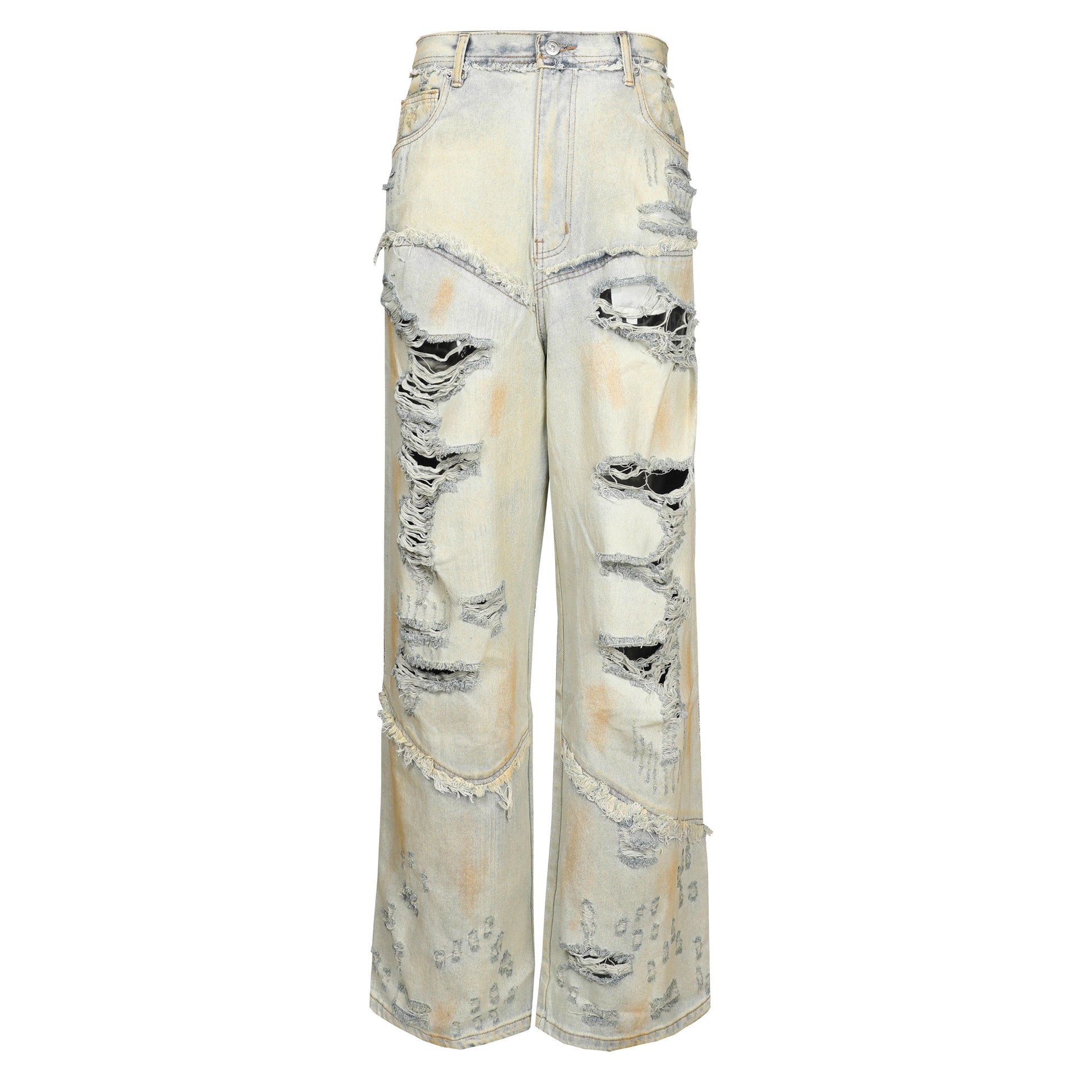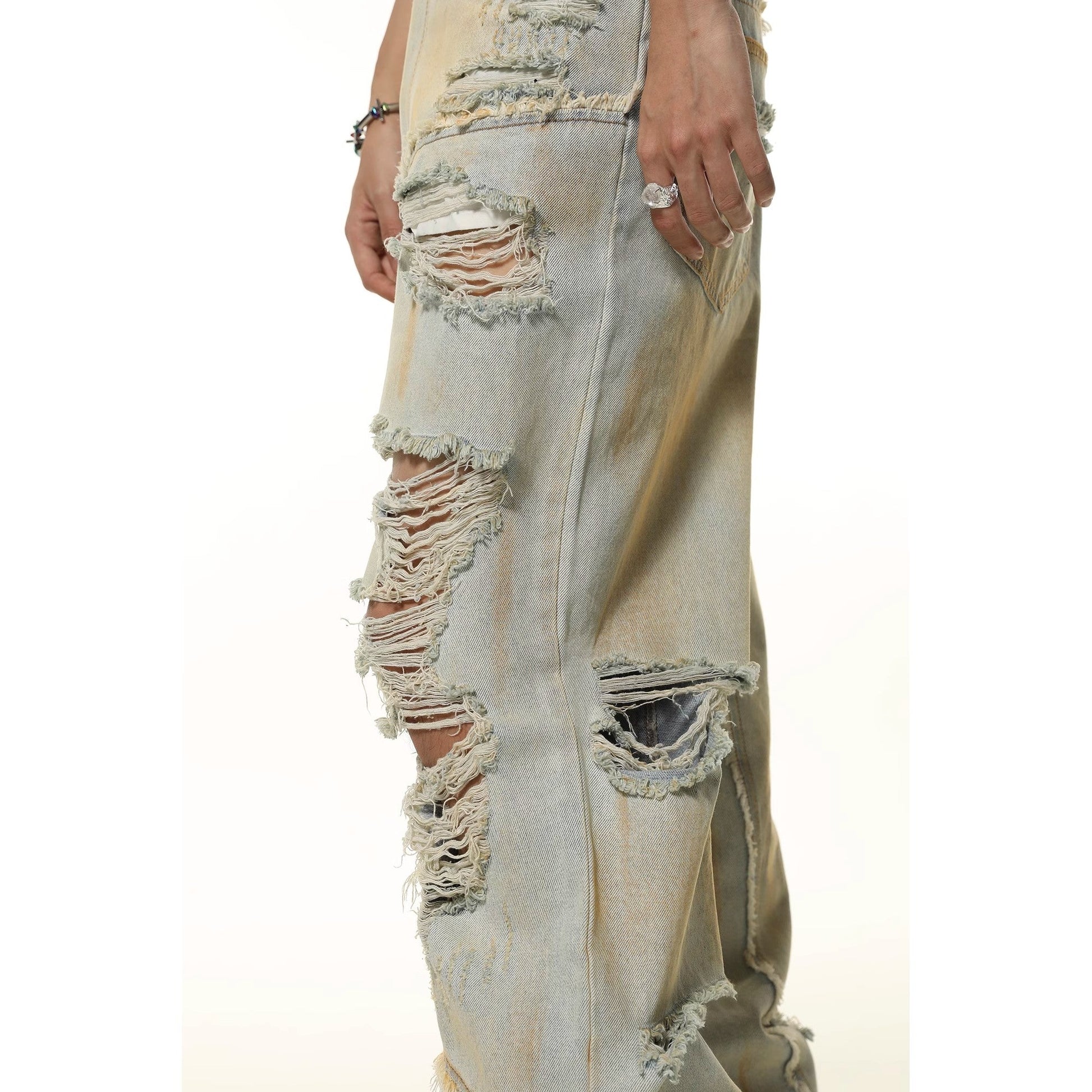 These Apocalyptic Shred Denim jeans feature a distressed design for a bold and edgy look. Made with high-quality denim. these jeans provide both style and durability. Perfect for those who want to make a statement with their fashion choices.