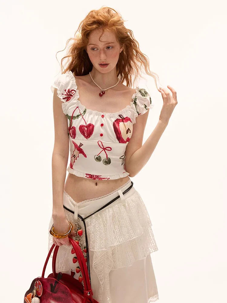 A sweet statement for summer days. This apple and cherry print crop top is all about playful nostalgia with a flirty twist. It features a ruched bust. cap sleeves with ruffles. and a fitted waist for that ultra-coquette silhouette. Whether you're off to a picnic or brunch with the girls. it's a dreamy pick.