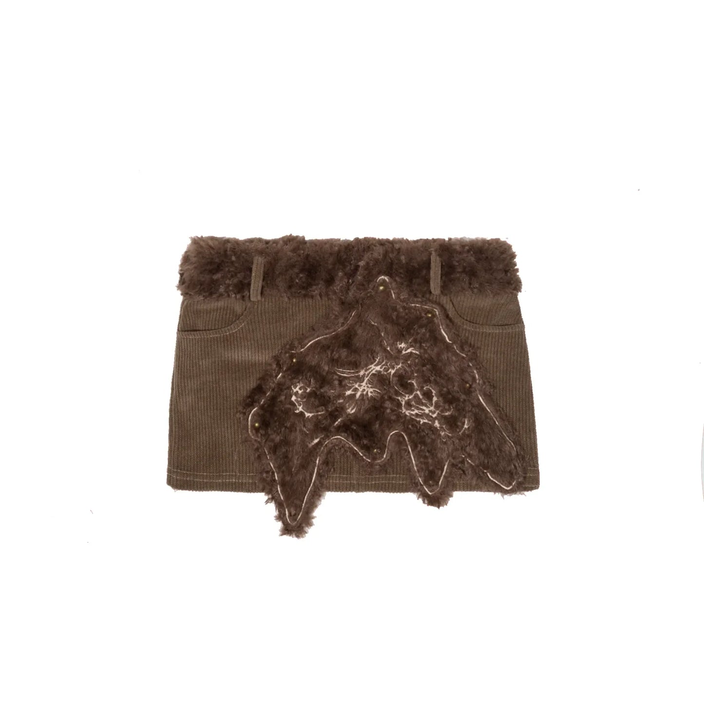 Unique corduroy mini skirt featuring an eye-catching faux fur embellishment. Available in two color variants: rich brown and soft cream. The base skirt is made of ribbed corduroy fabric with a short. fitted silhouette. The standout element is a large. asymmetrical faux fur patch on the front. shaped like an abstract bat or leaf.