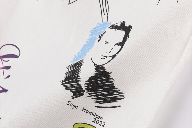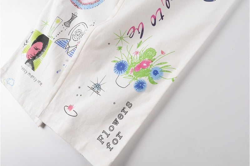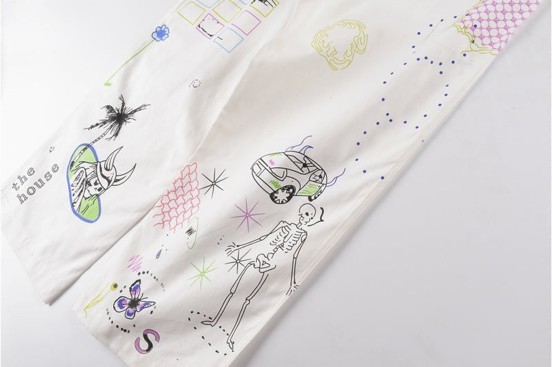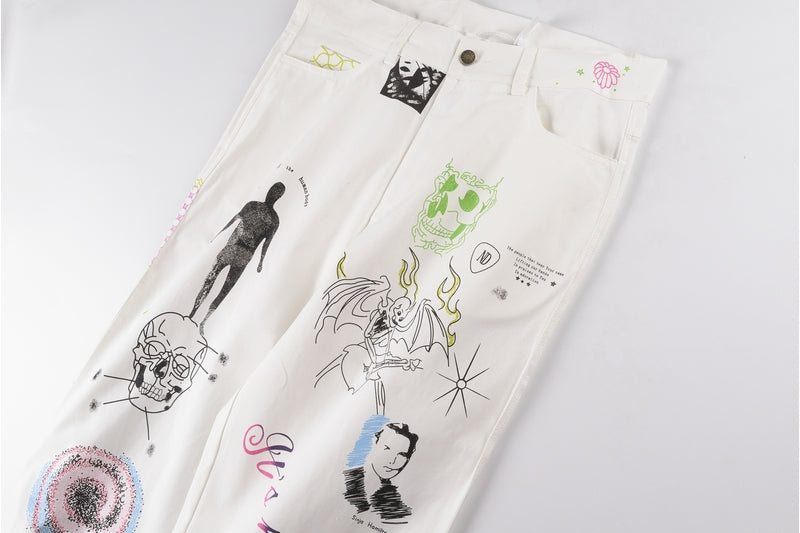 Off-white wide-leg jeans covered in colorful hand-drawn style artwork. Features an eclectic mix of illustrations including skulls. figures. abstract shapes. and text. The diverse doodles create a playful. artistic collage effect. Combines casual denim with expressive art for a bold. individualistic statement piece.