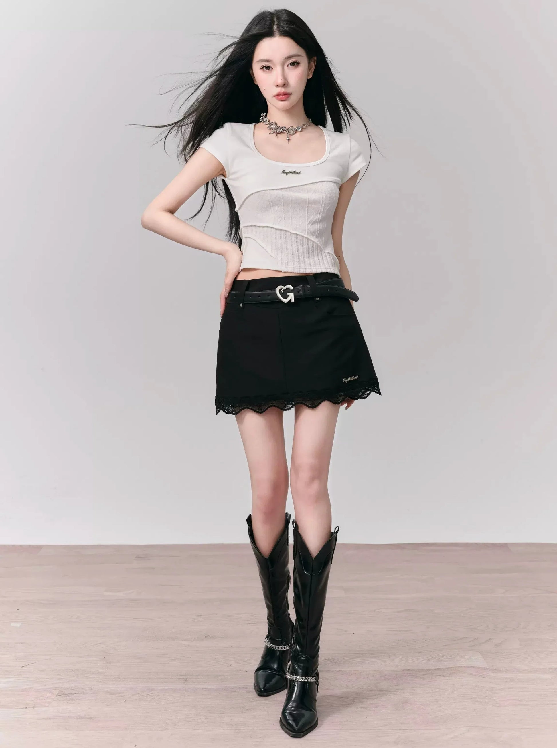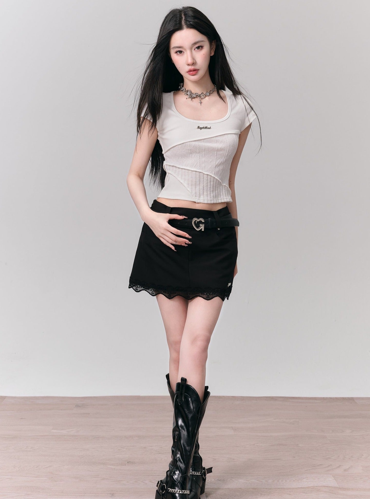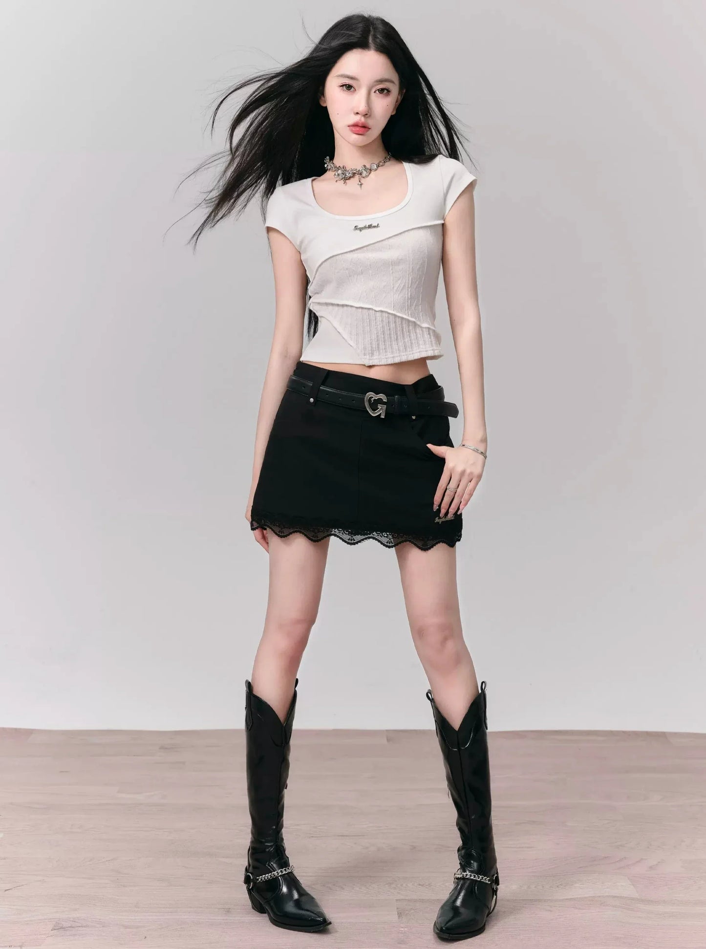 Asymmetric Layered Cropped Tee - White Ribbed Texture Short Sleeve Top