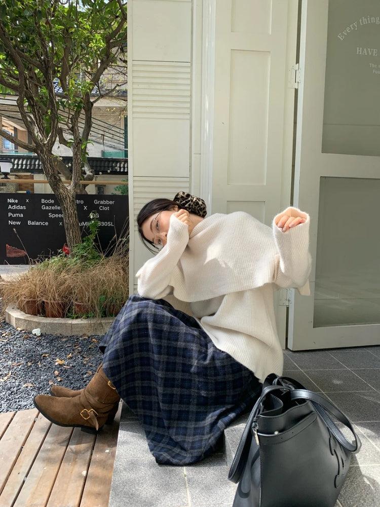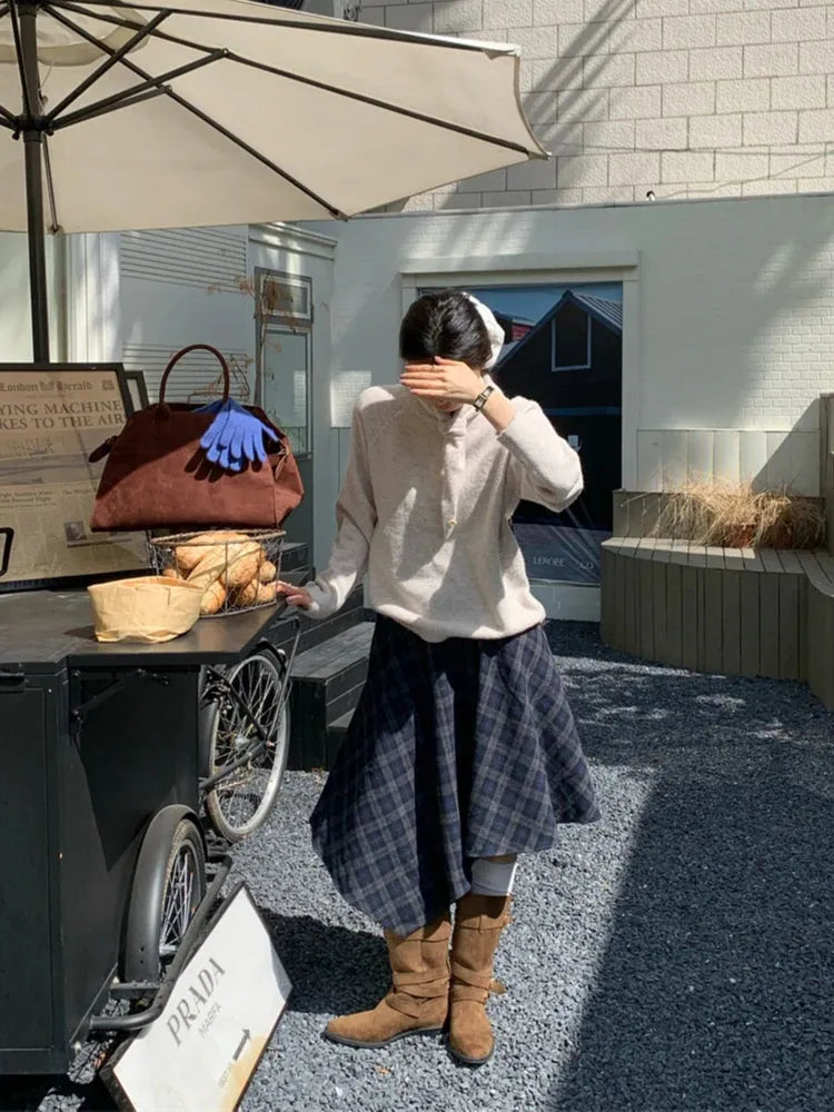 Classic with a twist—this plaid midi skirt features an elegant asymmetric hem that adds movement and personality to a timeless silhouette. Crafted in a cozy woven fabric. it's perfect for layering with knits and boots for that effortless academic or vintage-inspired look.