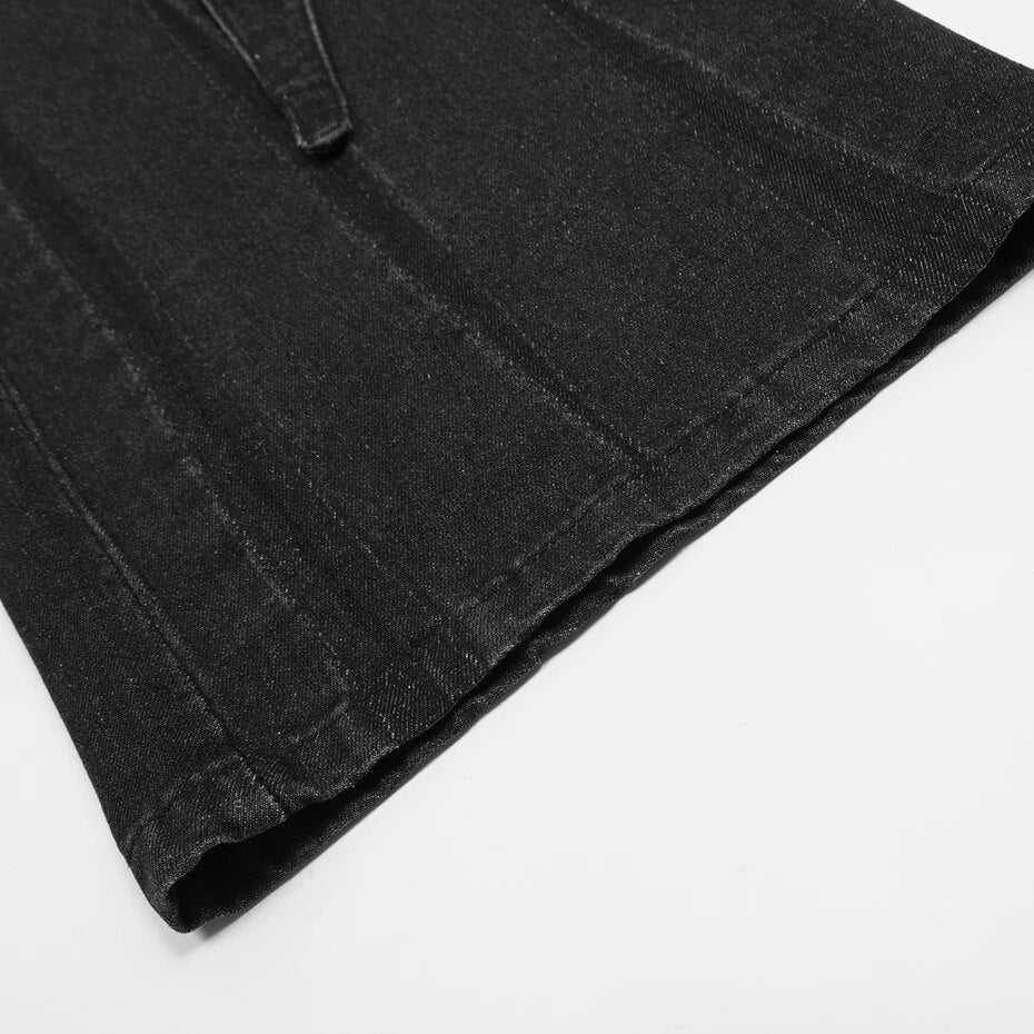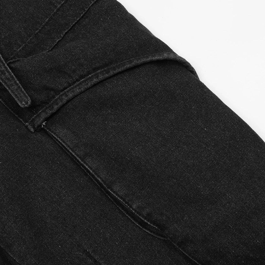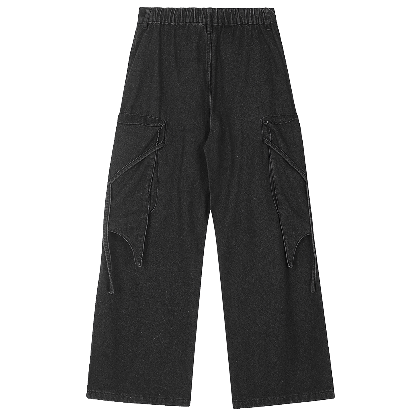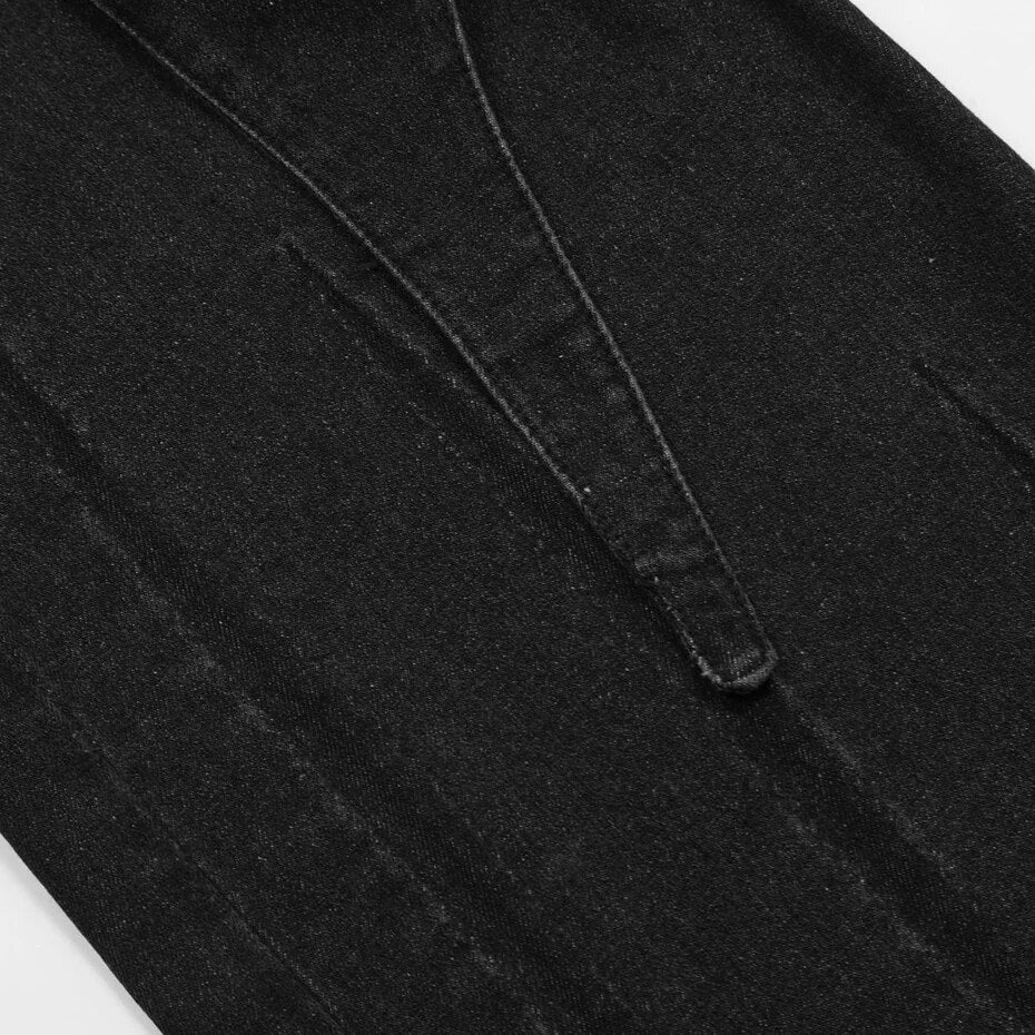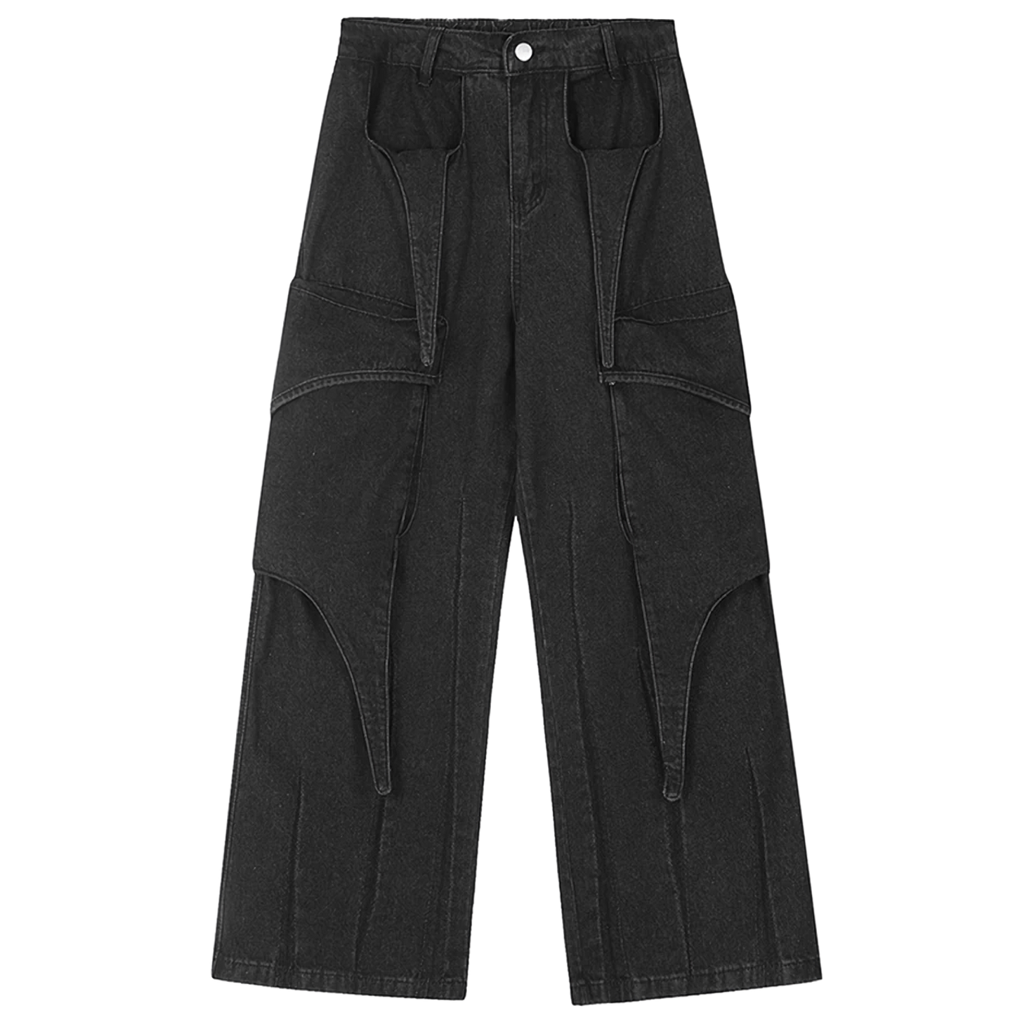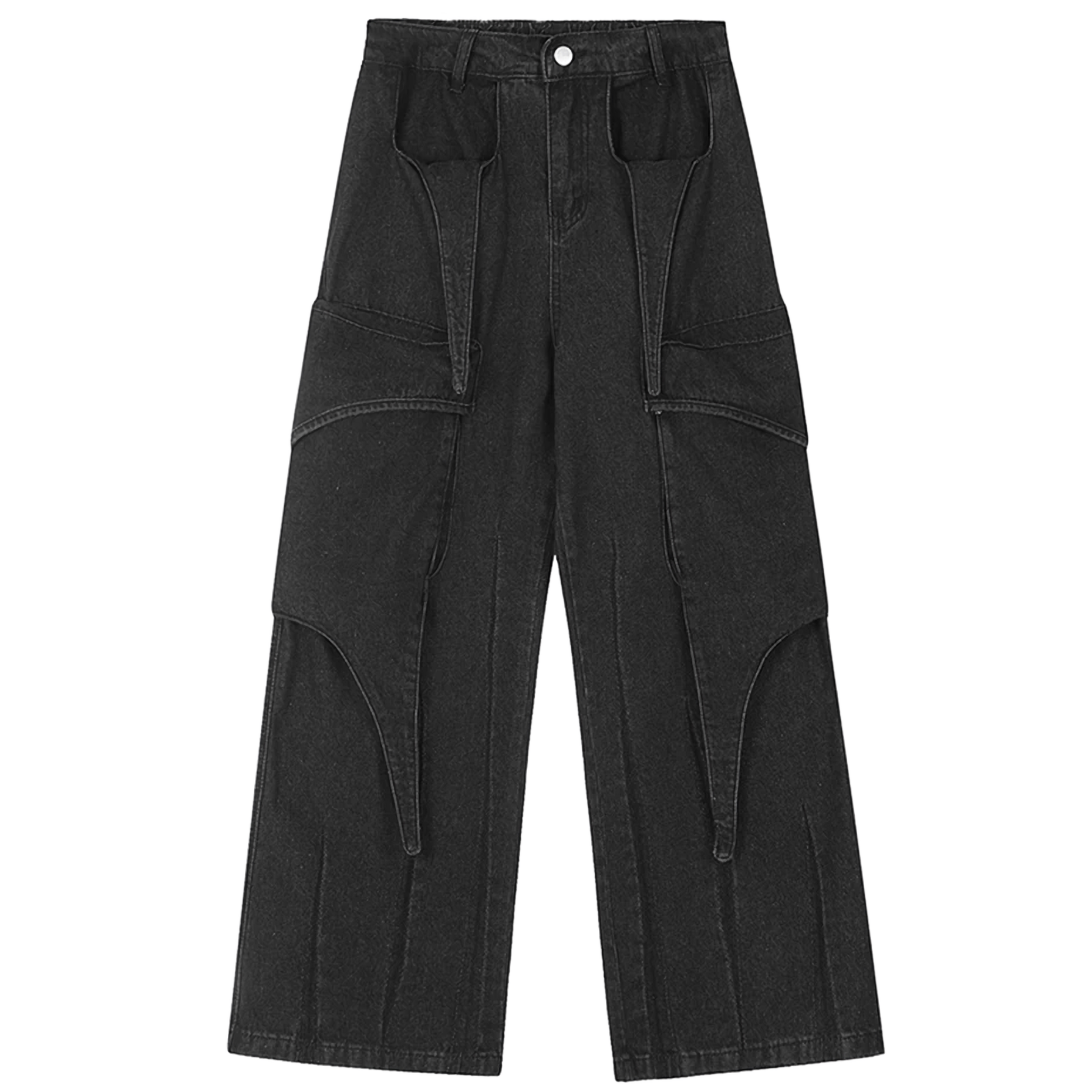 Black wide-leg jeans with unique curved seam detailing. Features elongated pocket designs that extend down the legs. creating a striking architectural effect. Combines high-fashion elements with classic denim for a bold. sculptural look. Perfect for those seeking a statement piece that blends avant-garde design with everyday wearability. Ideal for fashion-forward individuals who appreciate innovative garment construction.