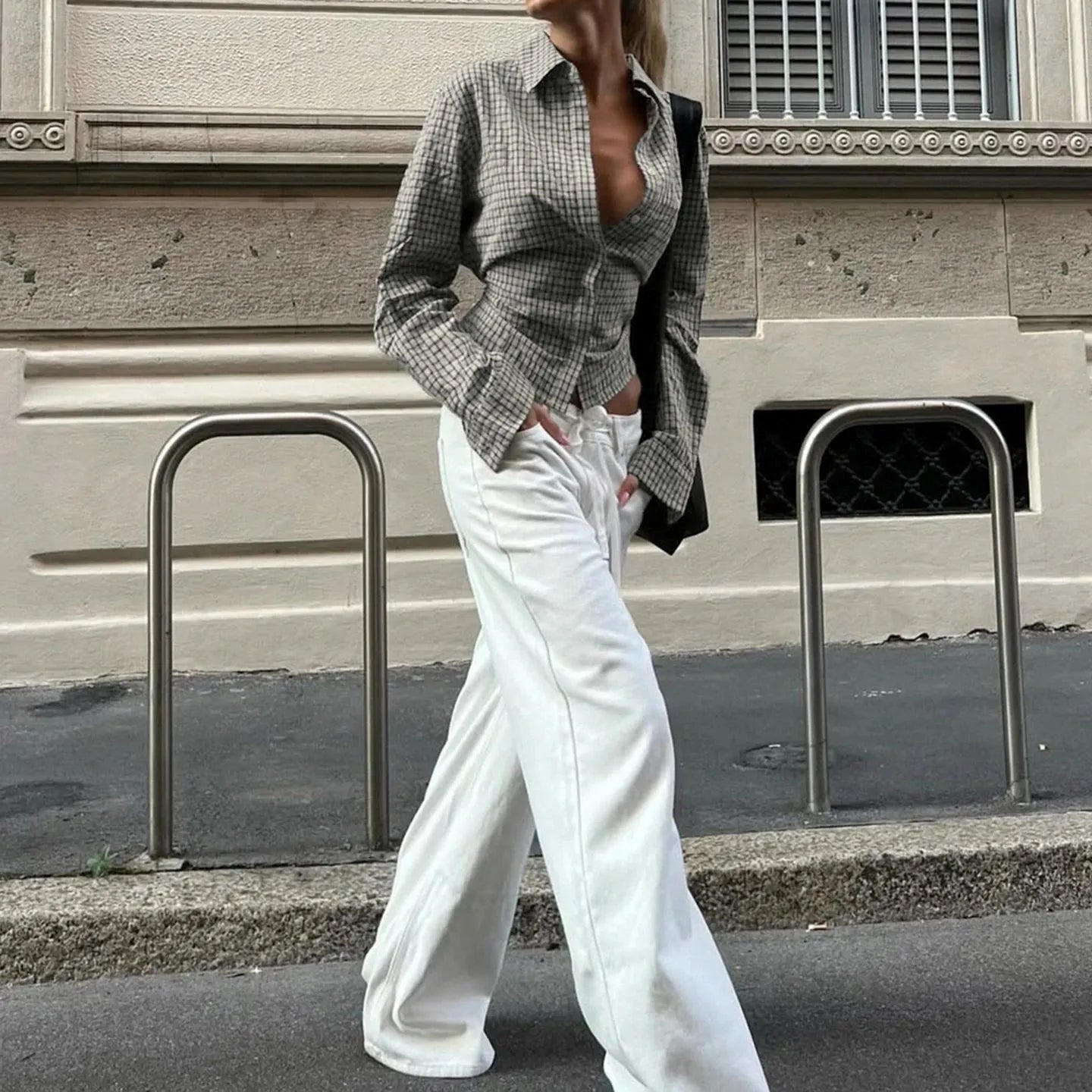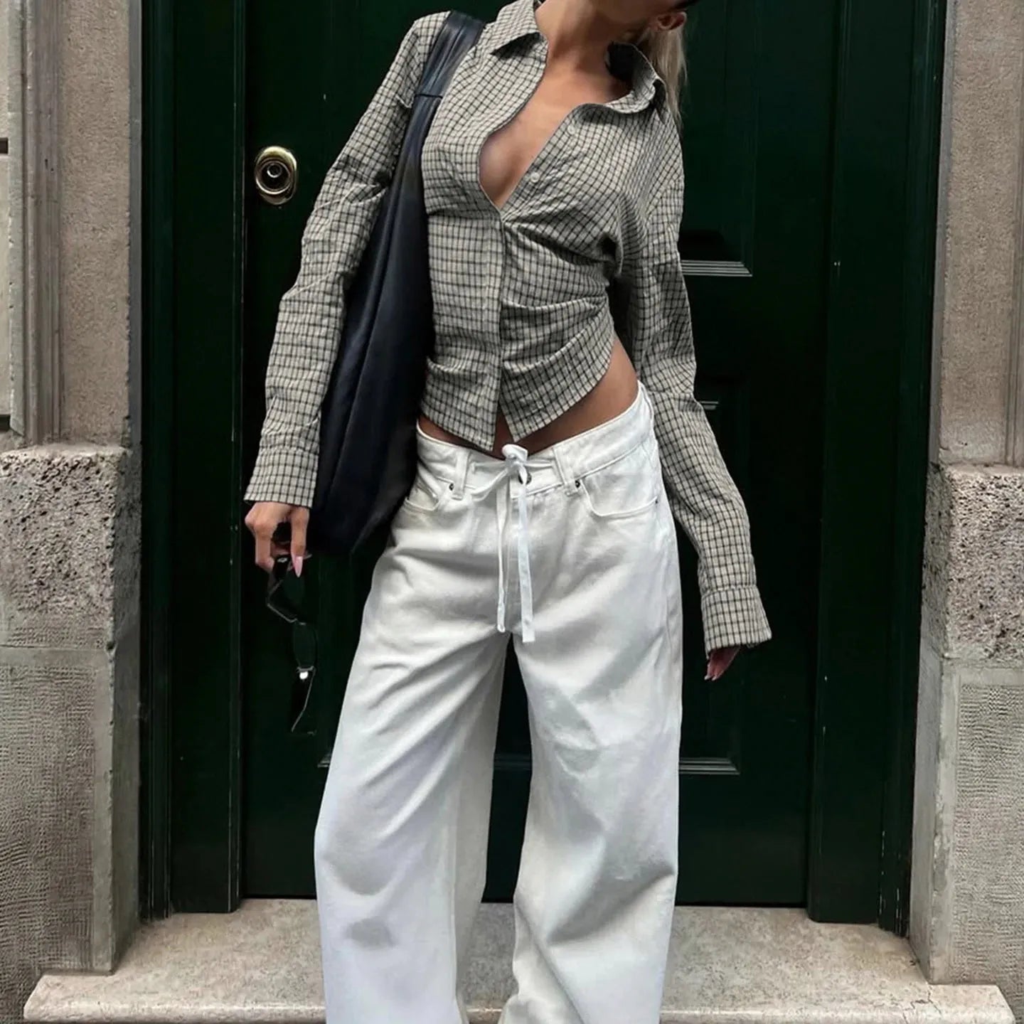 Office siren energy meets off-duty cool. The back tie plaid shirt brings a tailored front with a seductive edge. Fitted at the waist with a daring neckline and wrap-around detail that ties at the back. it's the shirt for girls who make rules. not follow them.