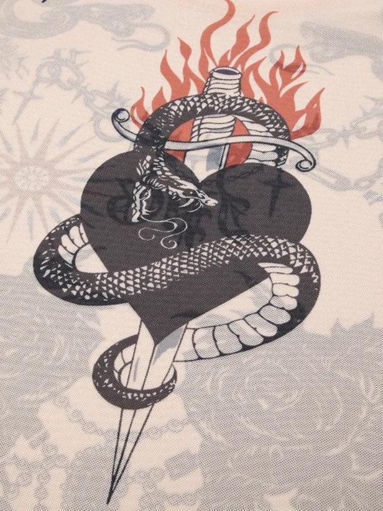 - Tattoo print details: heart. snake. stripes. sun. sword. barbed chain. flame. roses. stones. flowers. lightning. leaf. jewelry