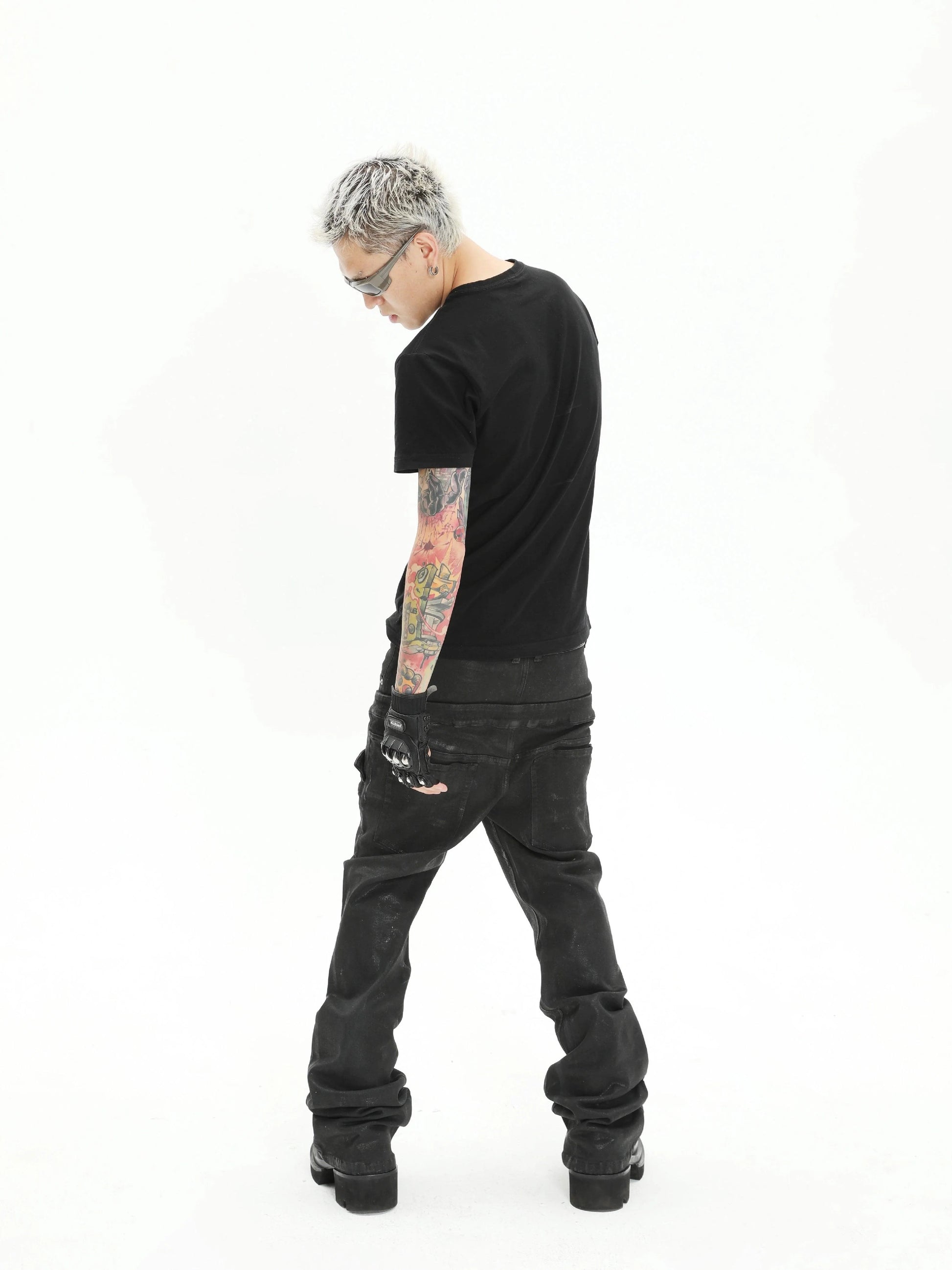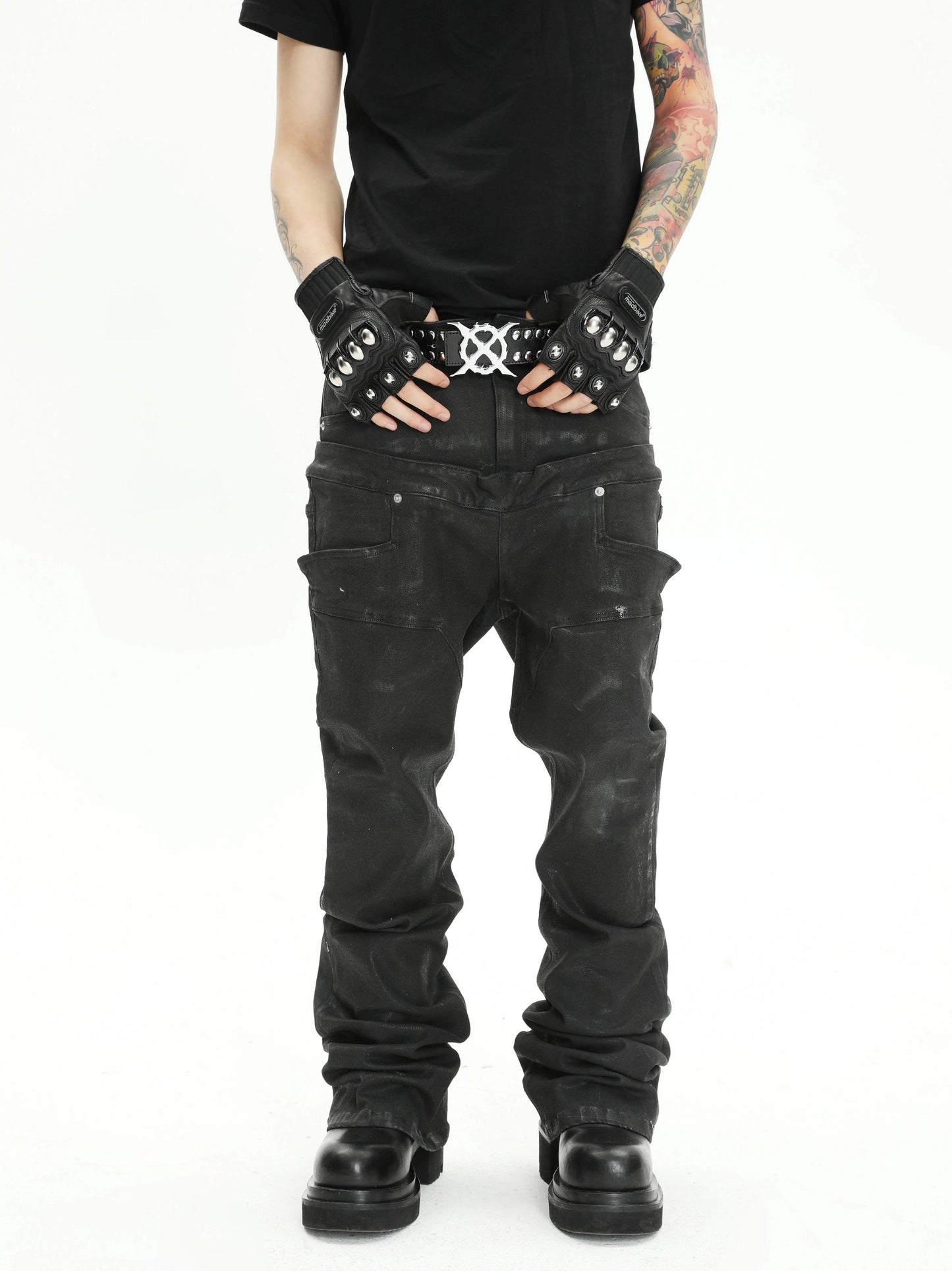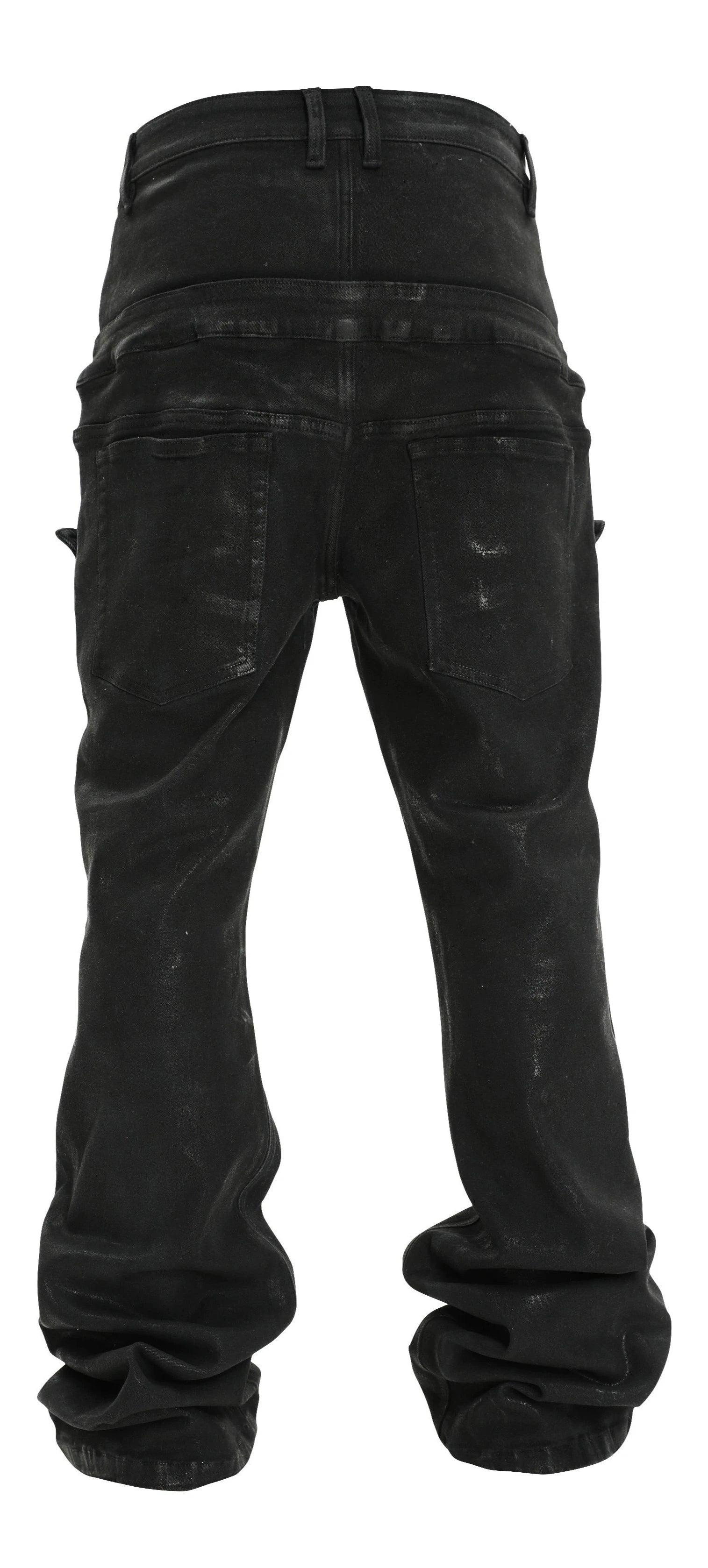 Fabric Information: Stretch denim. Hand-waxed finish. double waist pocket design. GMK slight flare pants style