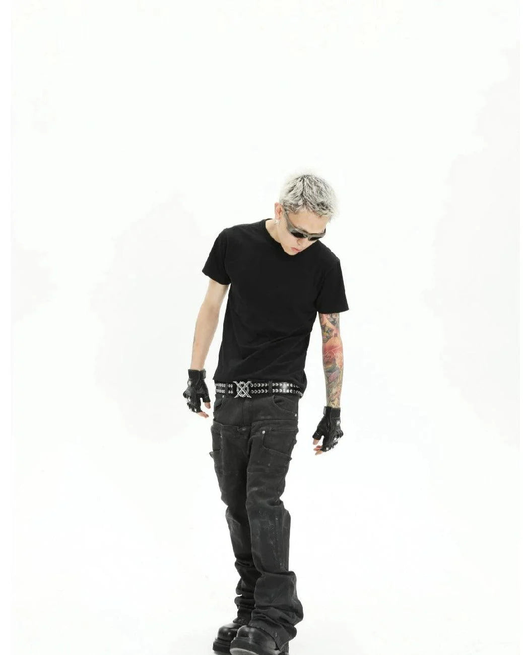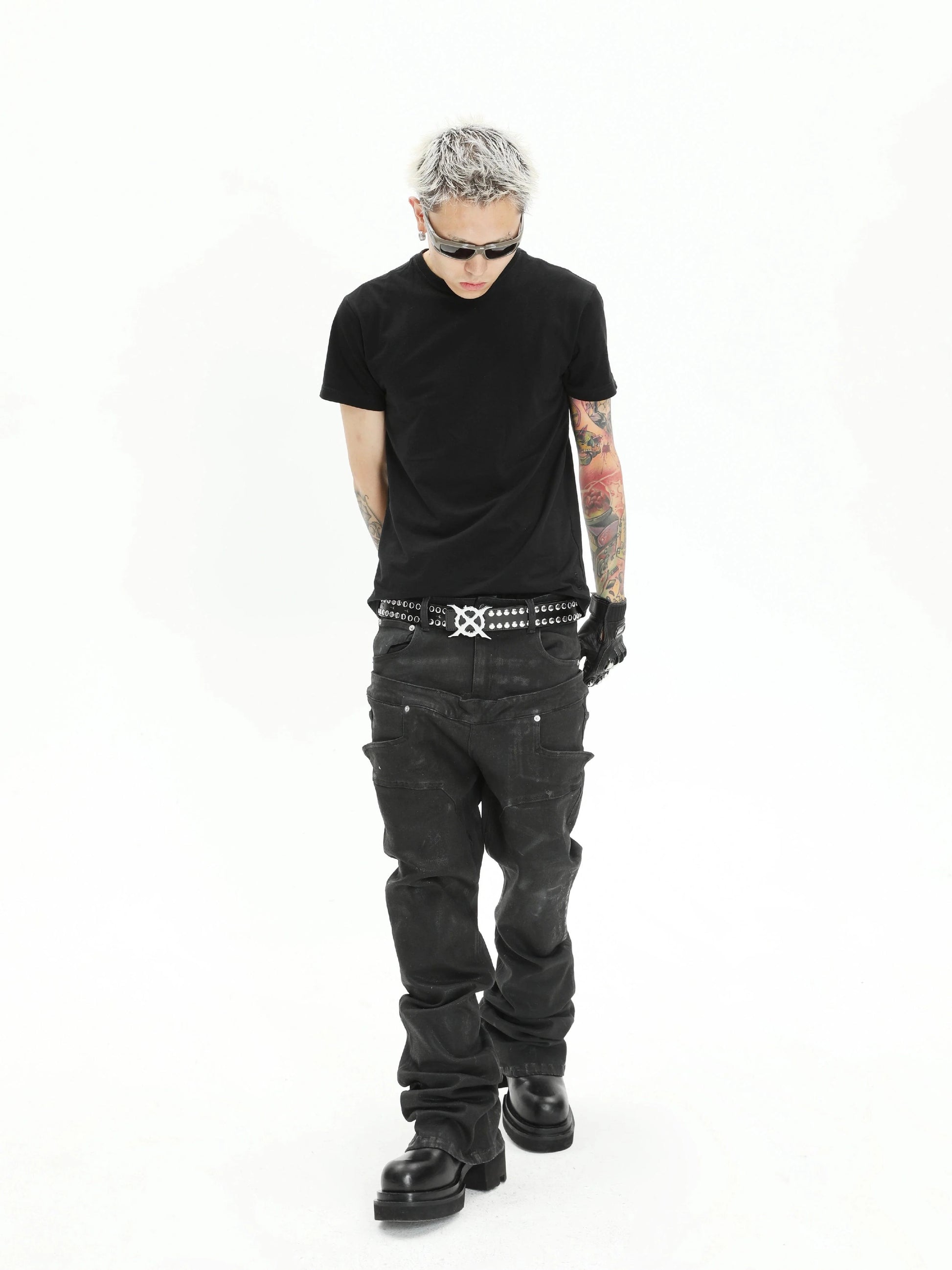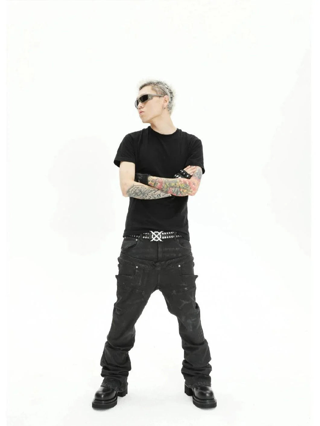 Fabric Information: Stretch denim. Hand-waxed finish. double waist pocket design. GMK slight flare pants style