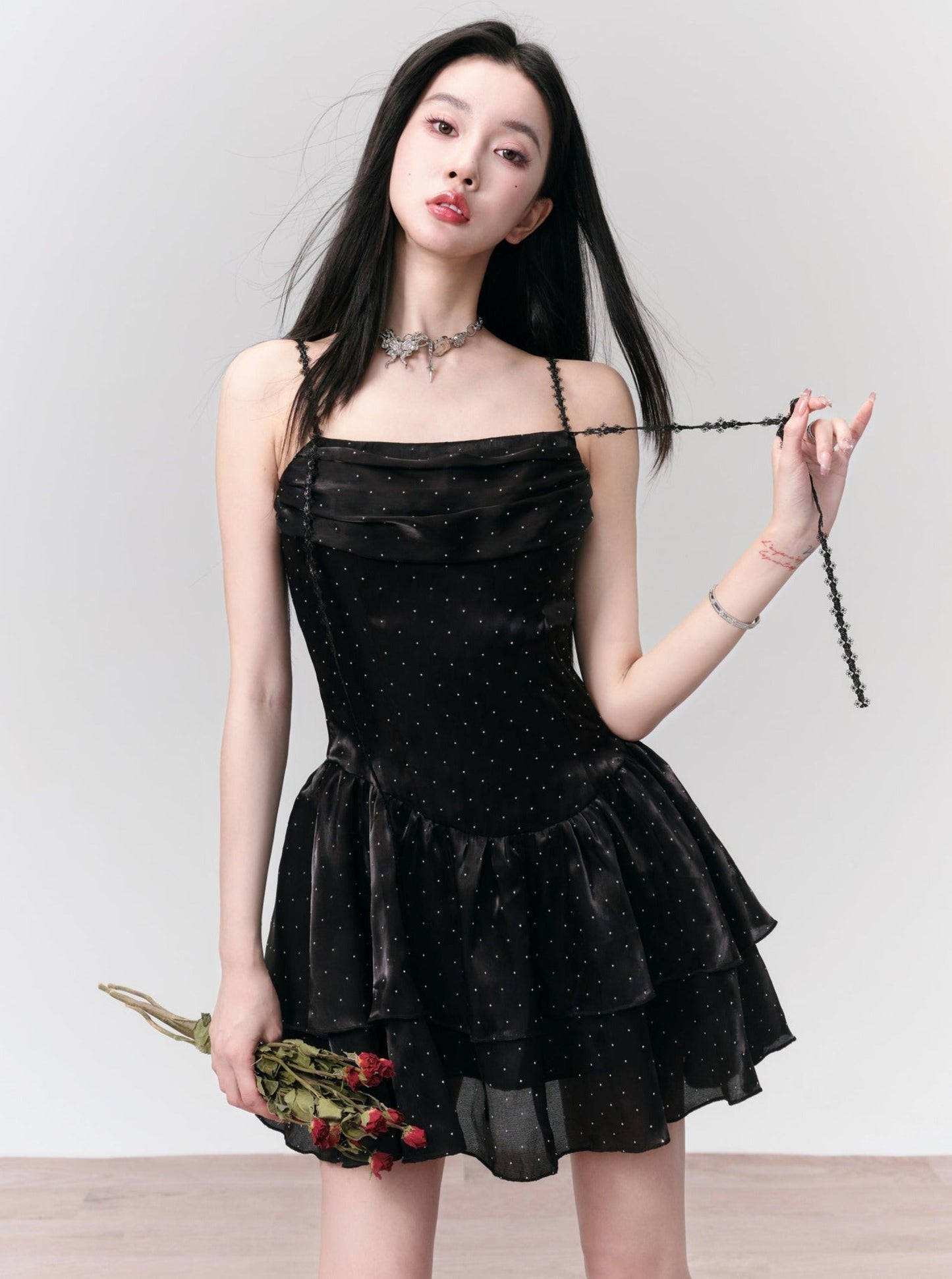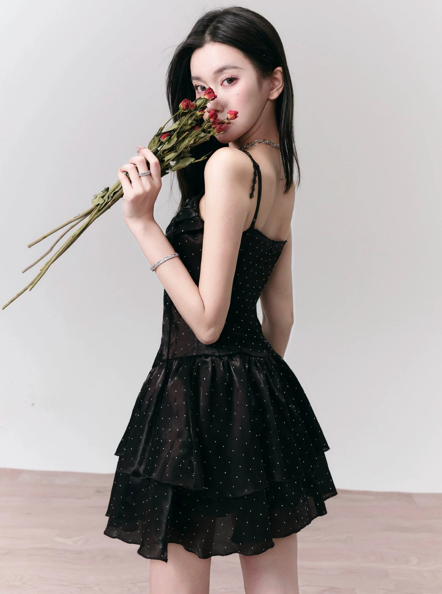Black Velvet Spaghetti Strap Tiered Mini Dress