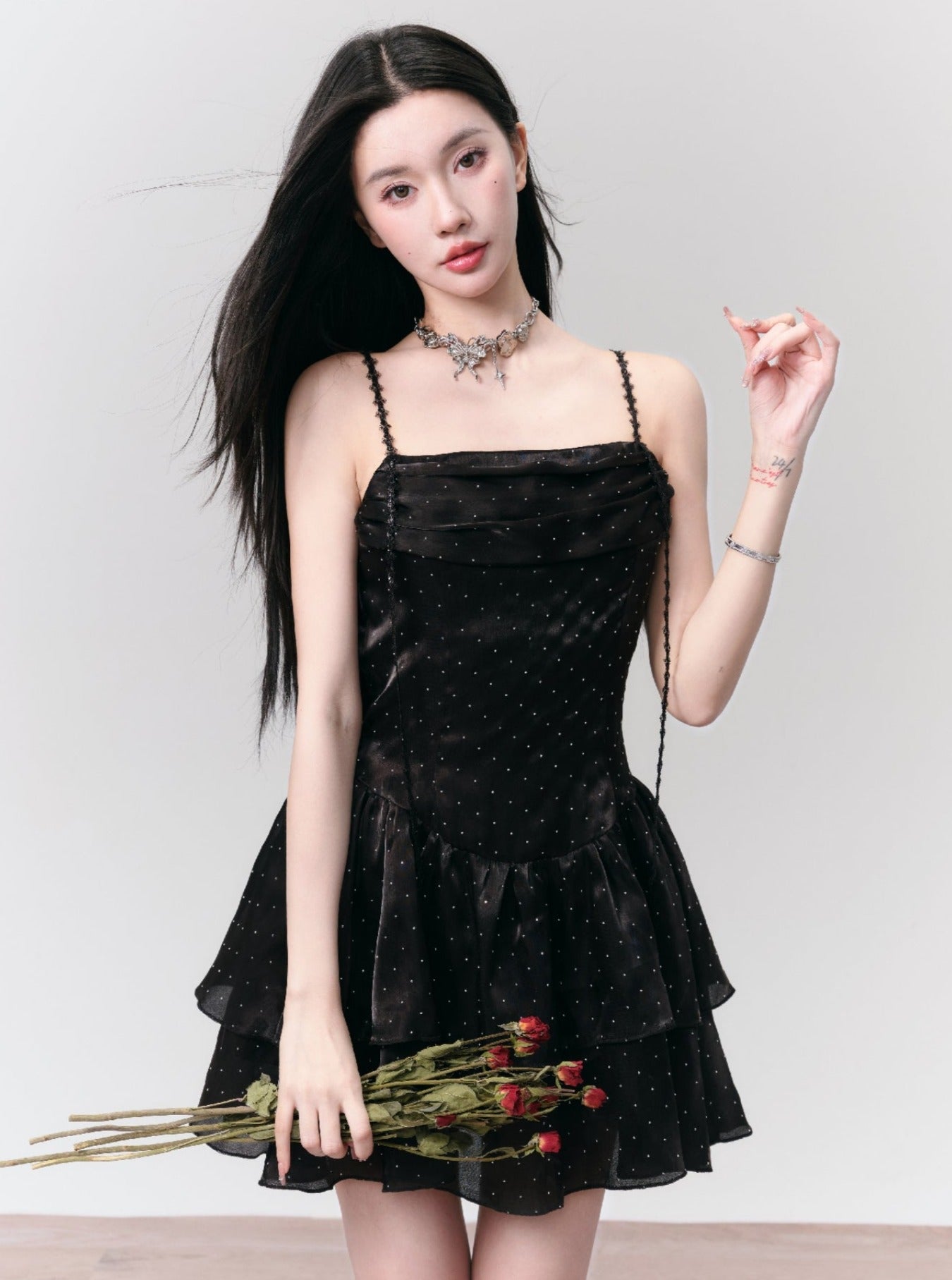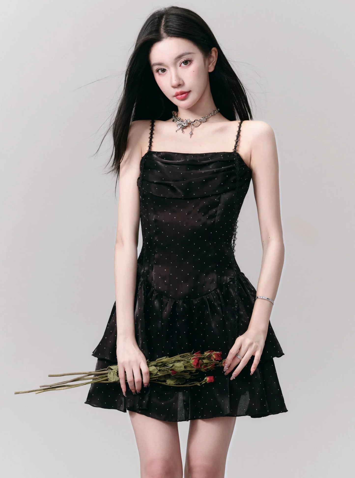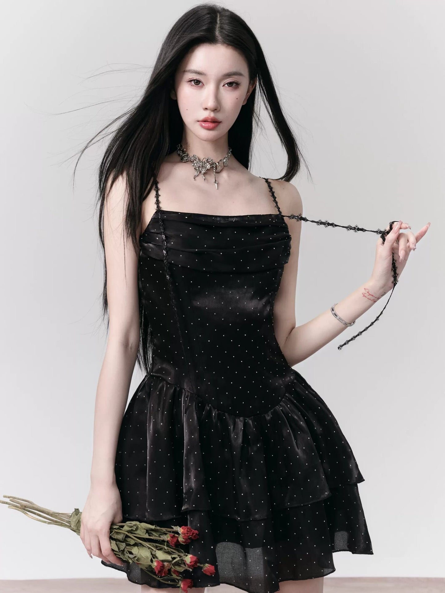 Crafted from luxurious black velvet. this mini dress features delicate spaghetti straps and a tiered design that adds movement and dimension to your look. With its elegant yet flirty style. this dress is perfect for any special occasion. Bring sophistication and glamour to your wardrobe with this must-have piece.