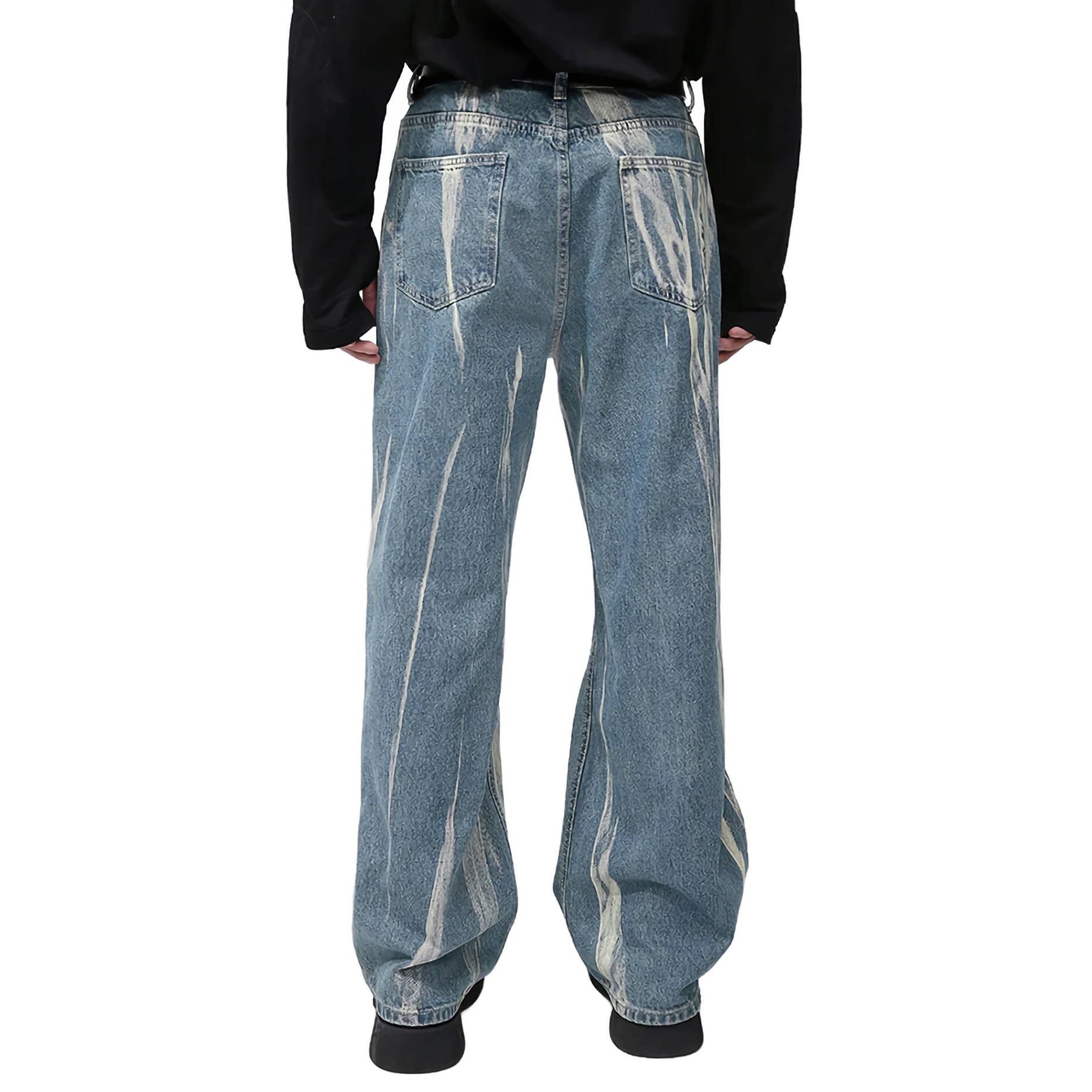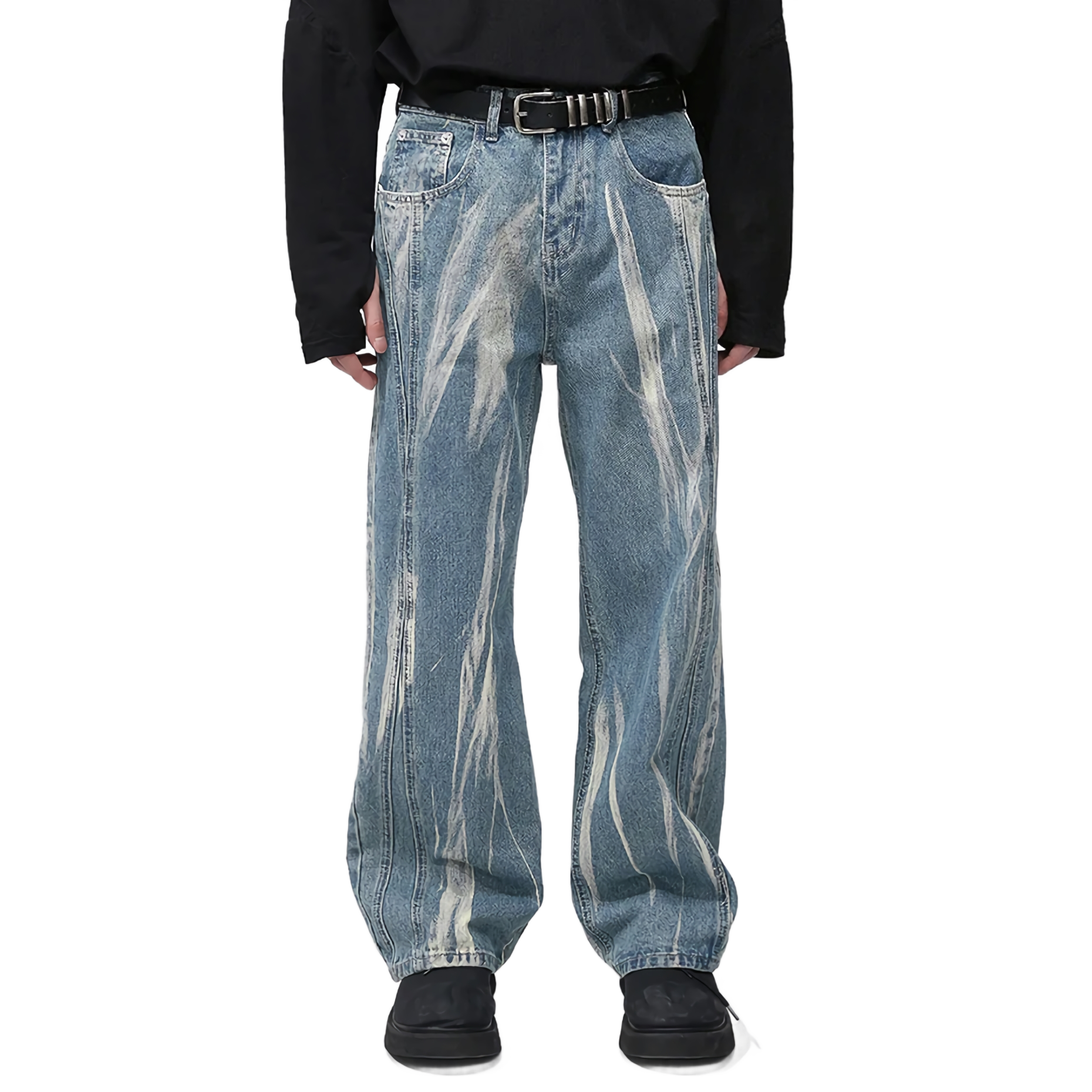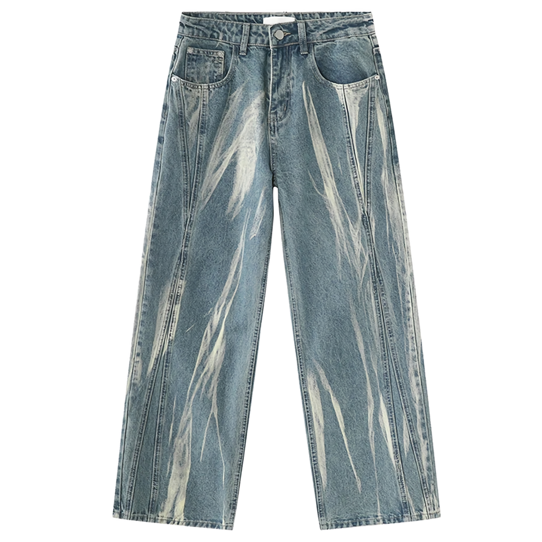 Make a statement with our Bleached Lightning Wide-Leg Jeans. These eye-catching denim pants feature a unique bleached pattern resembling streaks of lightning against a classic blue jean backdrop. The wide-leg silhouette offers a comfortable. relaxed fit with a trendy 90s-inspired look. Perfect for fashion-forward individuals. these jeans combine vintage aesthetics with modern style. Ideal for casual outings or creating a bold street-style ensemble that's sure to turn heads.