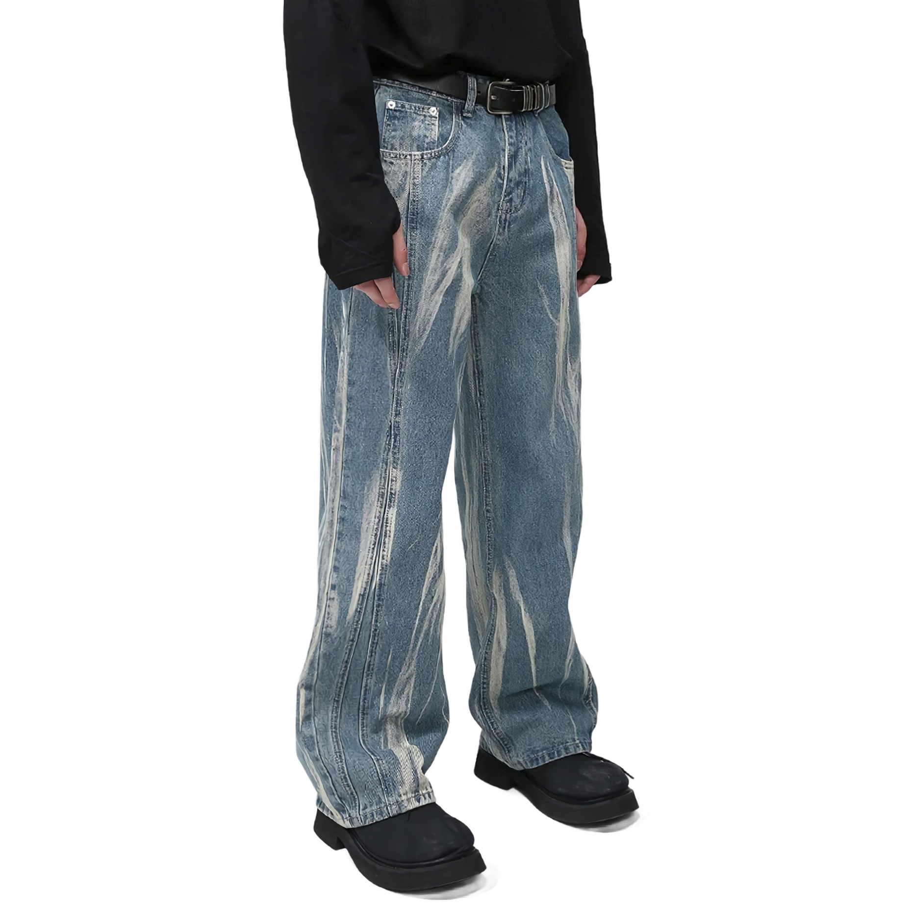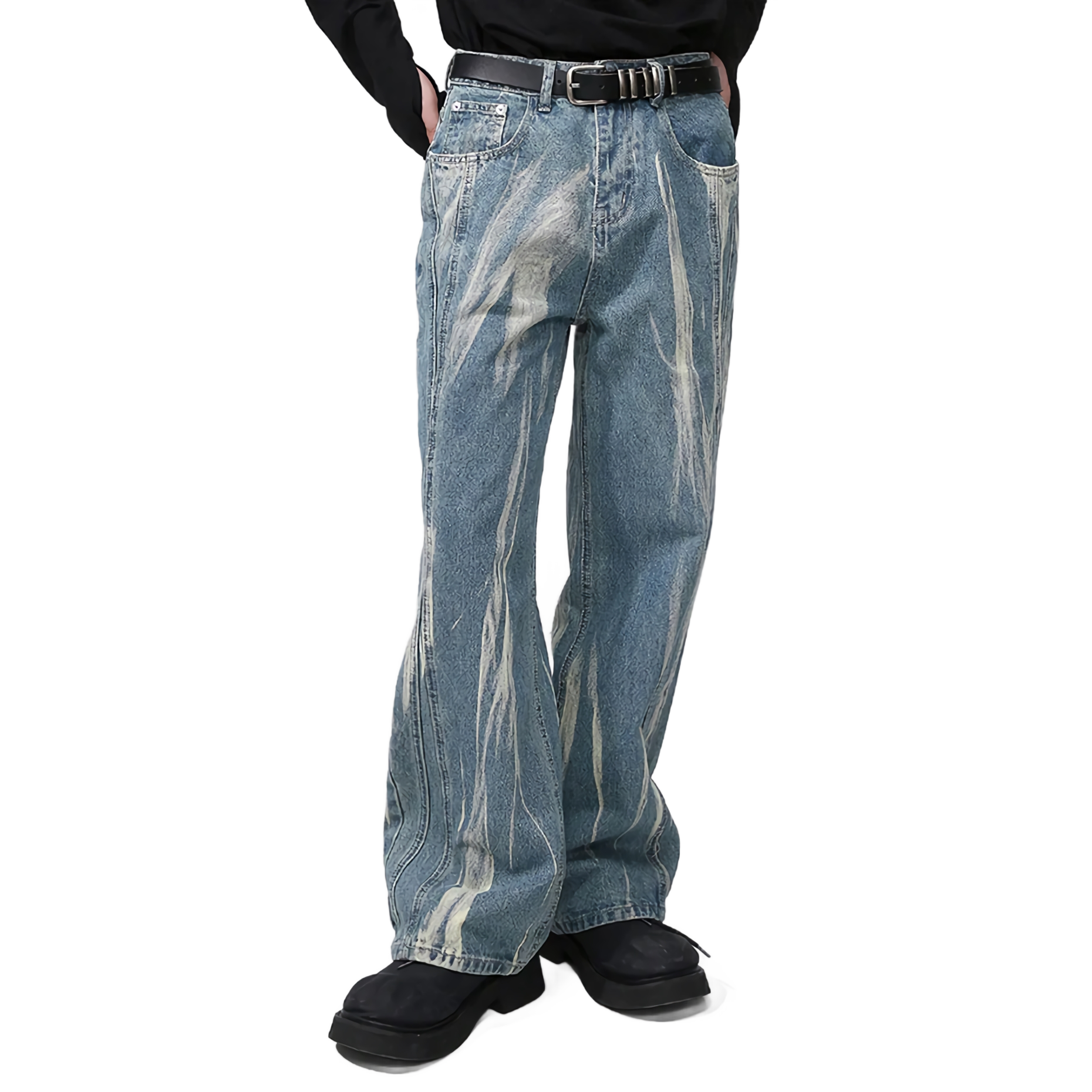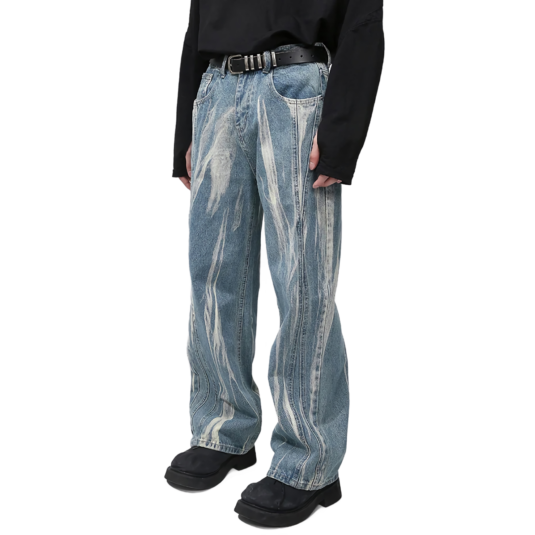 Make a statement with our Bleached Lightning Wide-Leg Jeans. These eye-catching denim pants feature a unique bleached pattern resembling streaks of lightning against a classic blue jean backdrop. The wide-leg silhouette offers a comfortable. relaxed fit with a trendy 90s-inspired look. Perfect for fashion-forward individuals. these jeans combine vintage aesthetics with modern style. Ideal for casual outings or creating a bold street-style ensemble that's sure to turn heads.