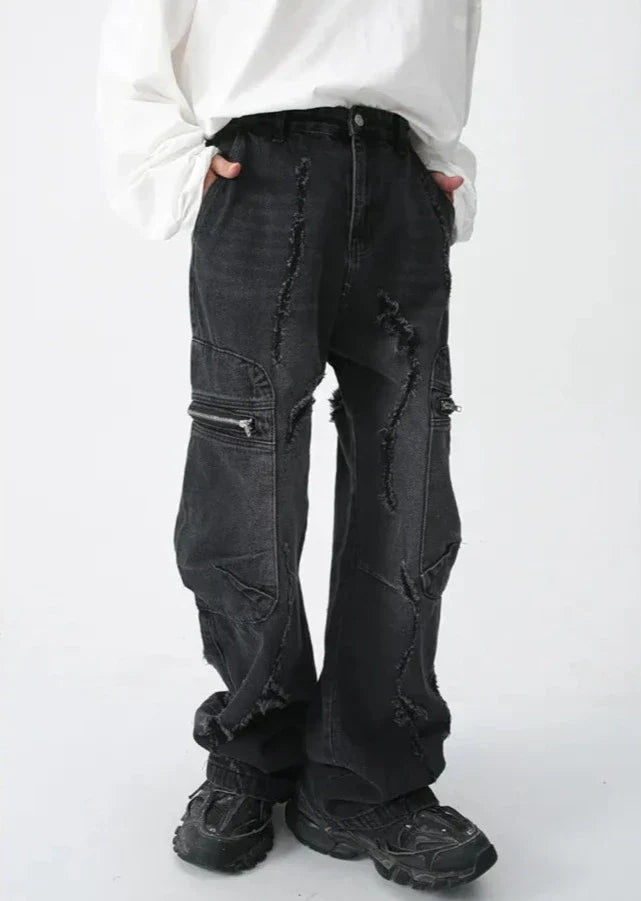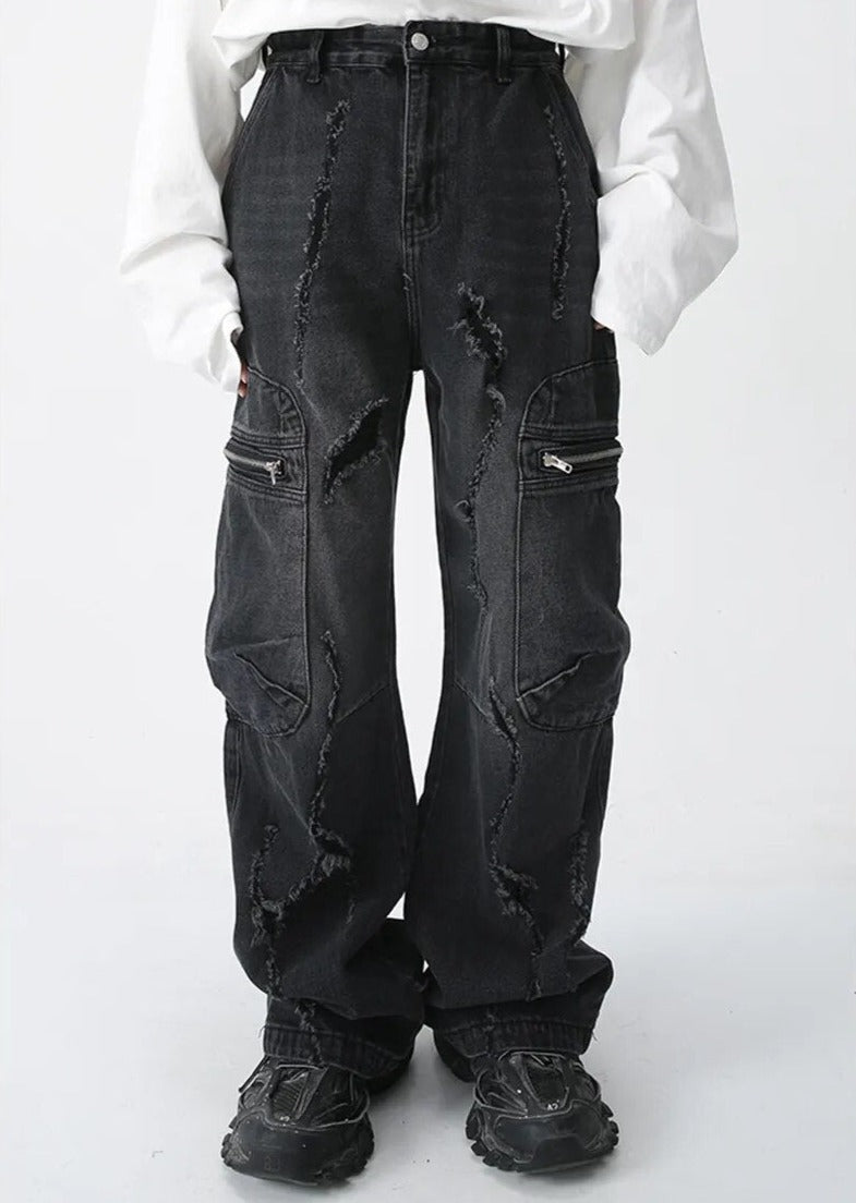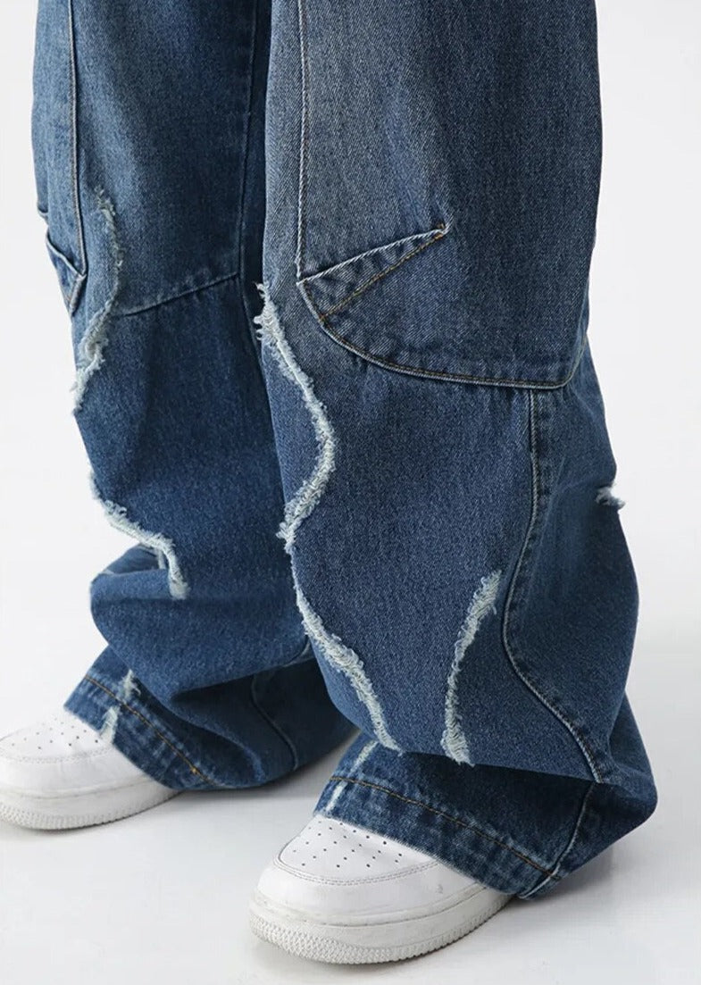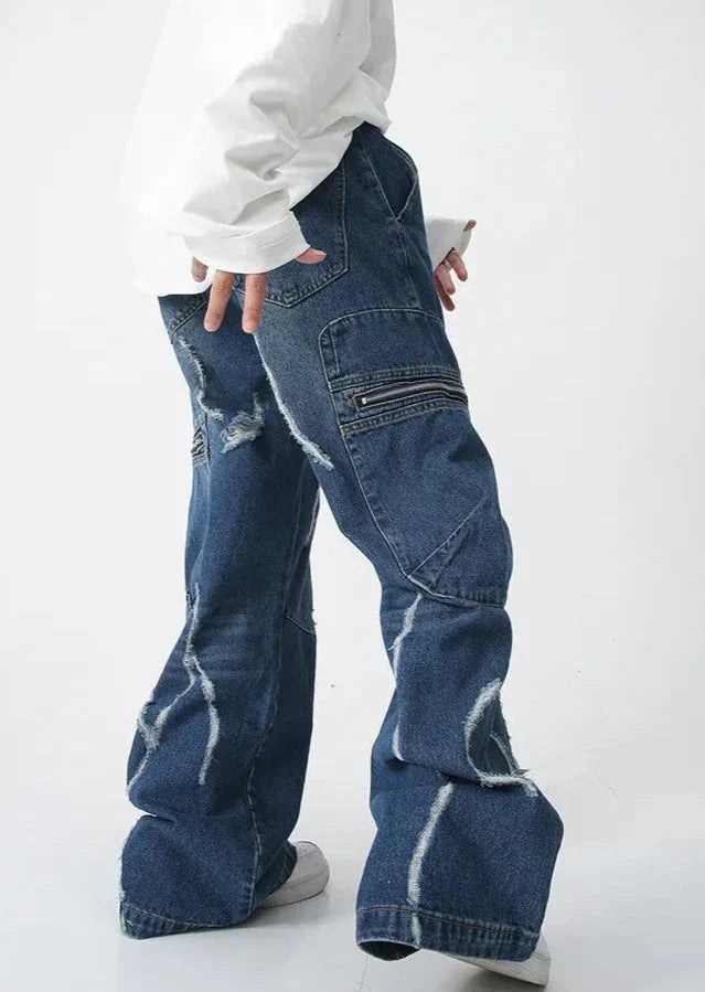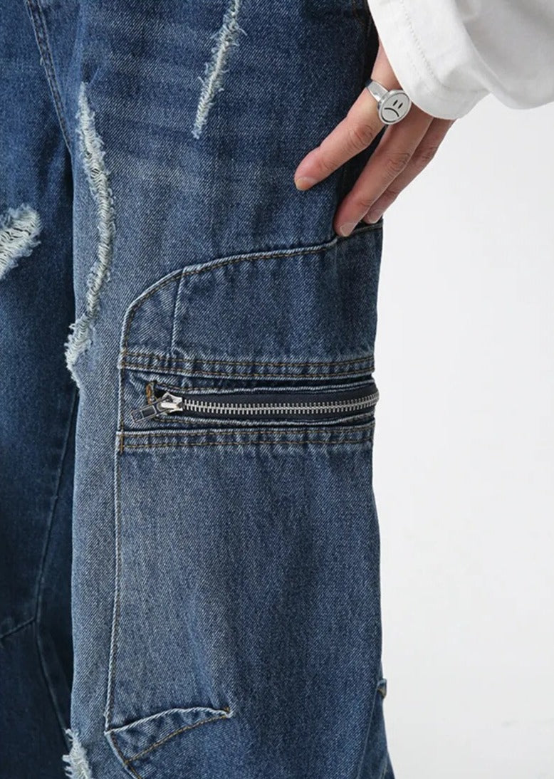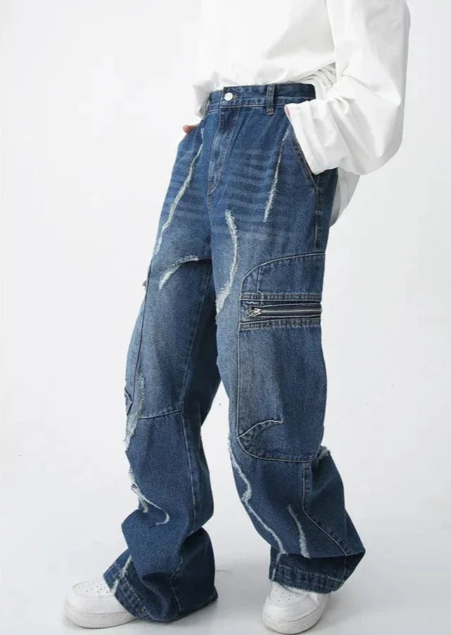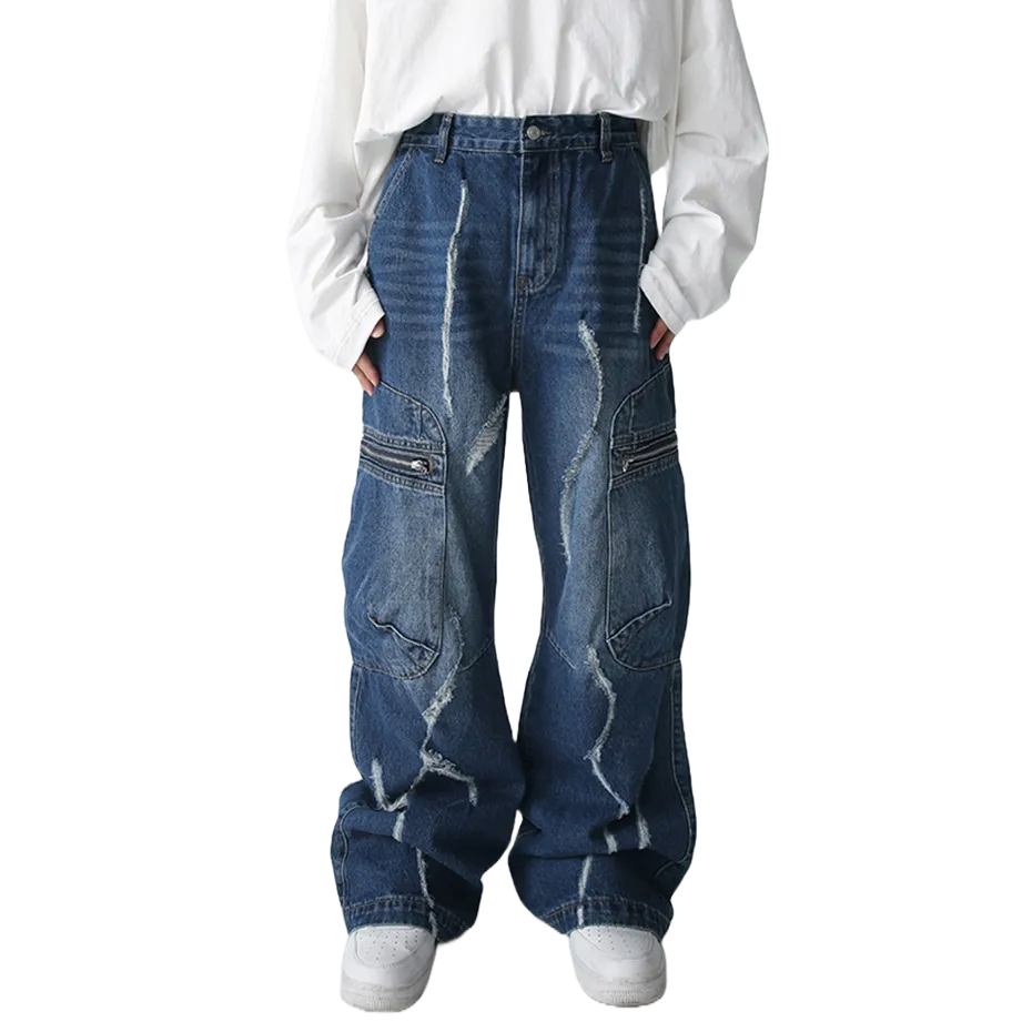 Make a statement with our Blue Distressed Cargo Wide-Leg Jeans. These eye-catching pants feature unique distressed patterns and practical zip pockets. The wide-leg cut offers a trendy silhouette. while the cargo-style design adds an edgy touch. Perfect for those seeking bold streetwear with functionality. ideal for casual outings or creating standout urban looks.