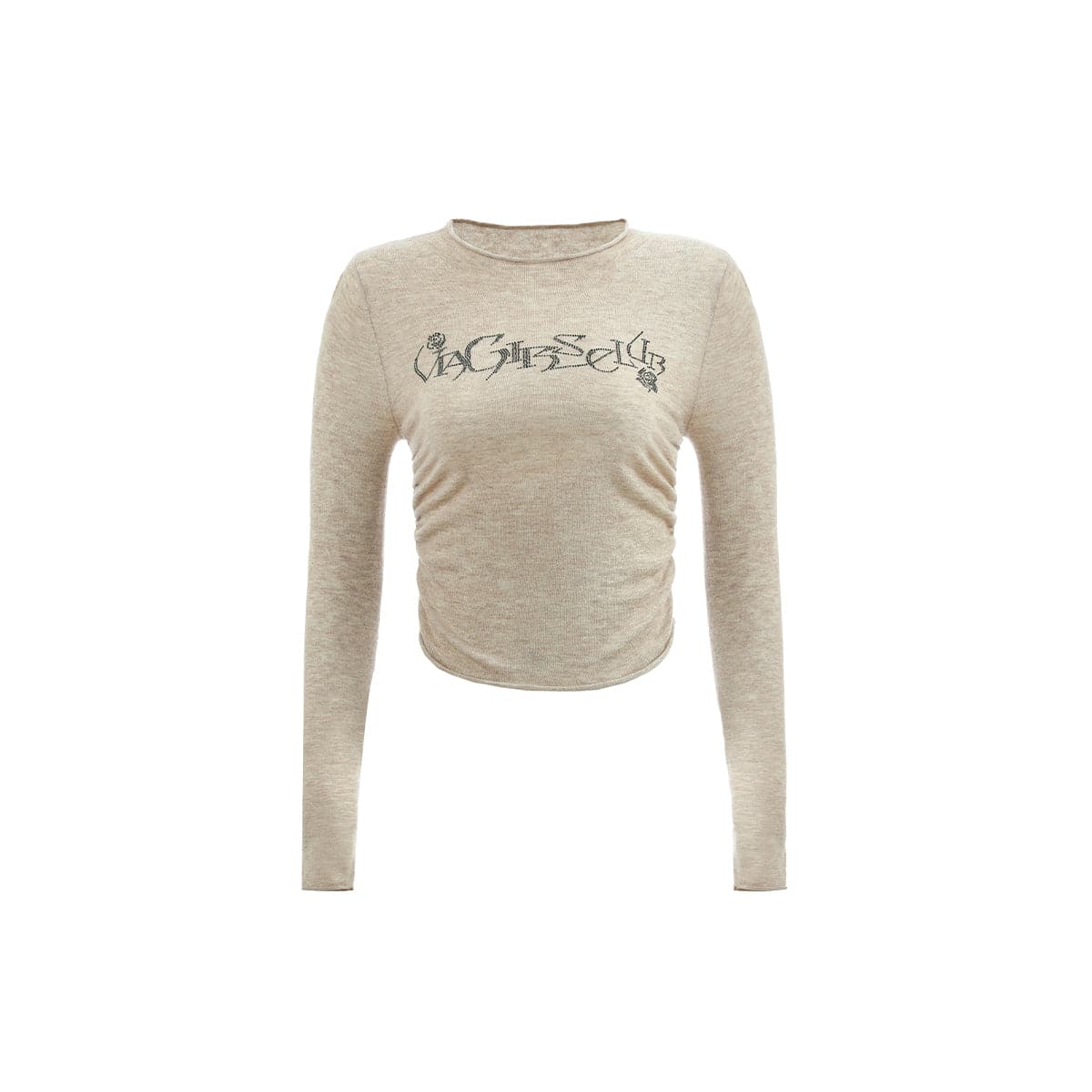 Via Pitti Crystal Logo Ruched Long Sleeve Top Brown