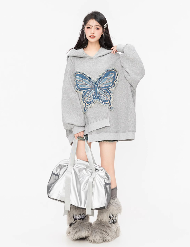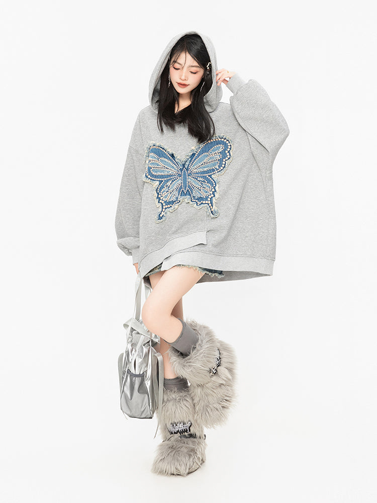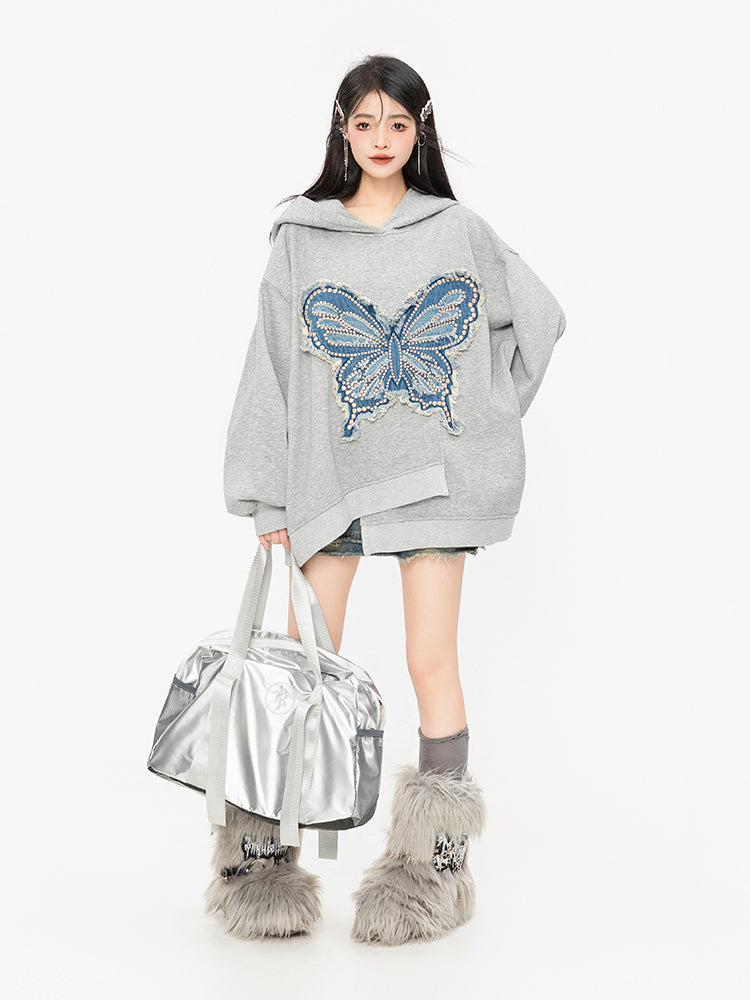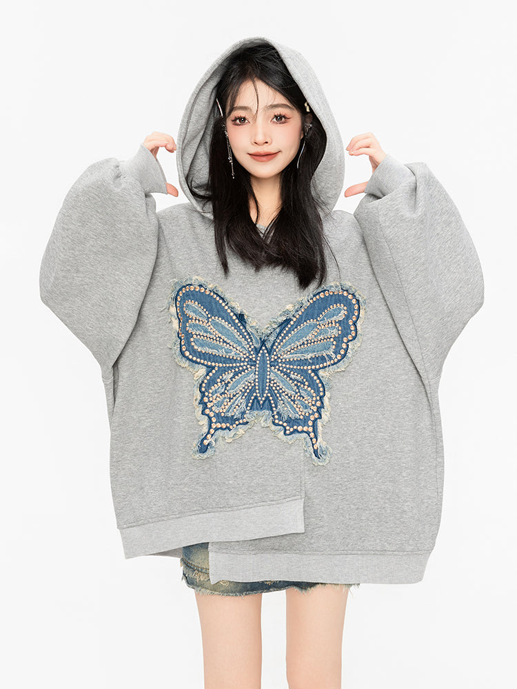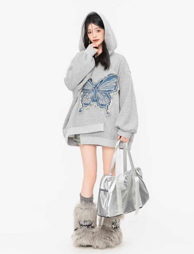 Experience comfort and style with our Butterfly Dream Oversized Hoodie. This gray hoodie features a striking blue butterfly design on the front. perfect for those who want to make a statement. The oversized fit and extra-long sleeves provide maximum comfort and a trendy look. Available in sizes S to XL to suit various body types.