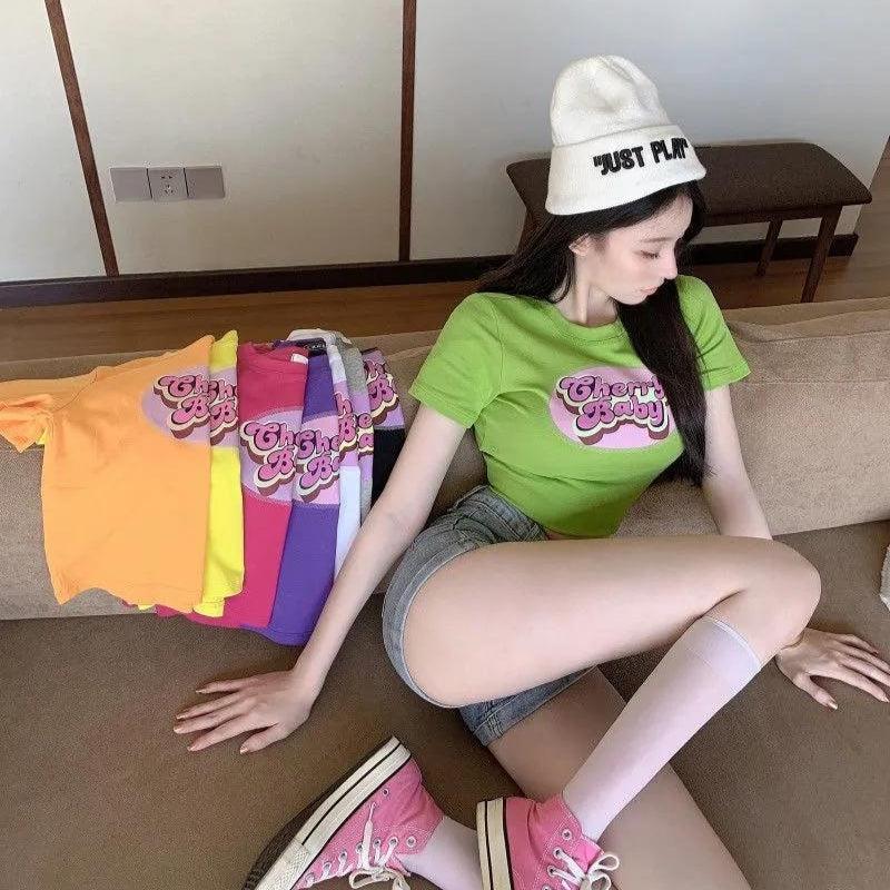 Spice up your wardrobe with this colorful graphic Cherry Baby Crop Top. Its polyester. slim-fitting design with short sleeves is a playful addition to any trendy outfit. Perfect for those who love a touch of whimsy.