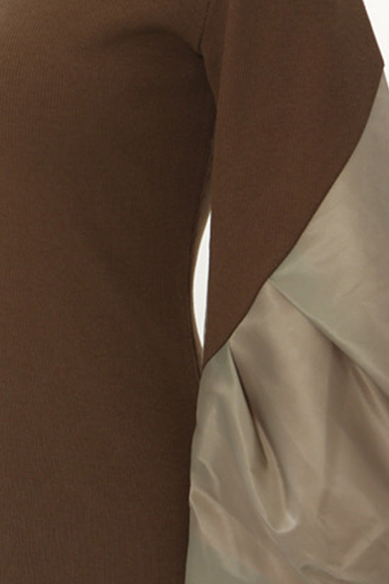 Enjoy minimalism and gracefulness in our high-class day dresses. Featuring a round neckline and ruched balloon sleeves. this deconstructed midi dress takes summer style to the next level with its voluminous 3/4 sleeves made from contrasting fabric. Mainly crafted from ribbed jersey. this street-style hybrid dress offers both comfort and a slim fit. The side slit adds a touch of subtle sophistication. This architectural dress is suitable for romantic dates or friends' meetups from day to night. Visit our boutique and let this playful outfit become a highlight in your wardrobe.