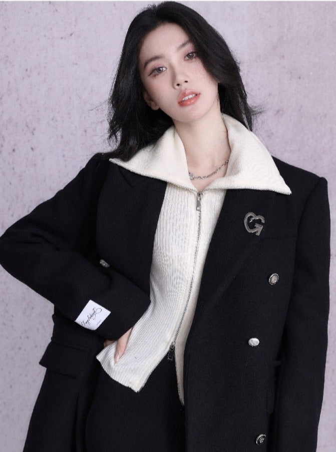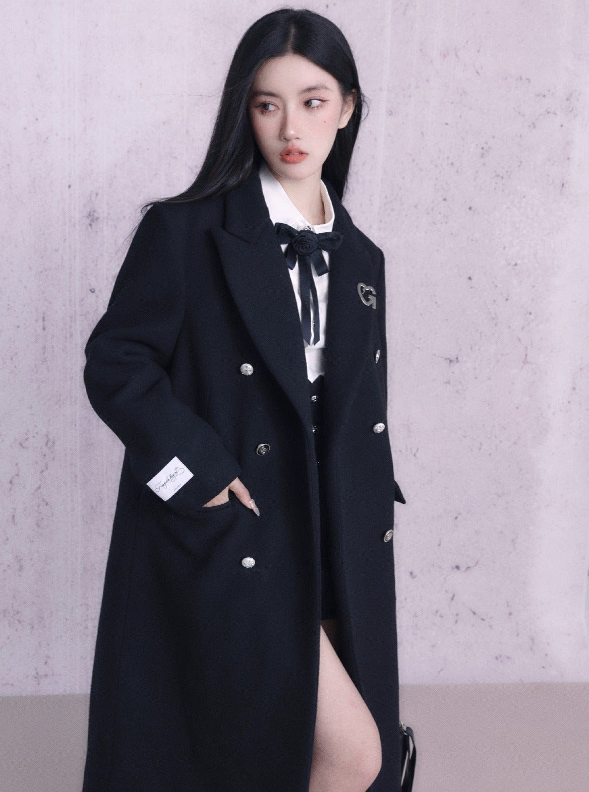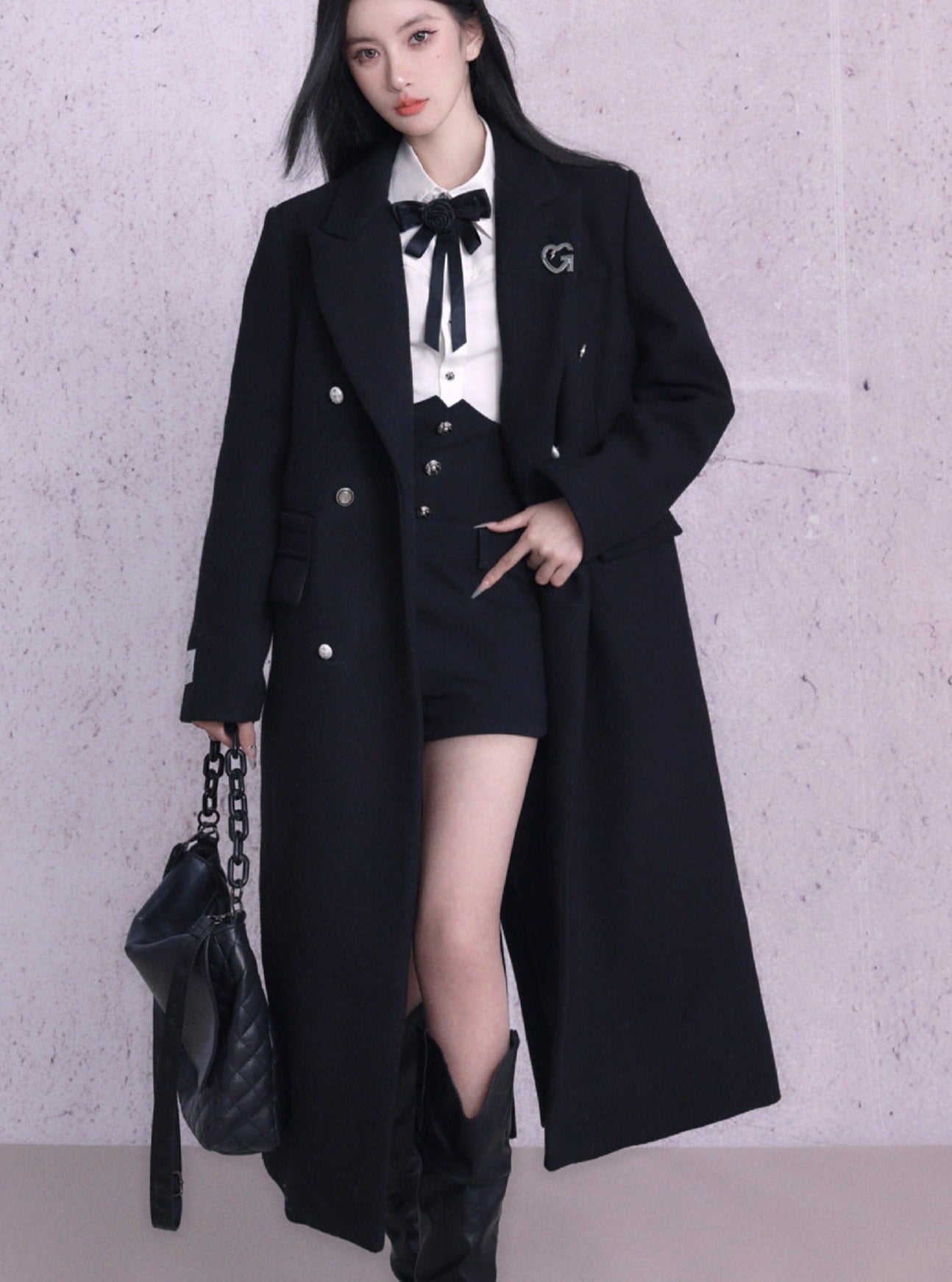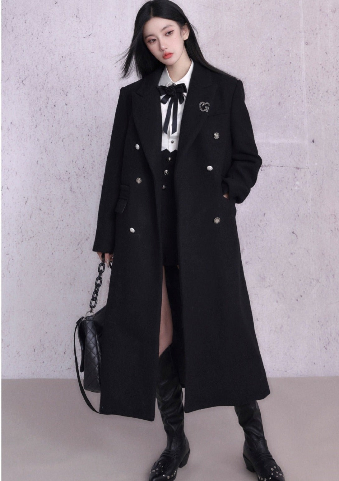 Classic Black Double-Breasted Longline Wool Coat with Silver Buttons