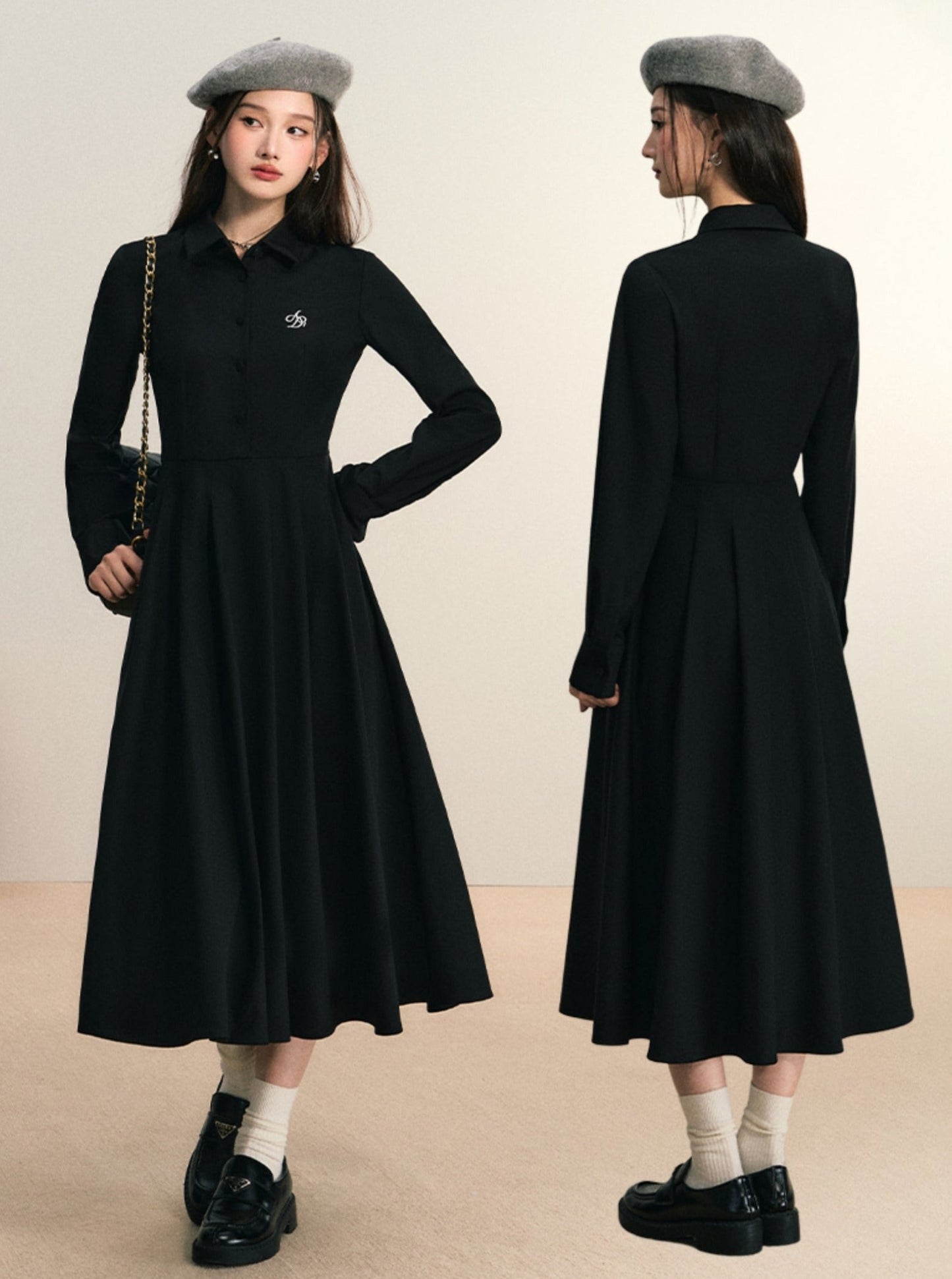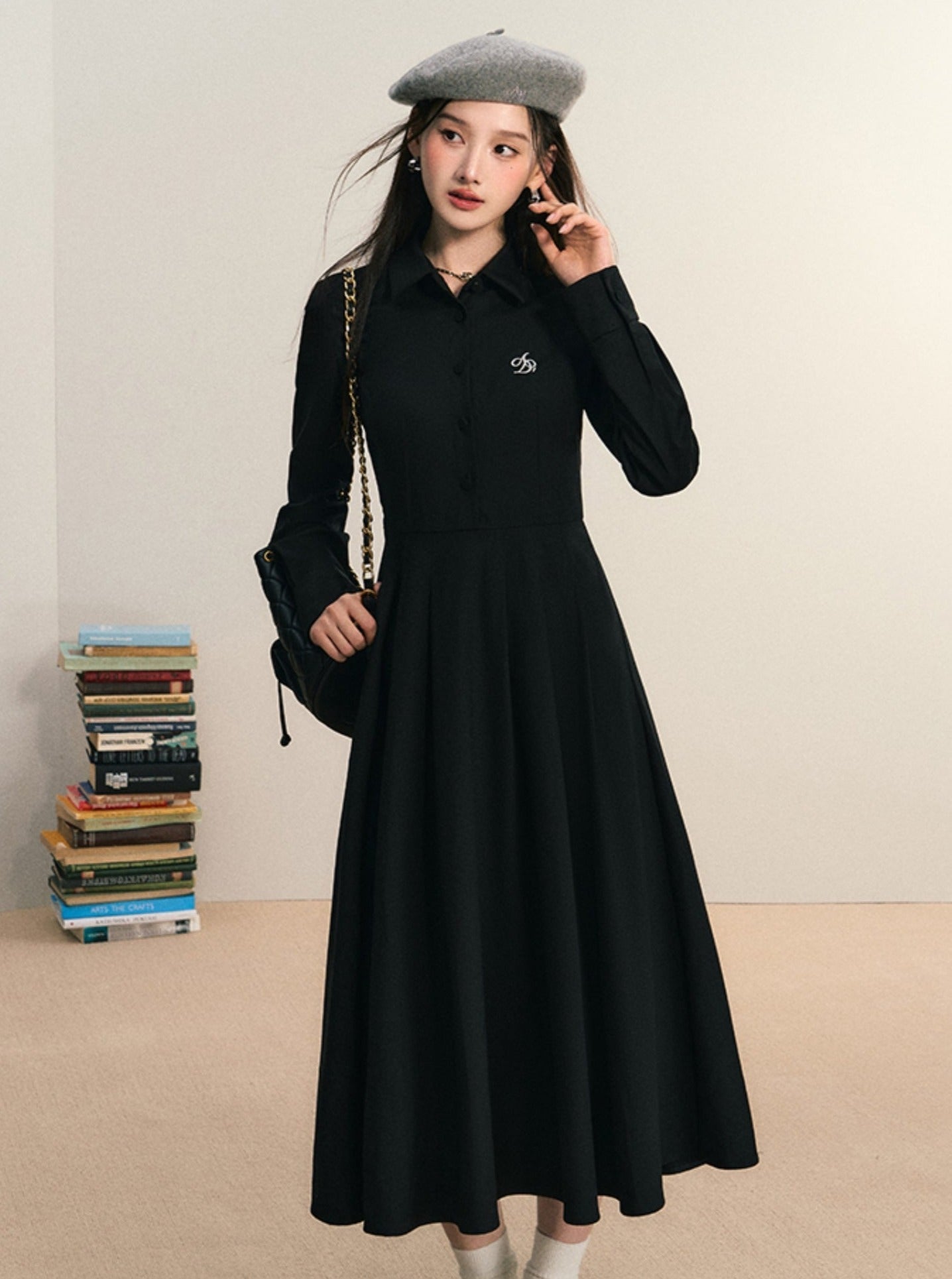 Classic Shirt Dress: Elegant Long-Sleeve Midi with Pleated Skirt