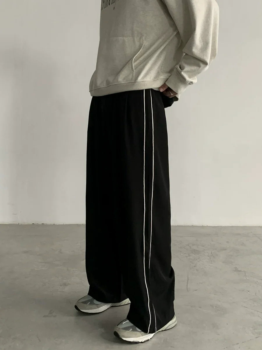 Contrast Side Stripe Wide-Leg Pants: Upgrade your wardrobe with these stylish. comfortable wide-leg pants. Crafted from a blend of 92% polyester and 8% spandex. these pants offer durability and stretch. Ideal for casual or semi-formal wear. they feature a trendy contrast side stripe.