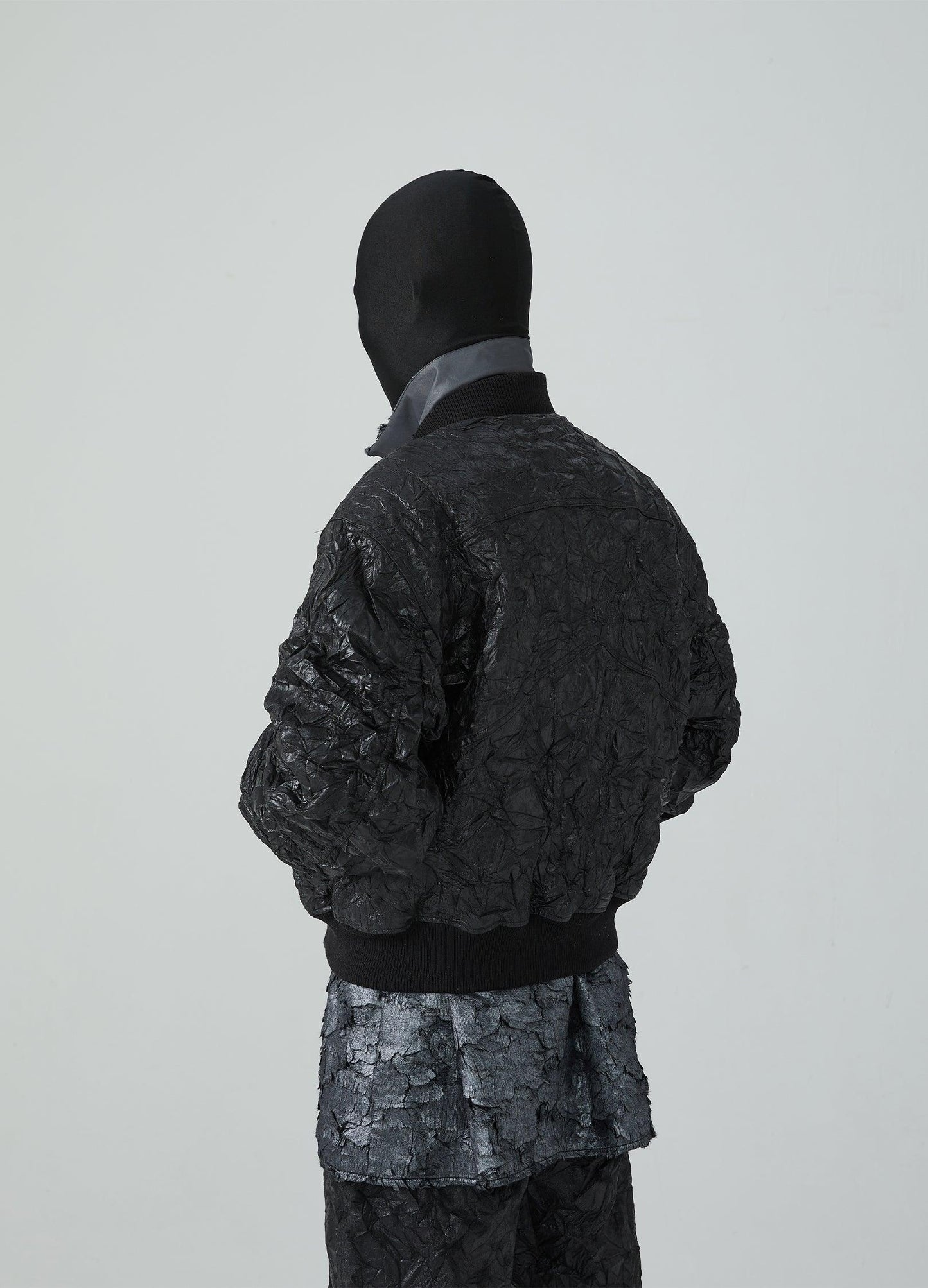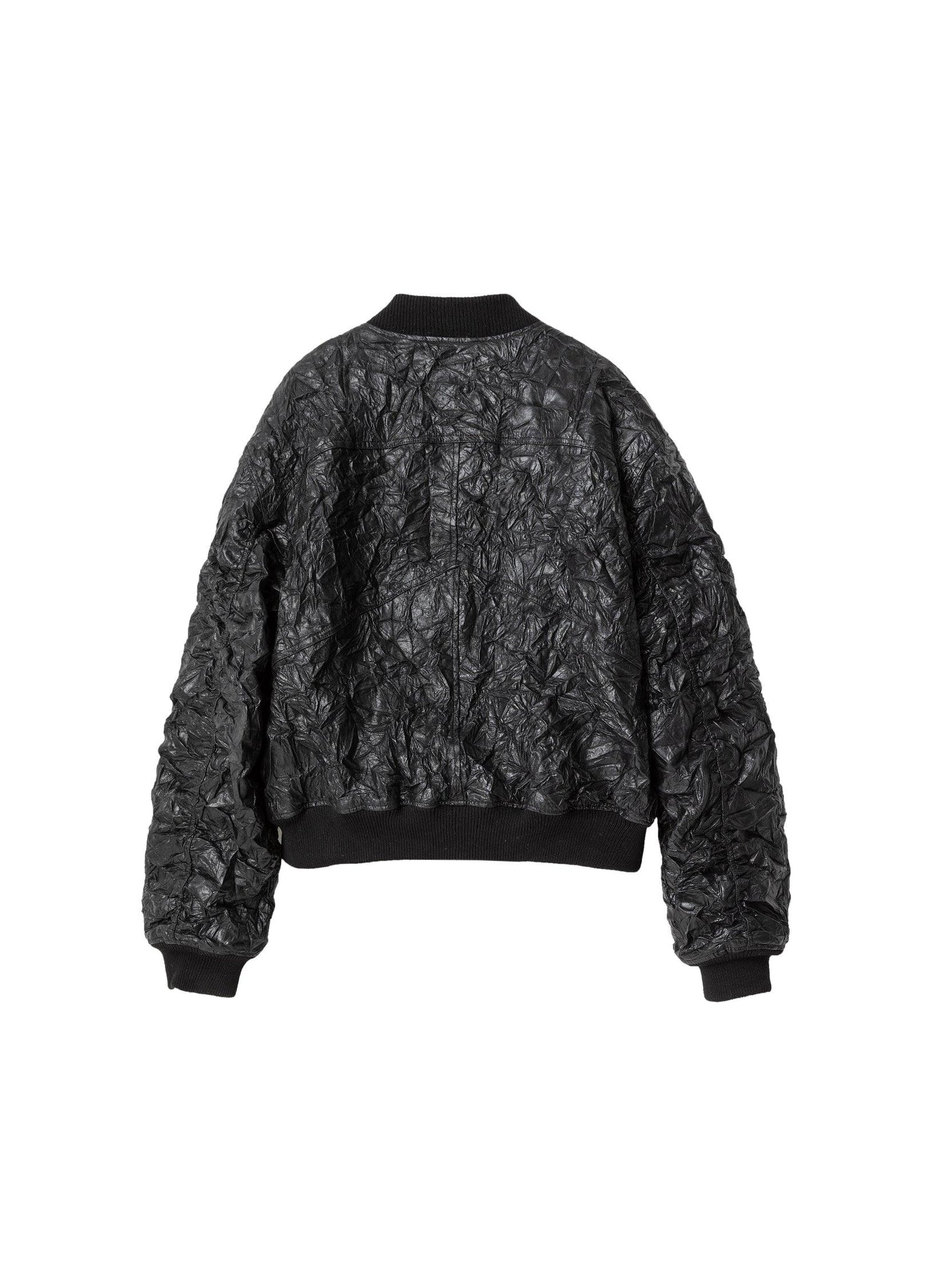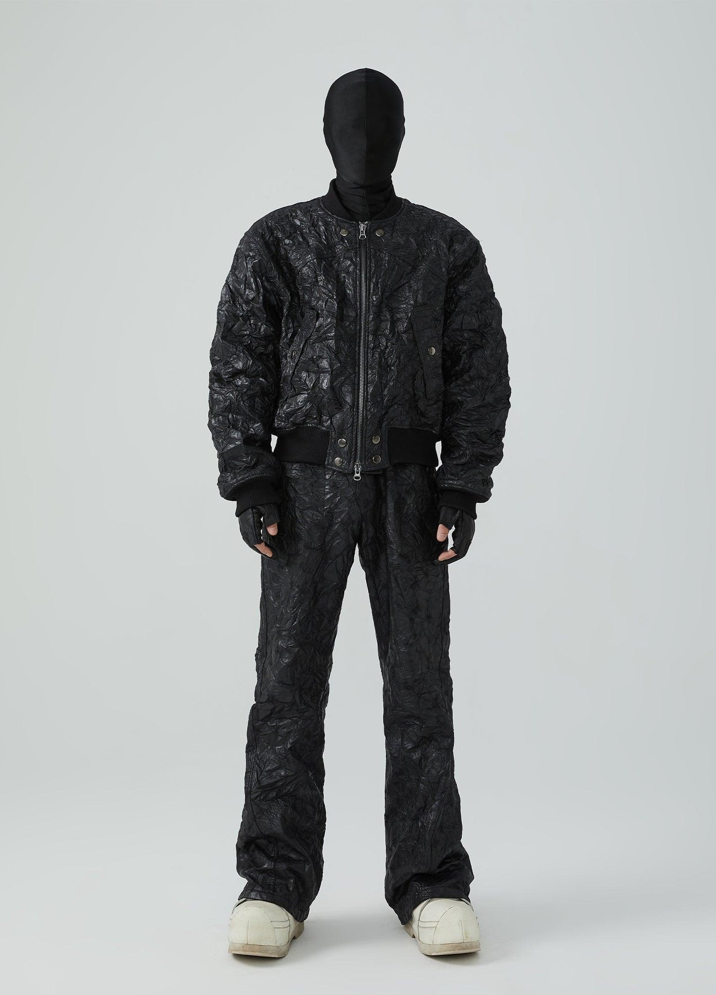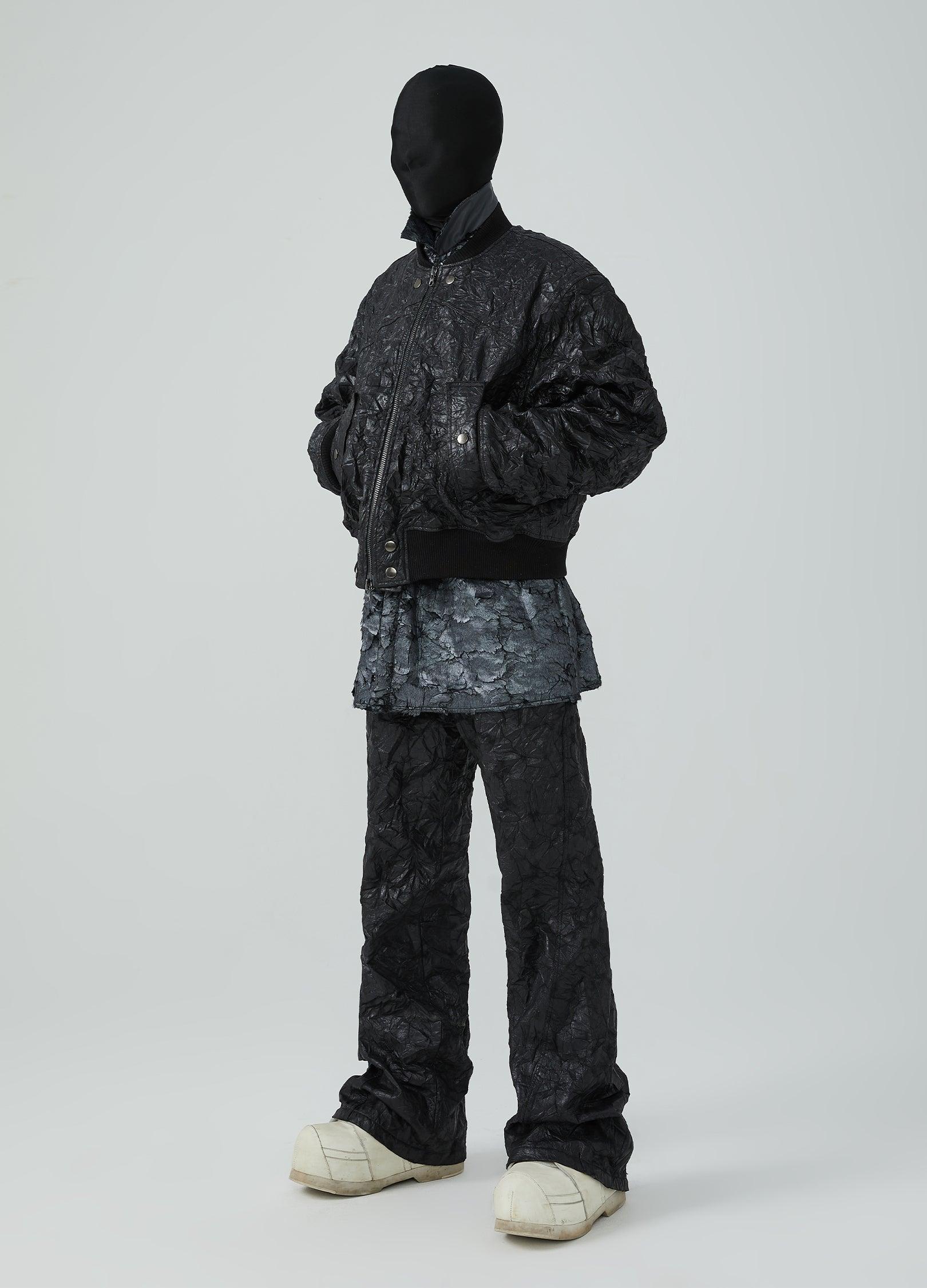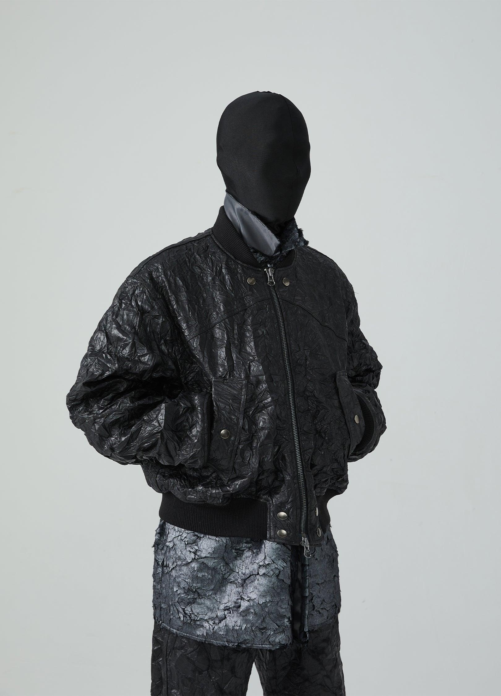 Step up your fashion game with our Cracked Patent Leather Bomber Jacket. This cropped fitting bomber jacket features a high collar neckline. tight elastic bottom hem. and extended boxy sleeves. Crafted from distressed cracked PU leather. it boasts a patent. glossy finish. Perfect for autumn and winter. this unisex jacket is equipped with custom metal zippers. Available in sizes from Small to Extra Large. Model (175cm) is wearing a size Medium.