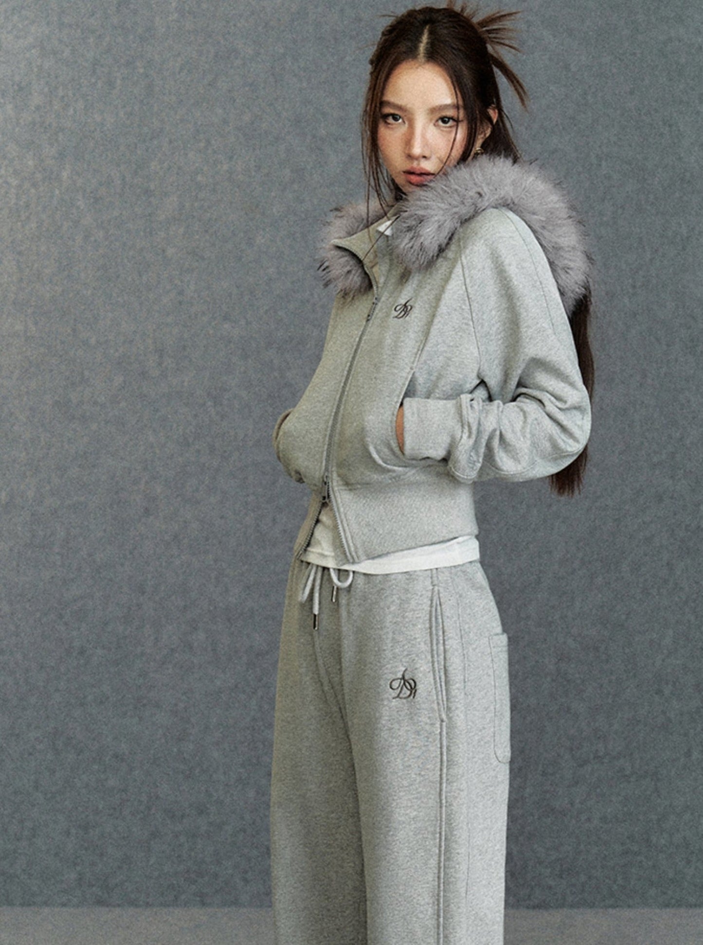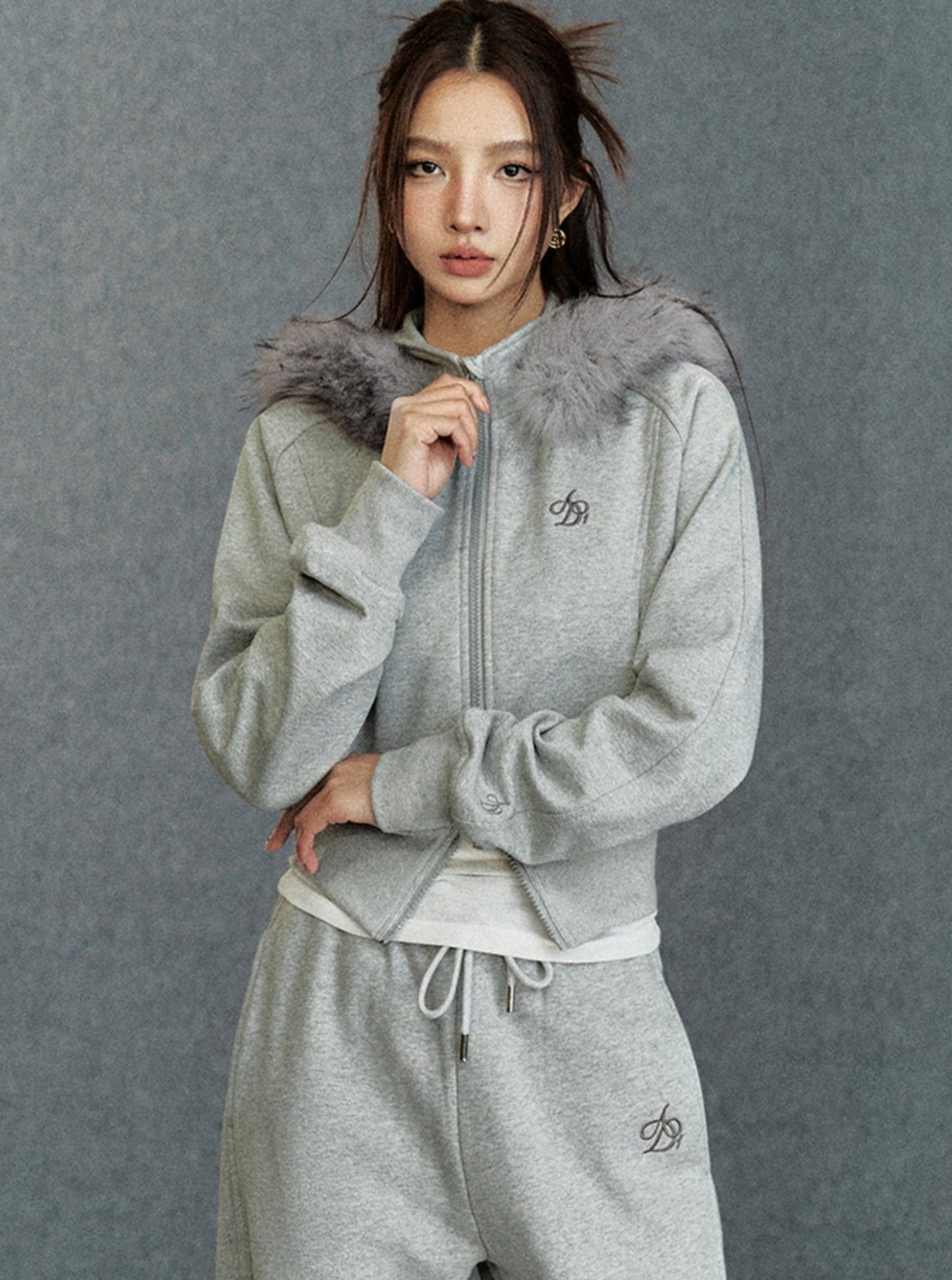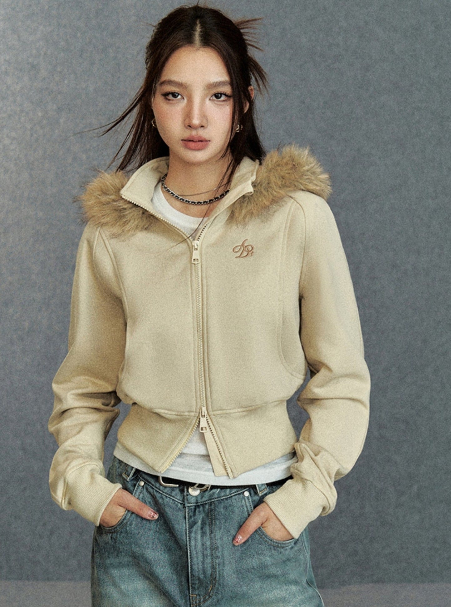 Cropped Fur-Trimmed Hoodie: Zip-Up Sweatshirt with Logo Embroidery