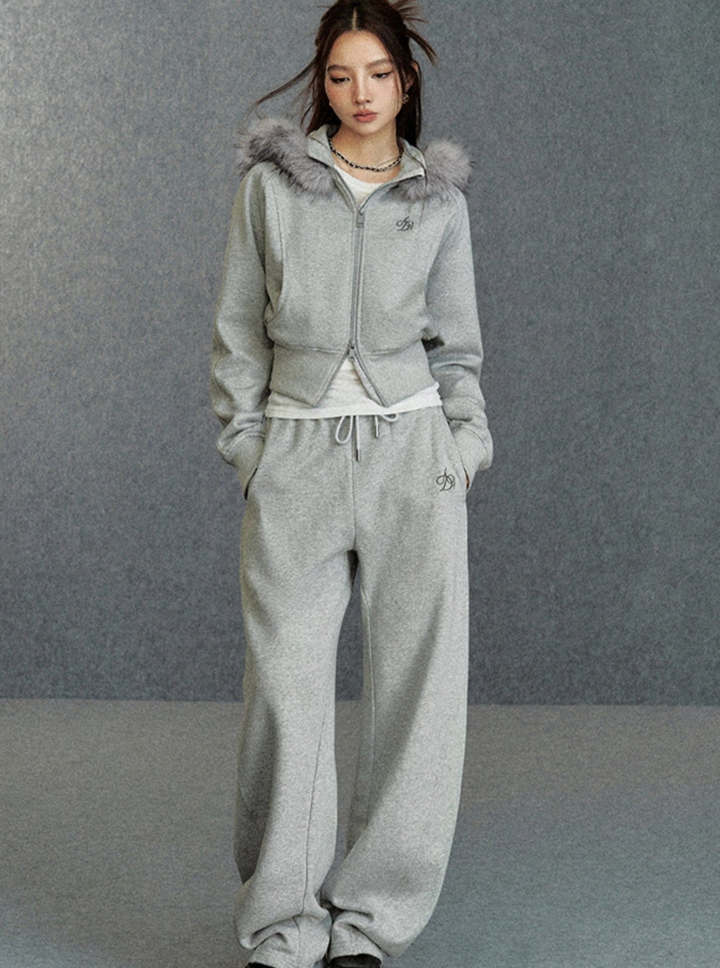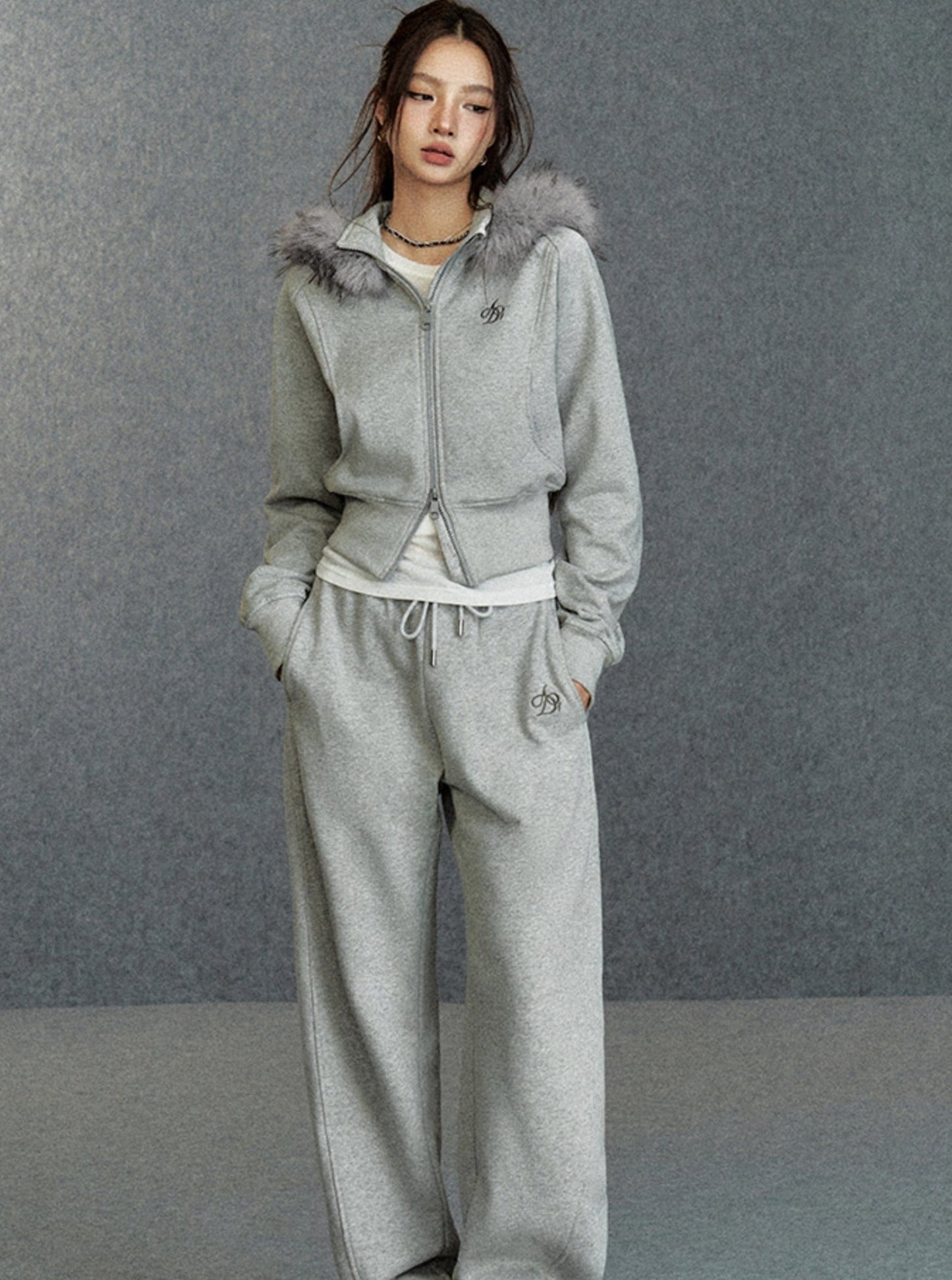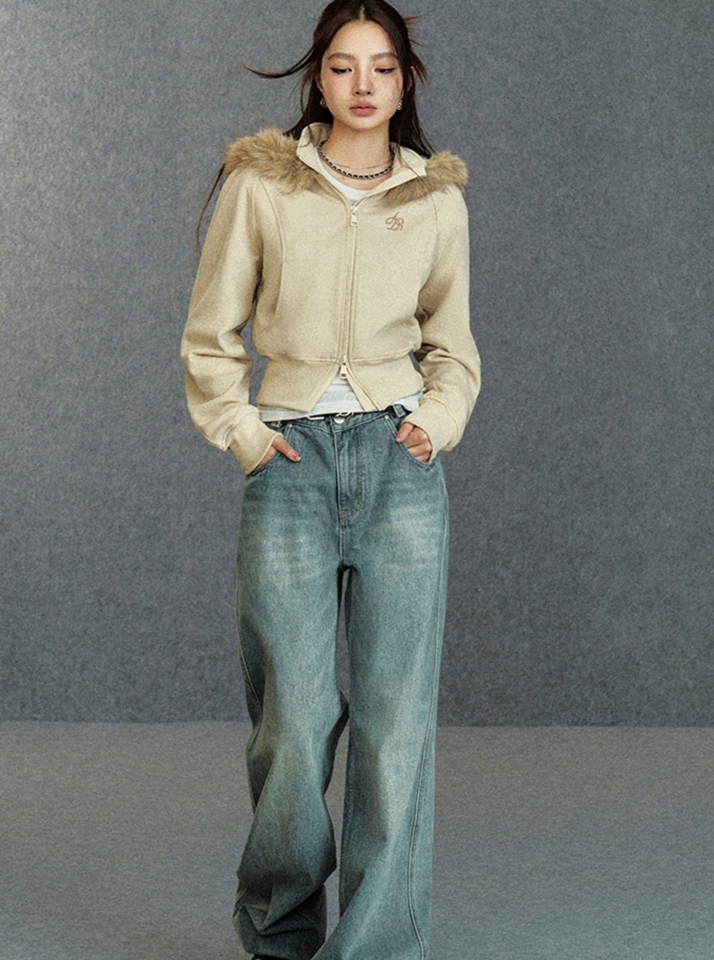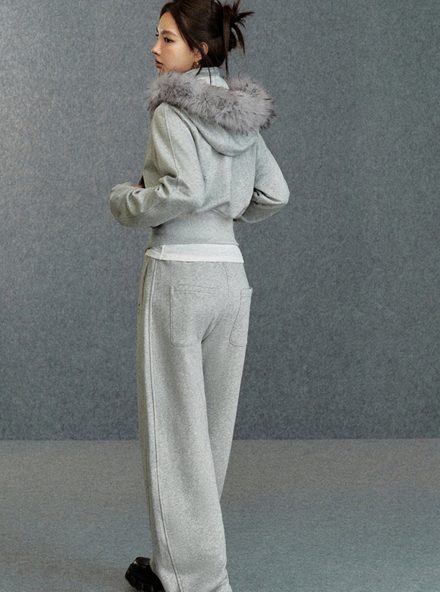 Cropped Fur-Trimmed Hoodie: Zip-Up Sweatshirt with Logo Embroidery