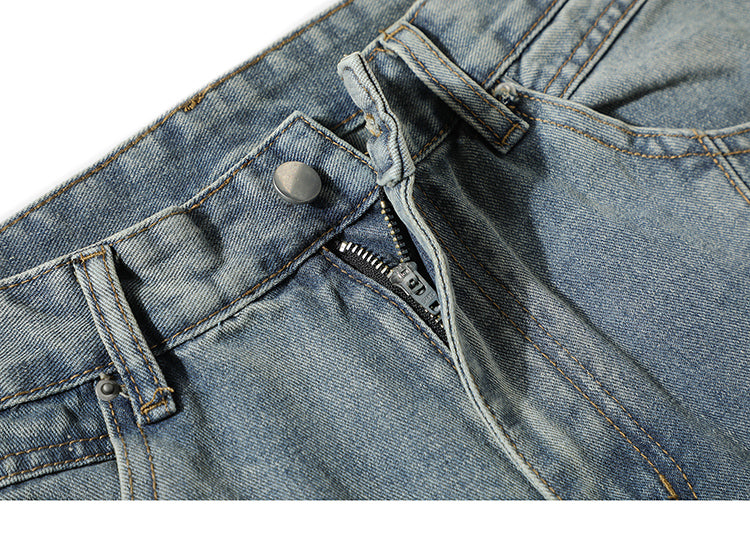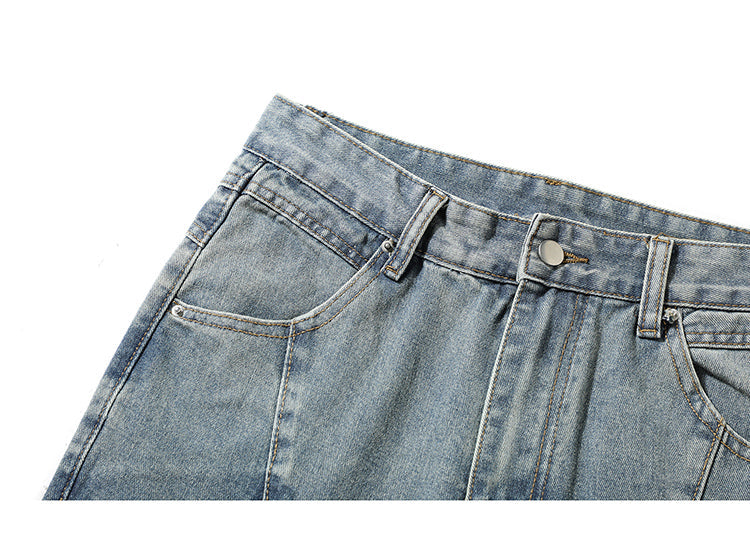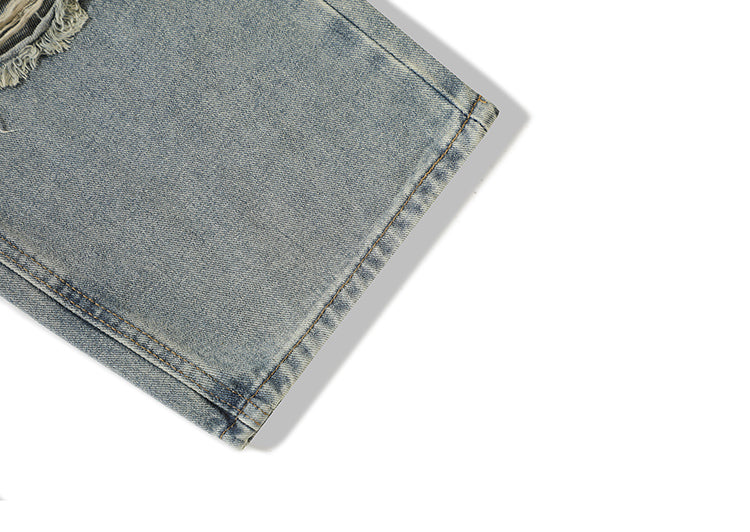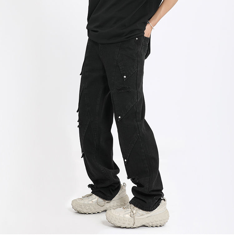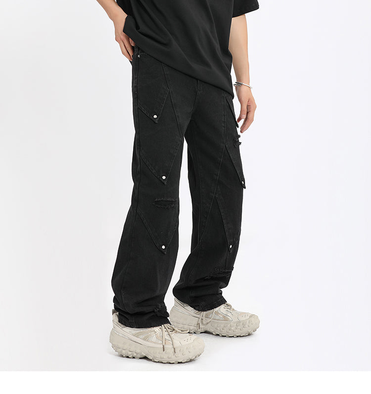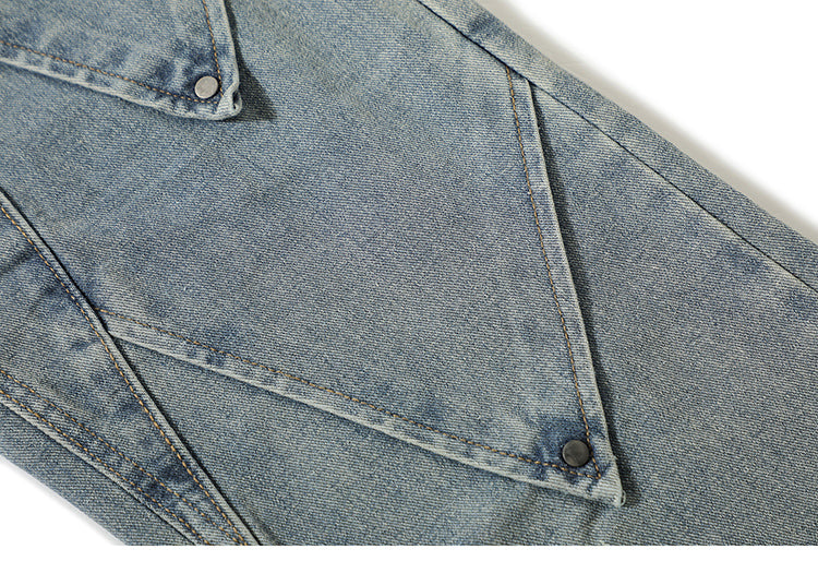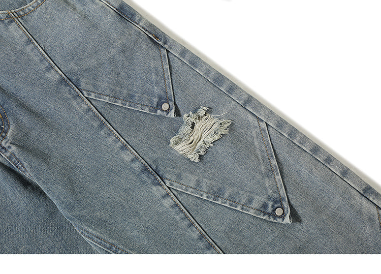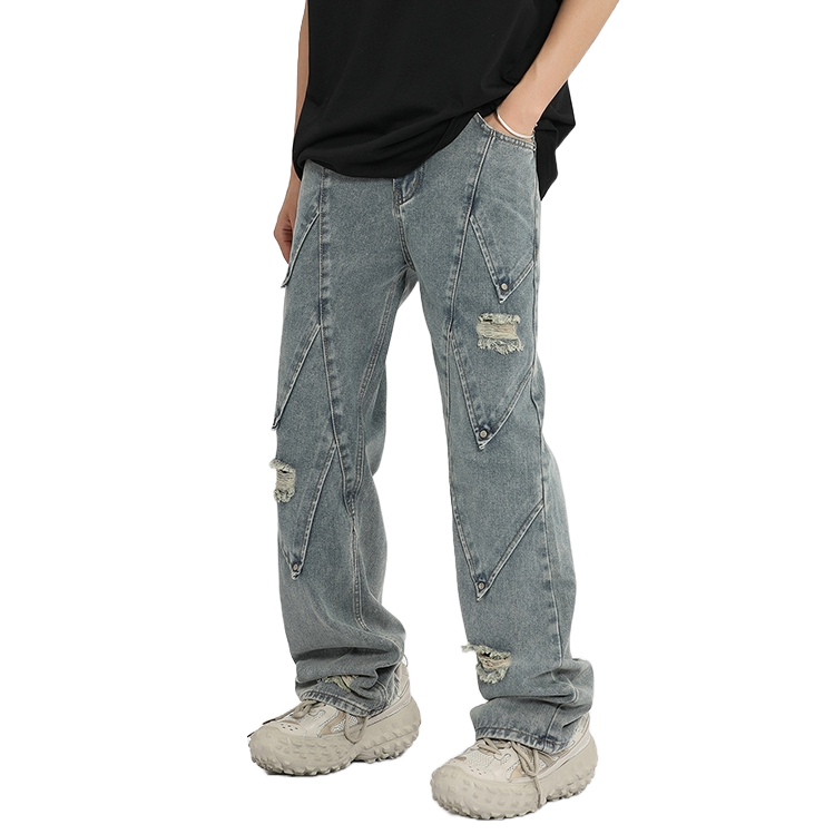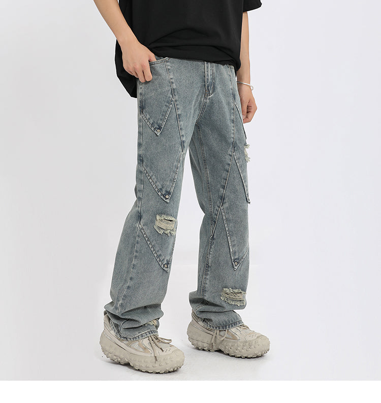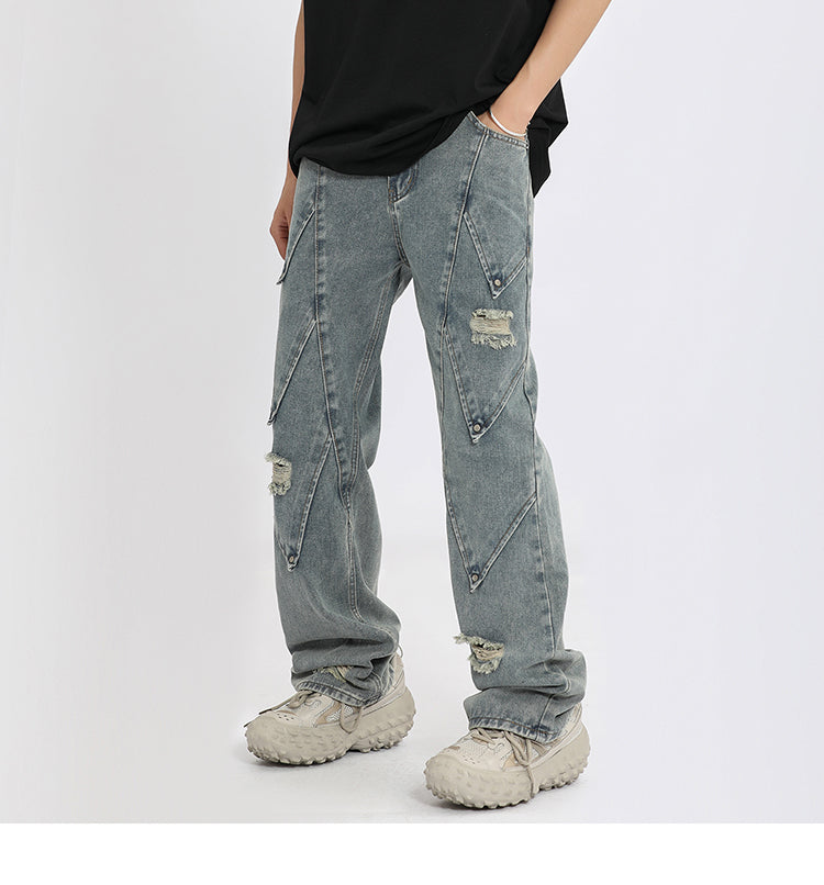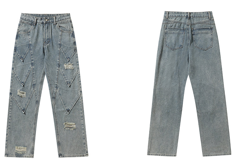 Light gray jeans with unique diamond-shaped panels. Features strategically placed distressing and rips. The angular paneling creates an avant-garde silhouette. Combines vintage-inspired wash with modern. geometric design elements for an edgy. reconstructed look.