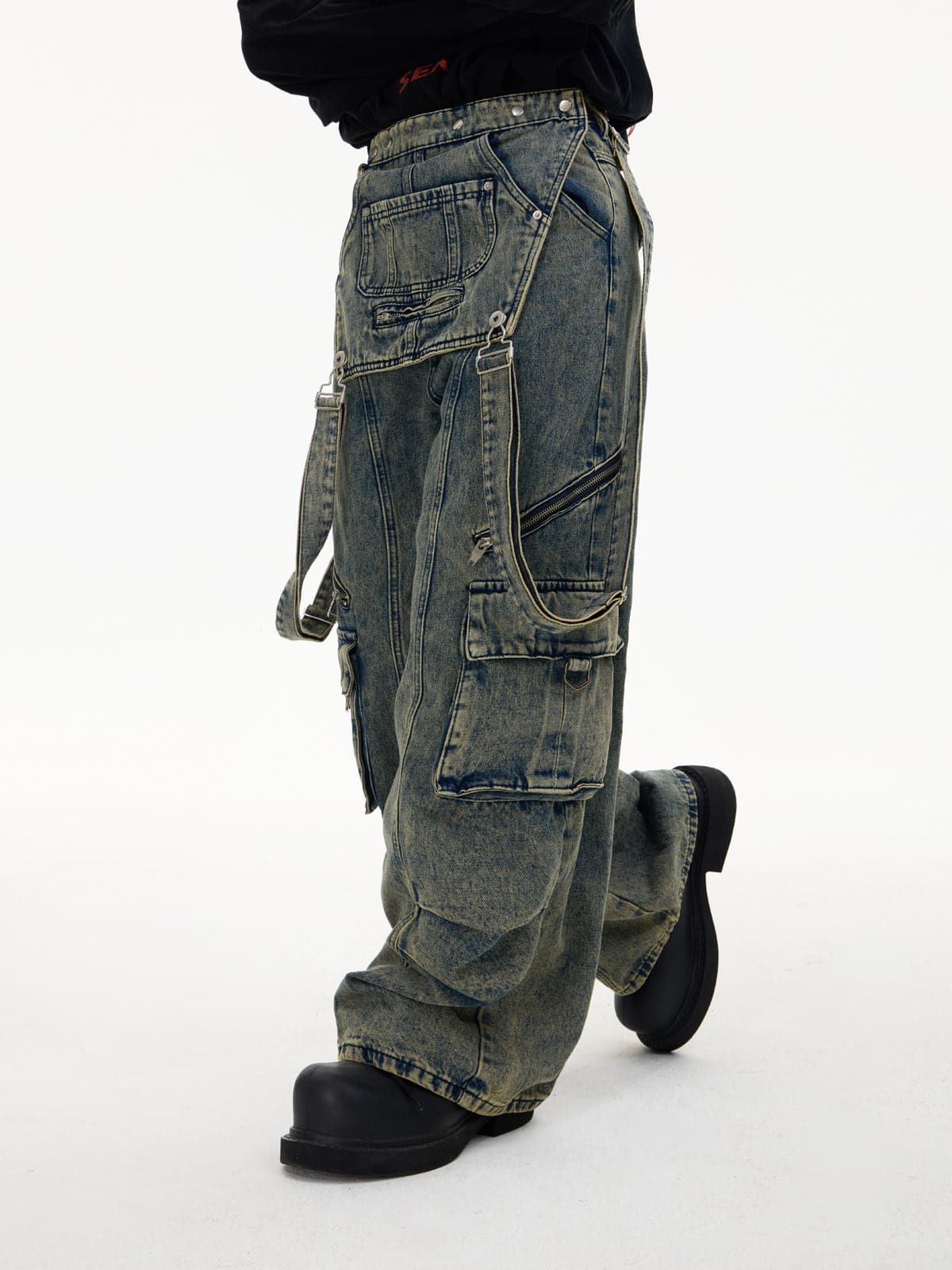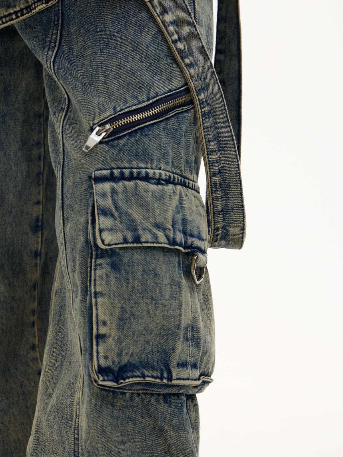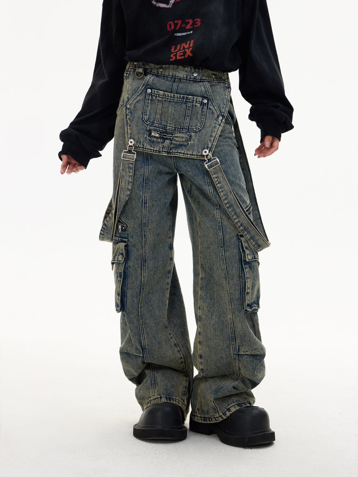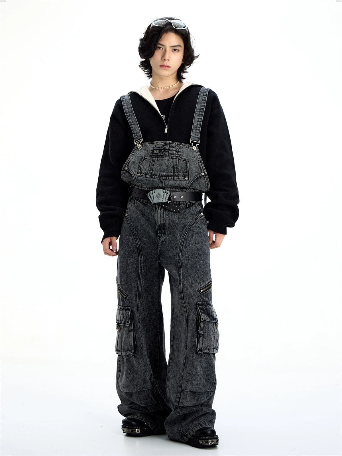 Detachable Suspender Washed Multi-Pocket Cargo Jeans