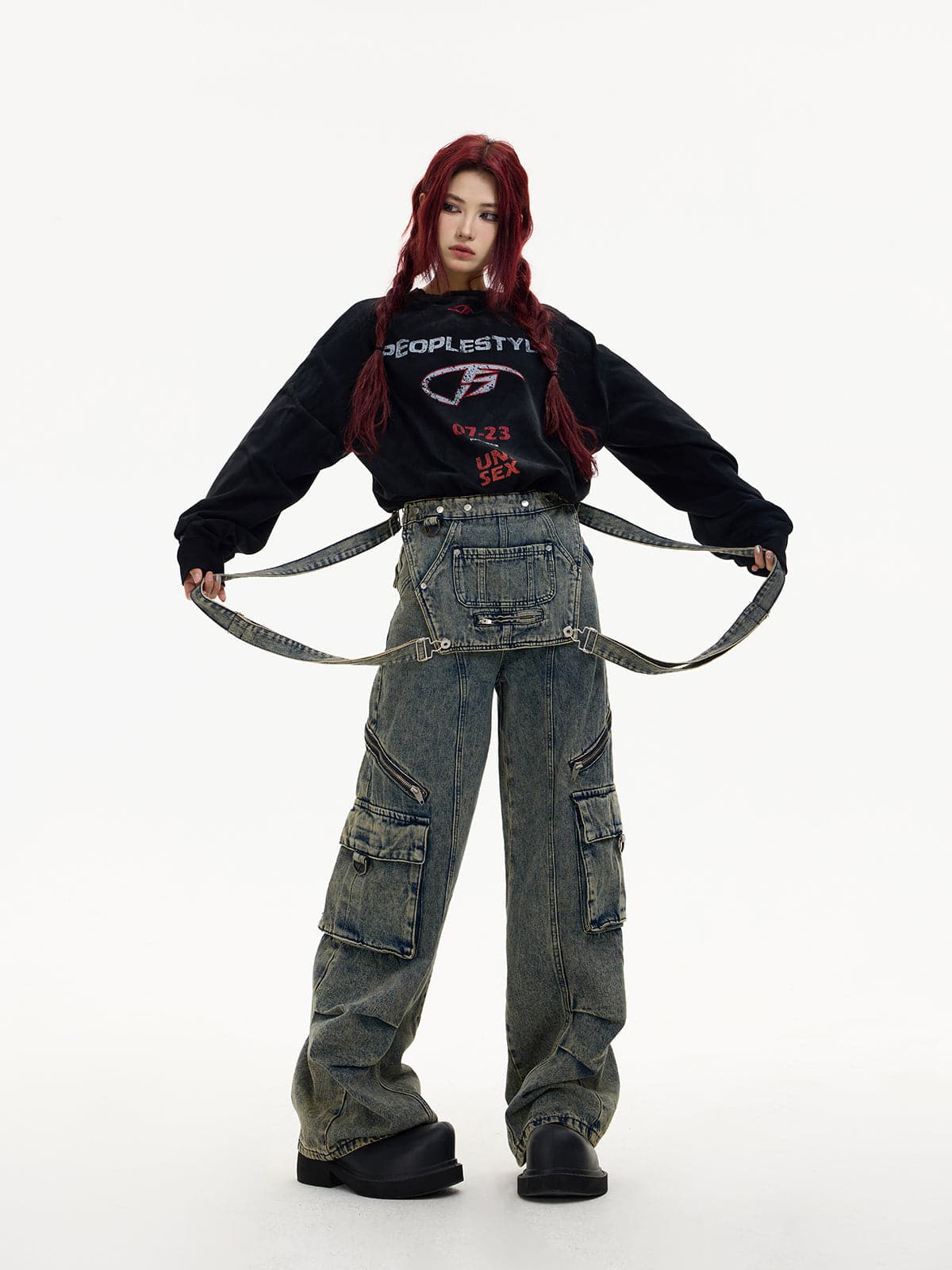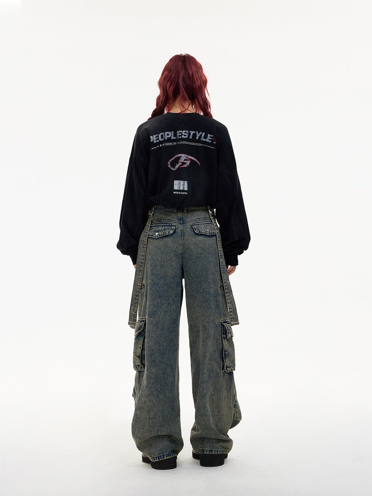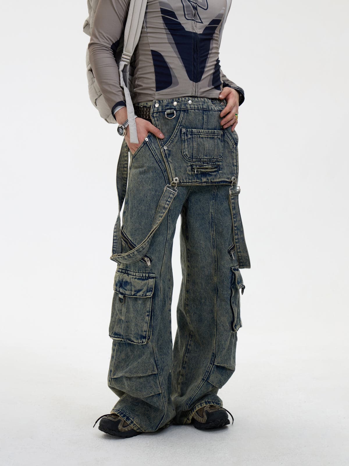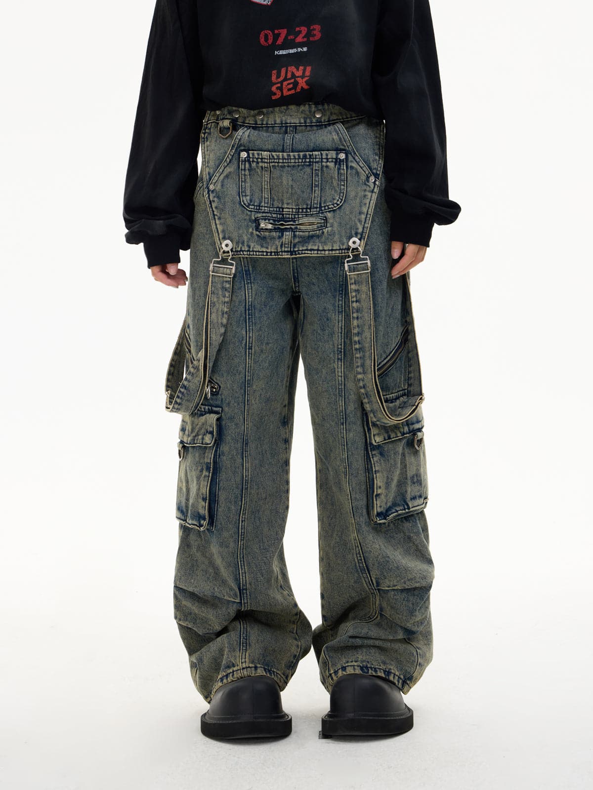 Detachable Suspender Washed Multi-Pocket Cargo Jeans