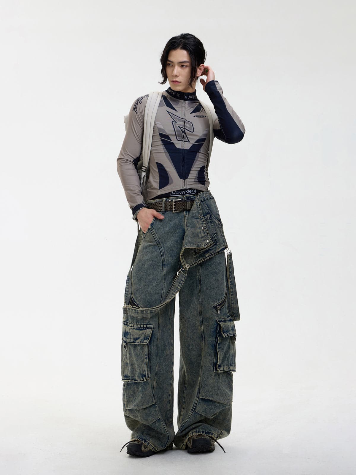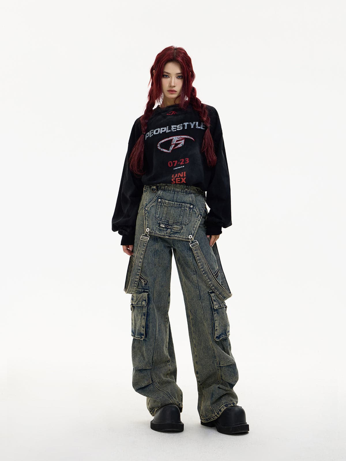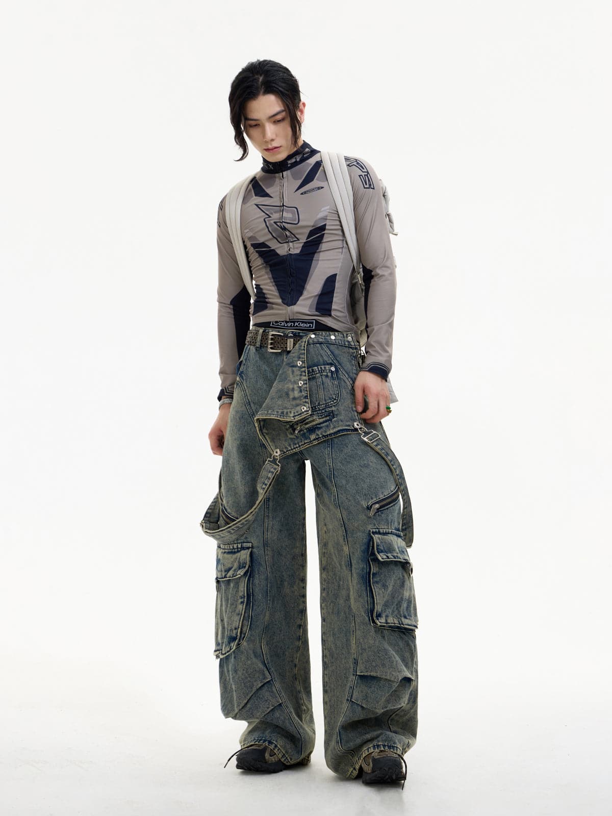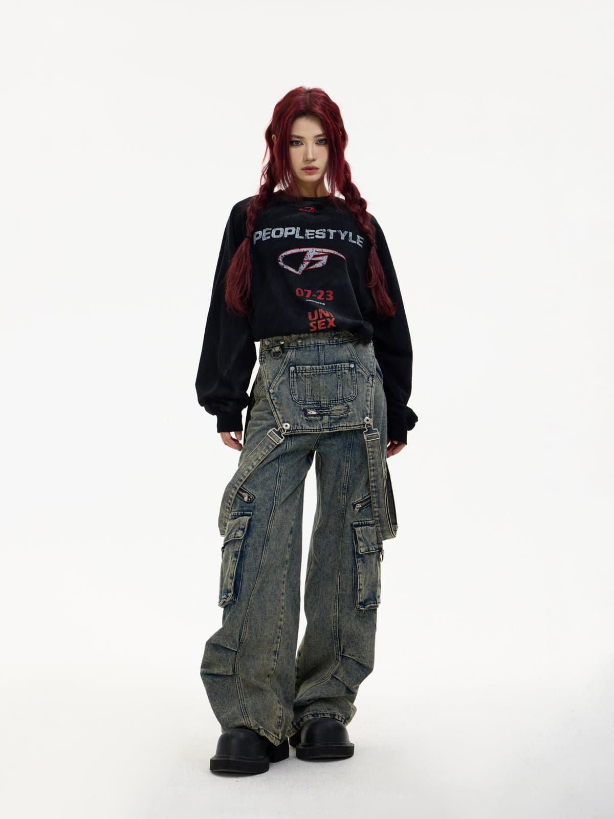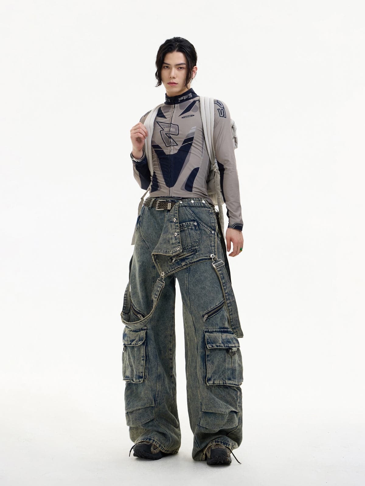 Detachable Suspender Washed Multi-Pocket Cargo Jeans