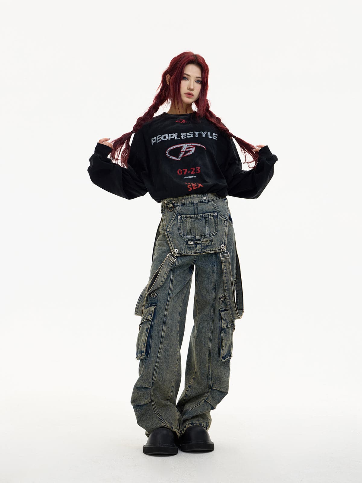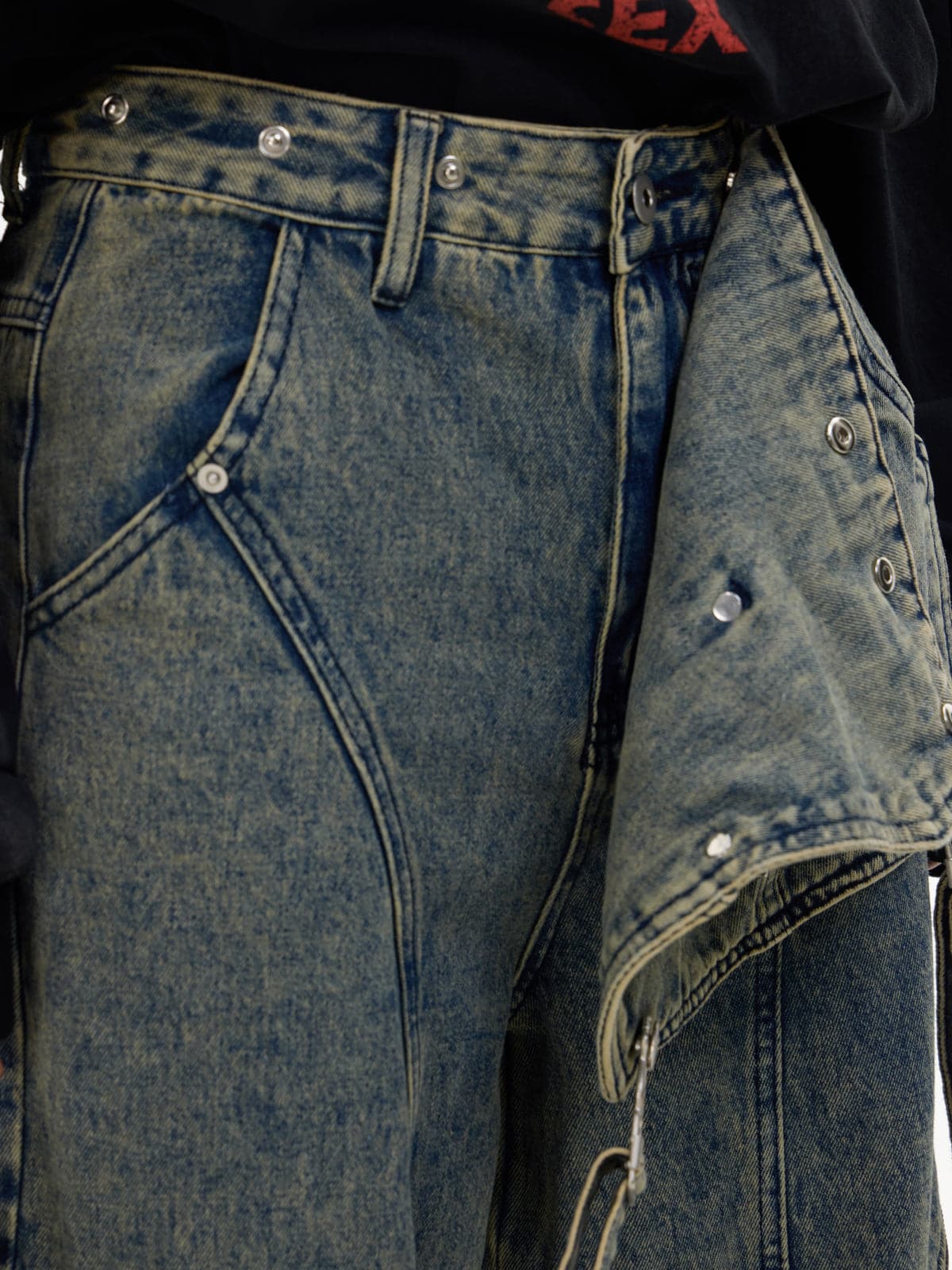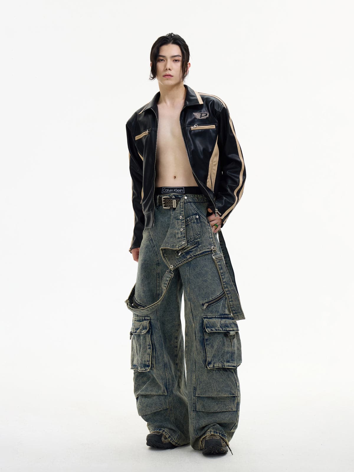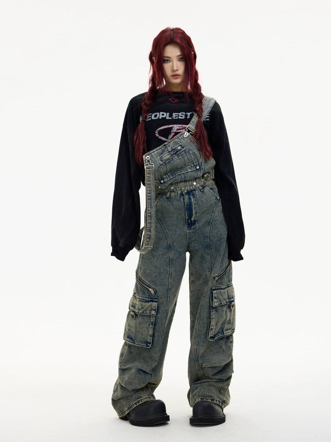 Detachable Suspender Washed Multi-Pocket Cargo Jeans