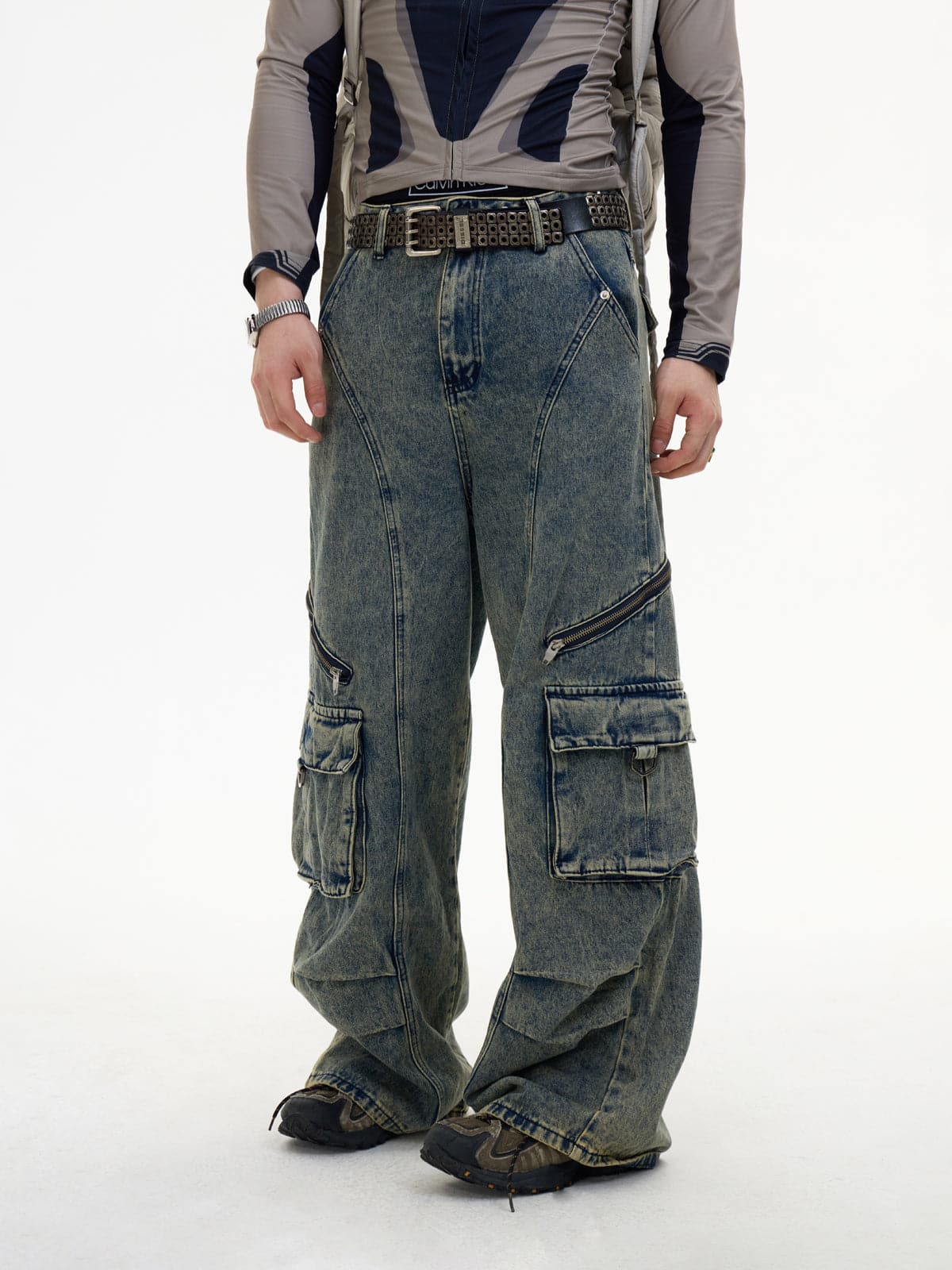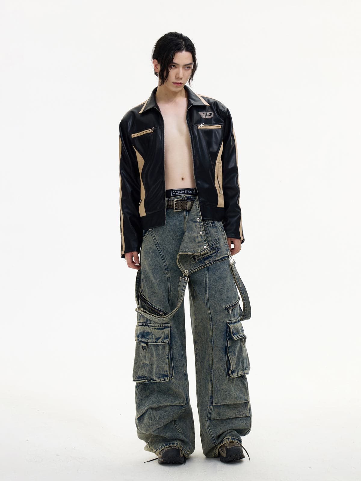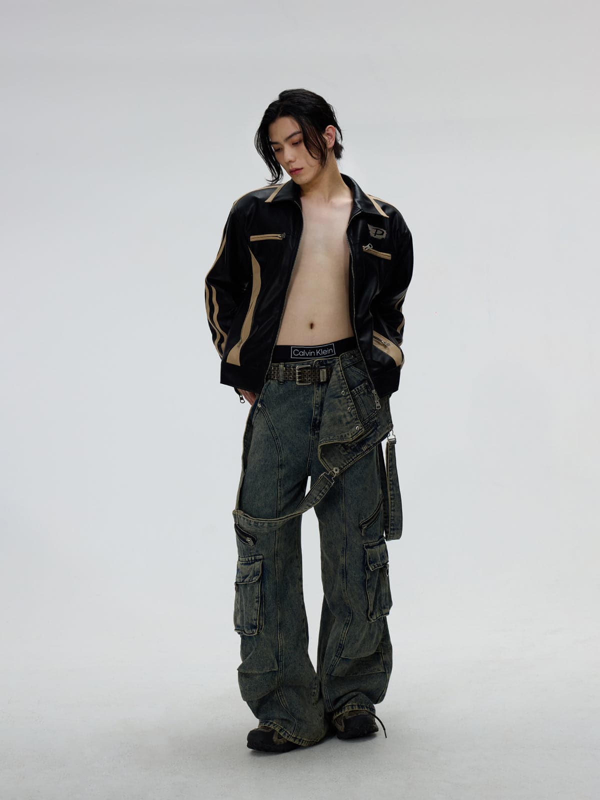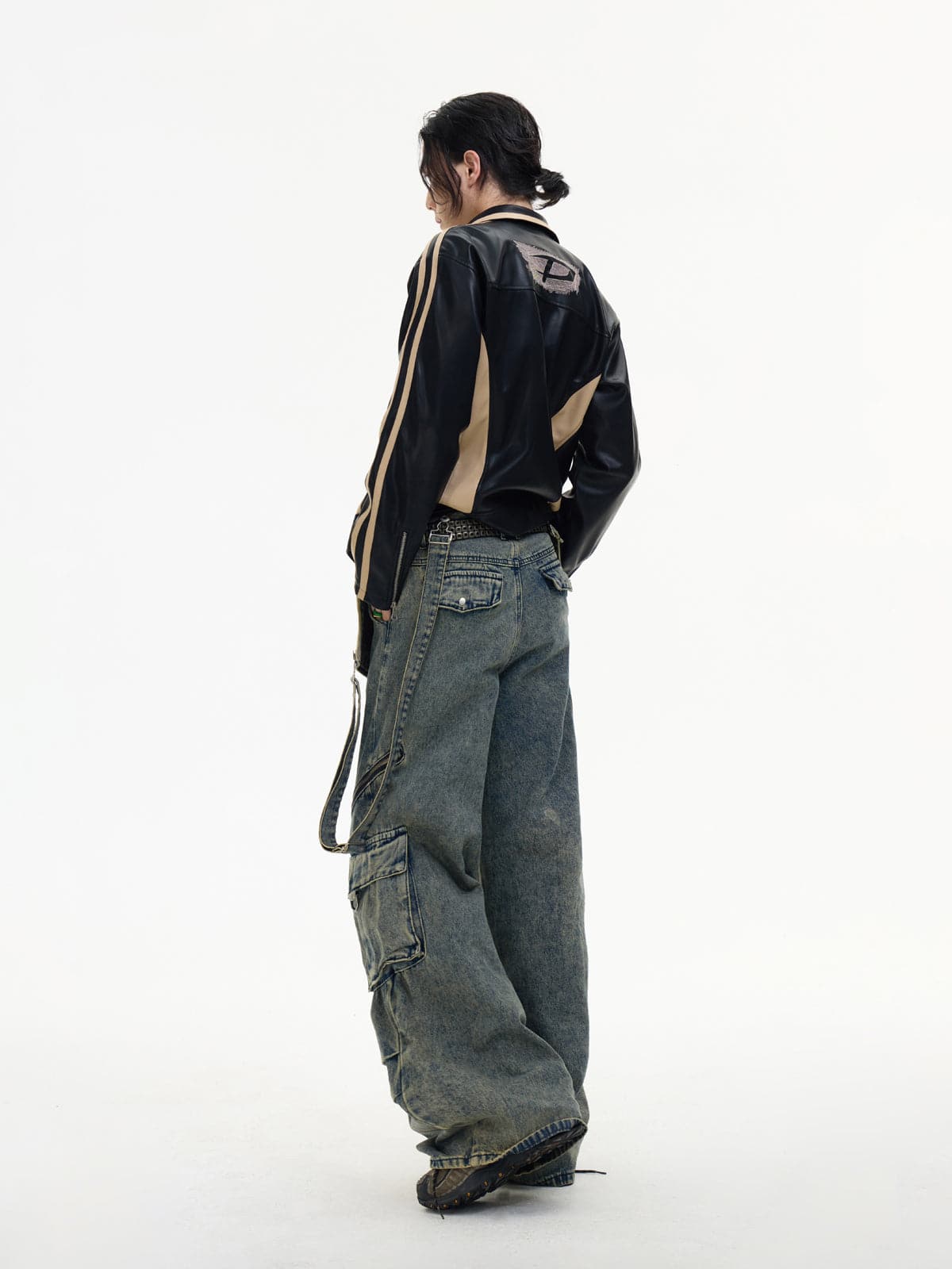 Detachable Suspender Washed Multi-Pocket Cargo Jeans
