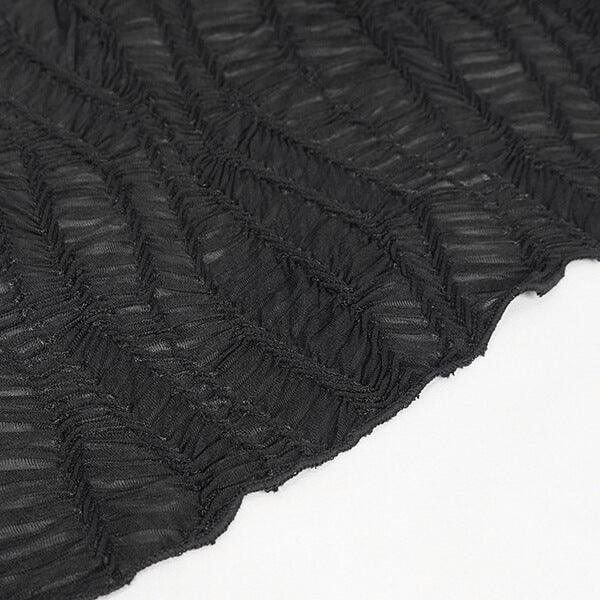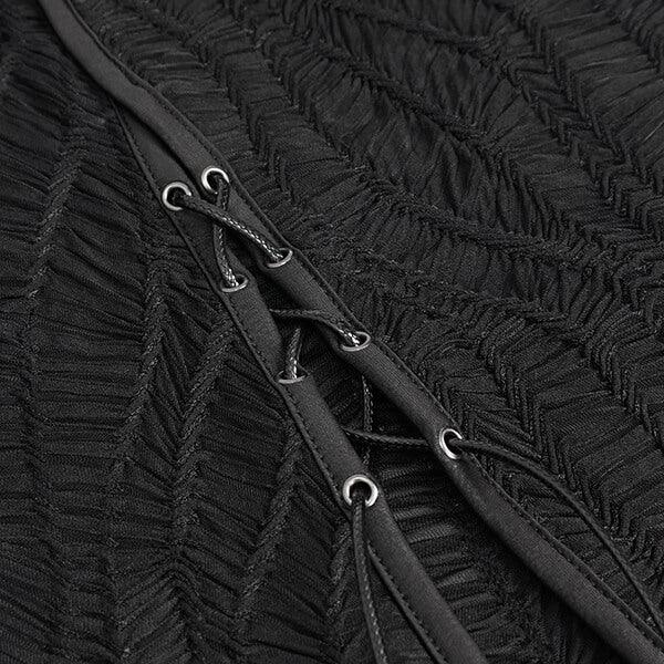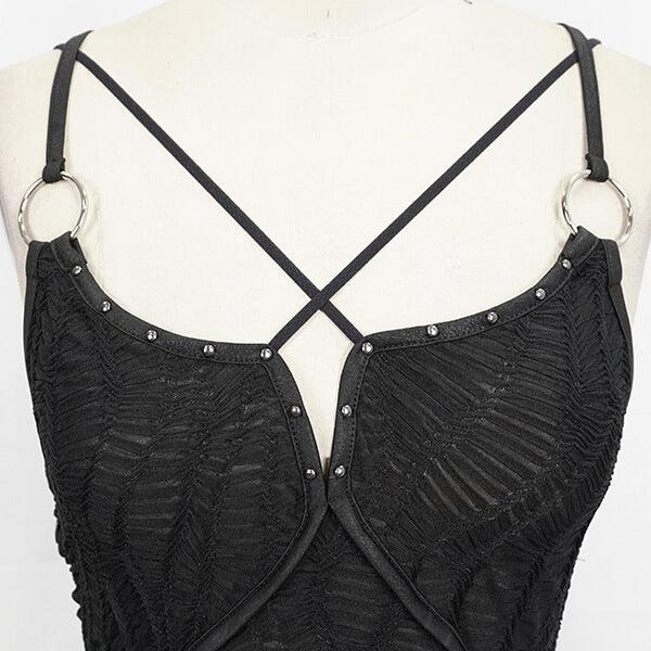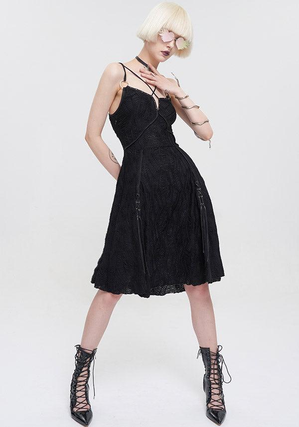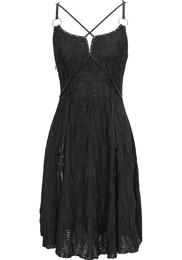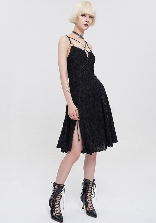 Black lace slip dress with edgy harness-style straps and daring side slits. Features a textured lace pattern and adjustable fit. Perfect for gothic nightlife or alternative formal events. Pair with platform boots and dark accessories for a complete look.