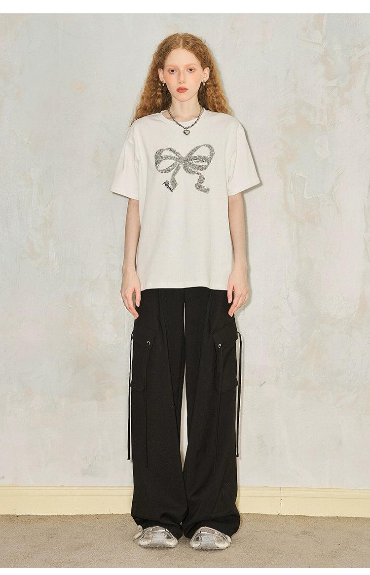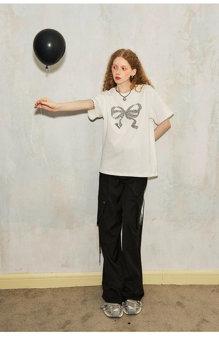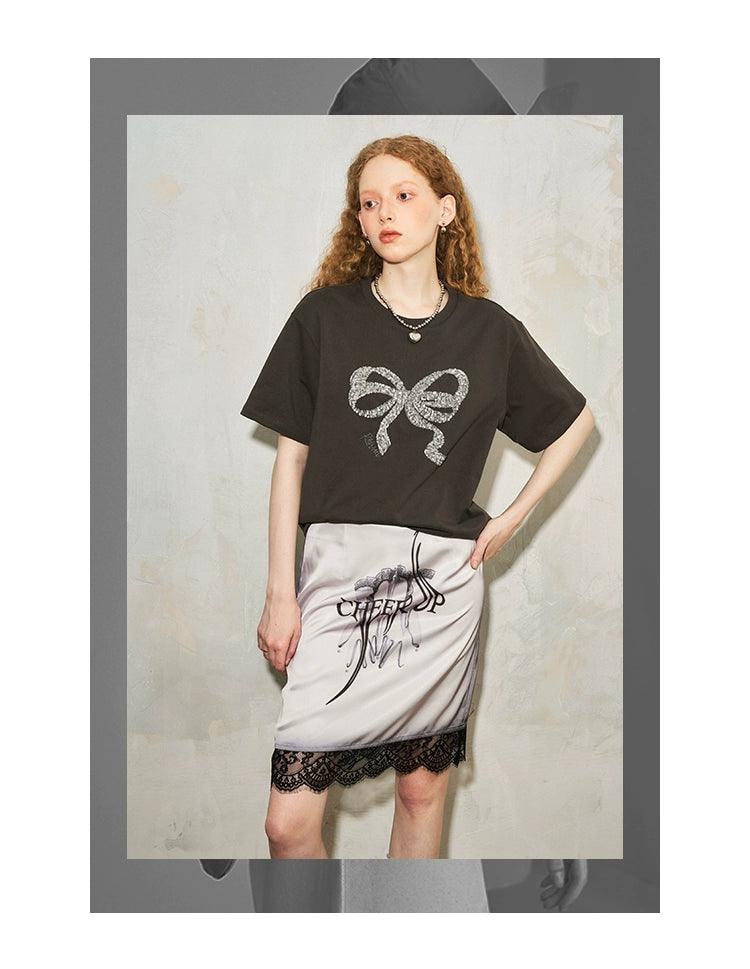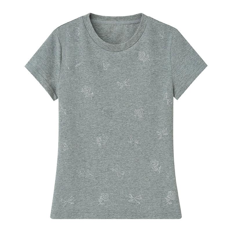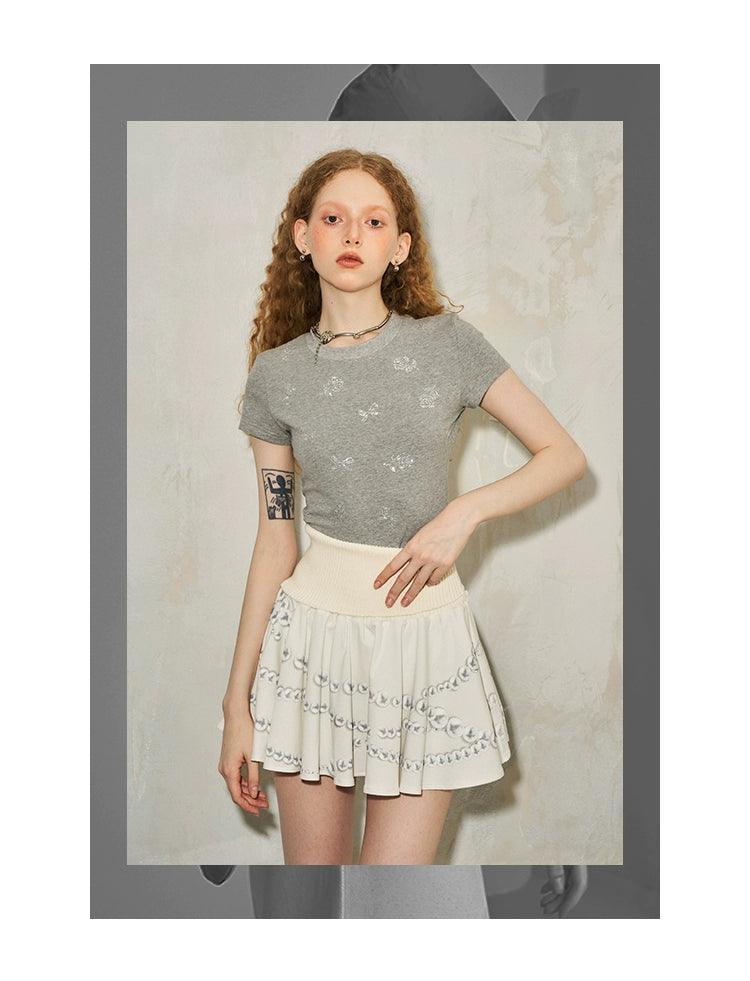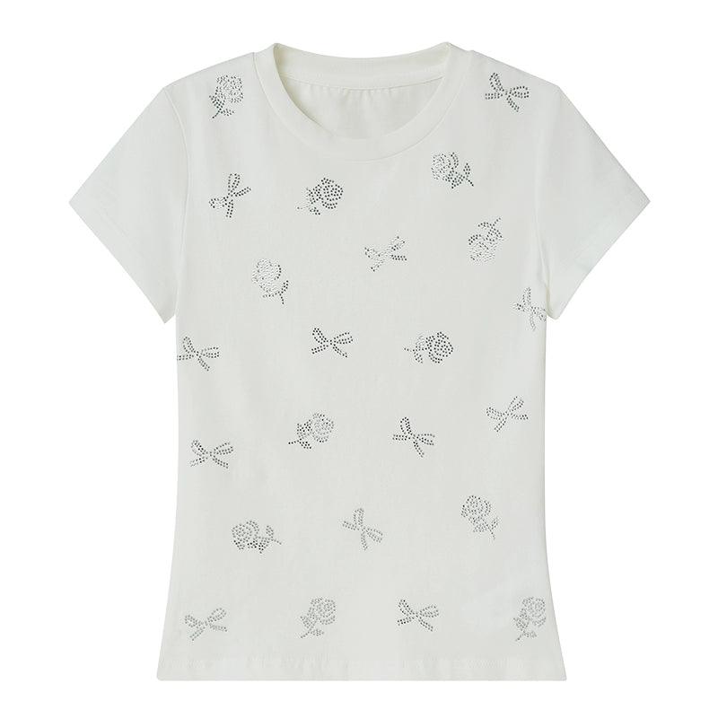 Girly Butterfly and Flower Print T-shirt: This T-shirt cleverly uses a repeating pattern of bows and flowers. The glossy rhinestone craftsmanship adds a lively. girlish element to the basic short-sleeved tee. It can be paired with short skirts and trousers. offering more styling possibilities.