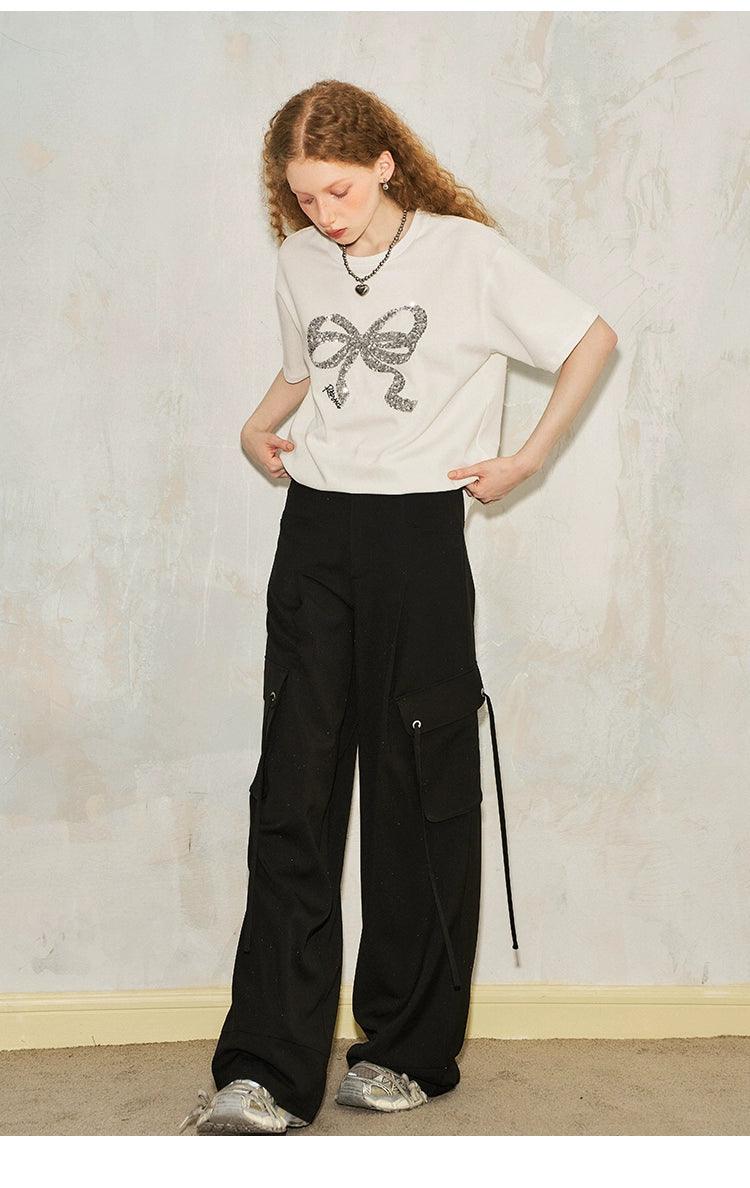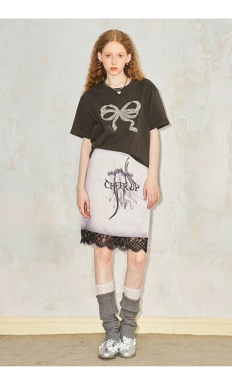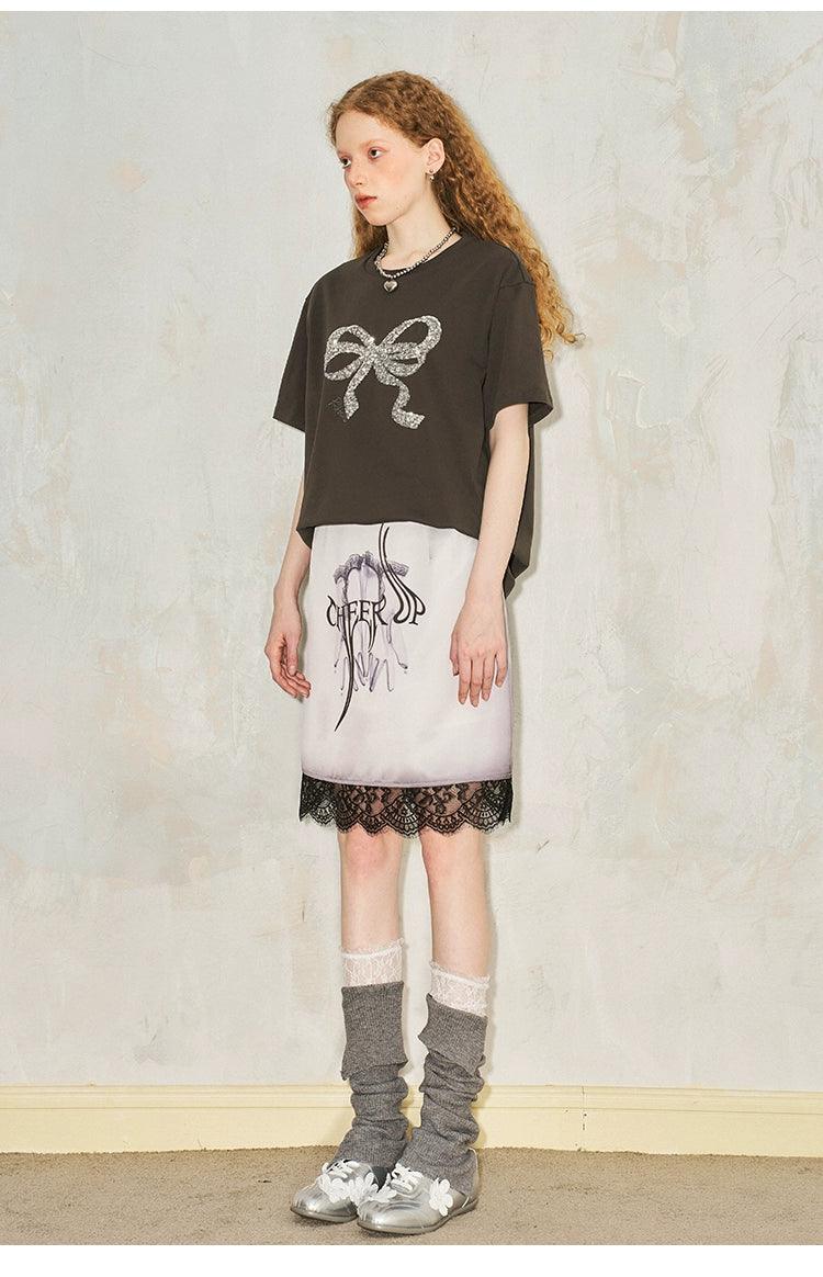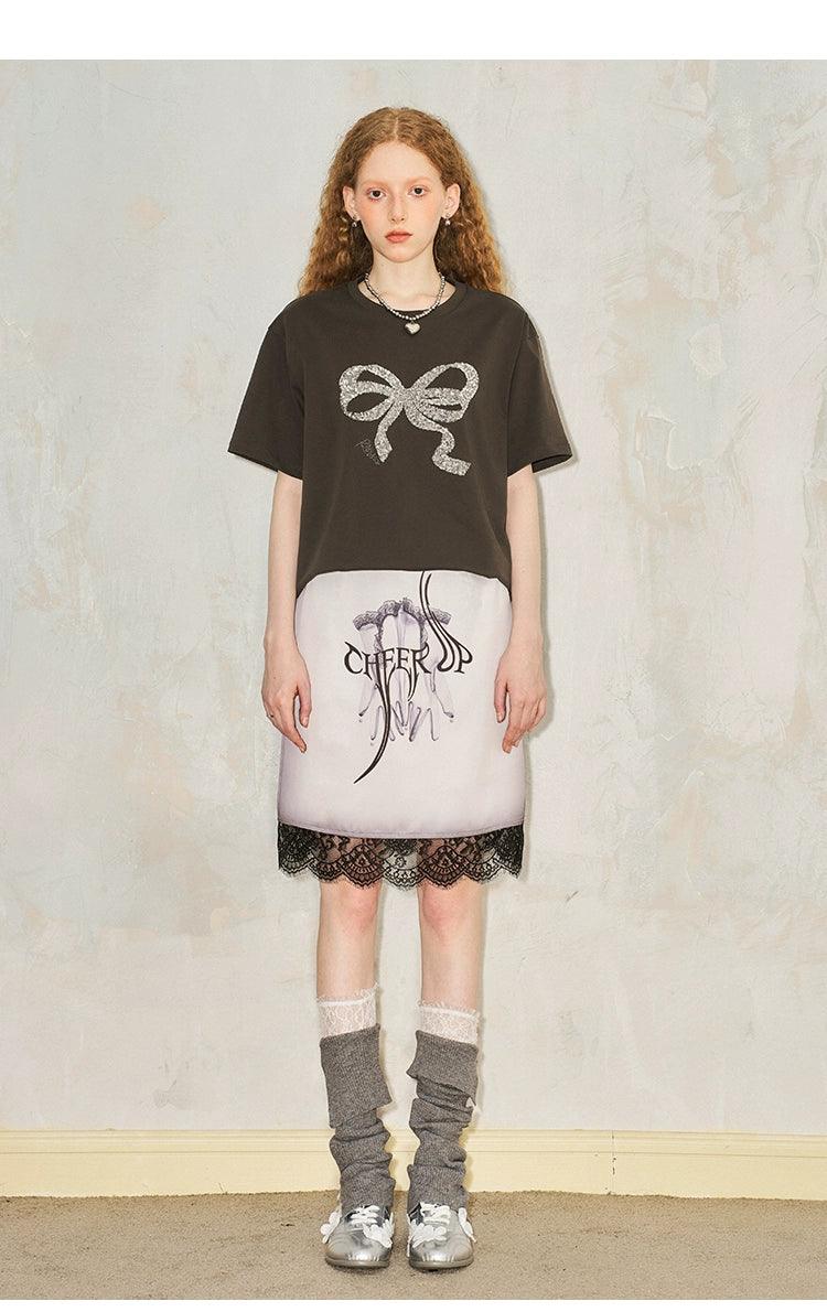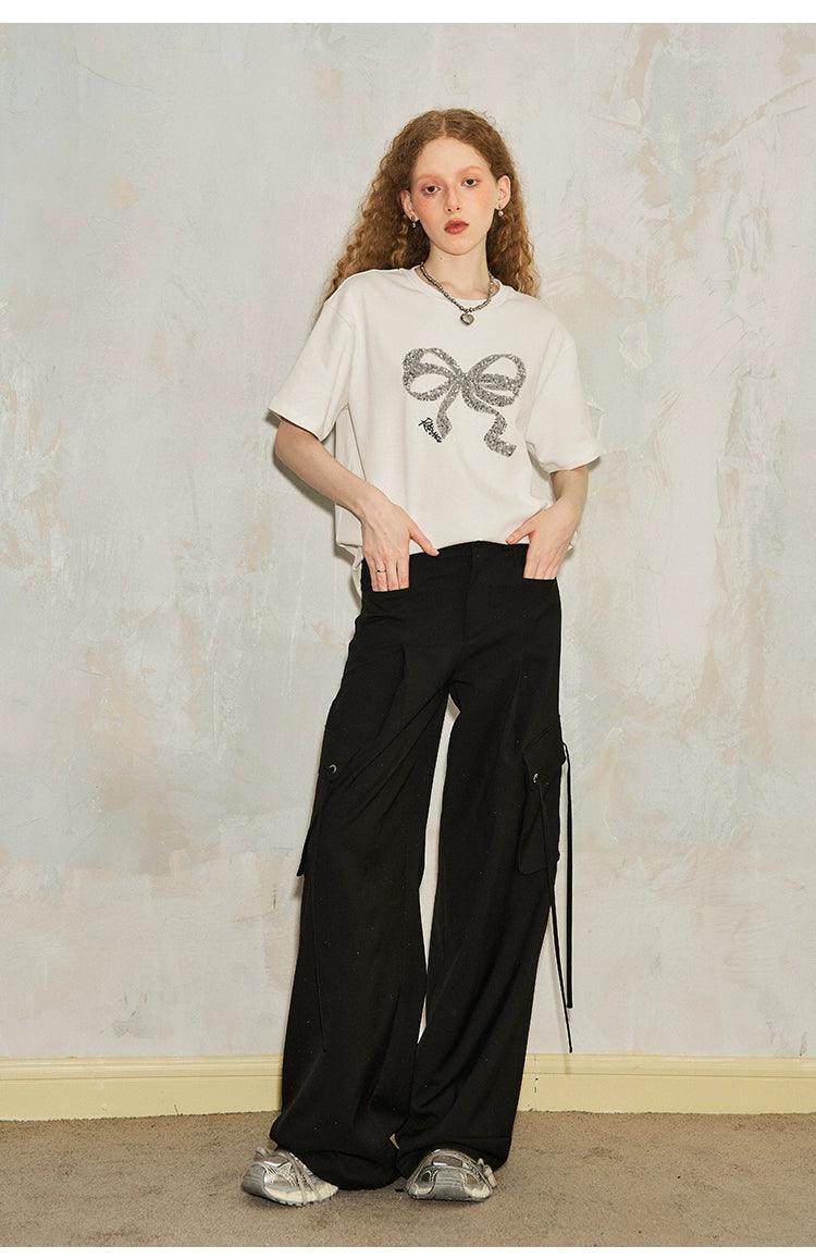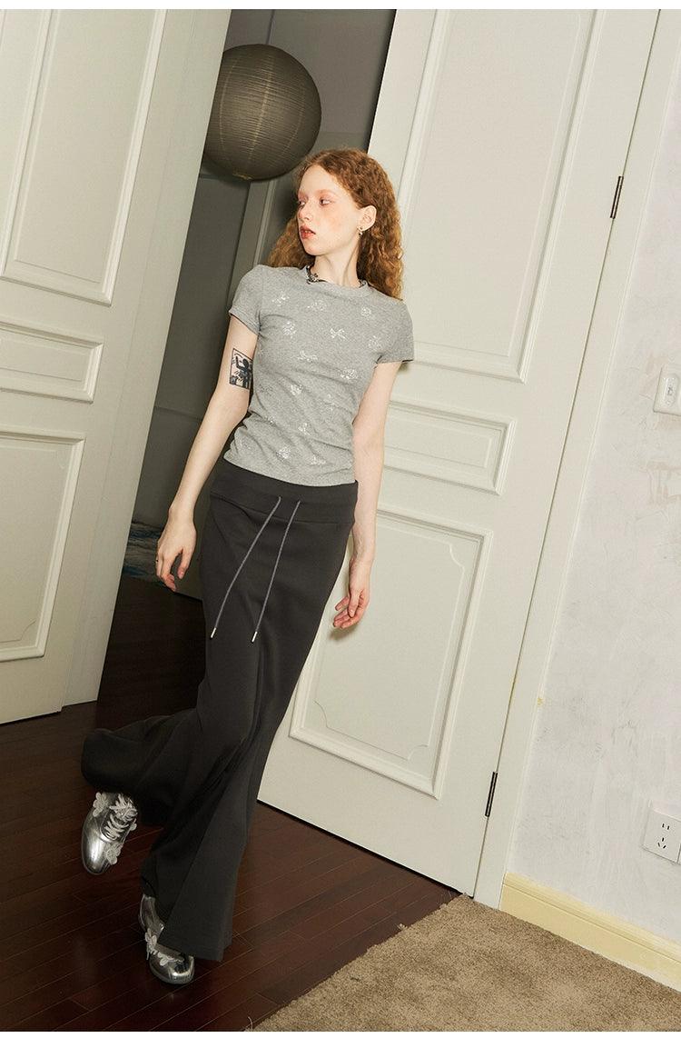 Girly Butterfly and Flower Print T-shirt: This T-shirt cleverly uses a repeating pattern of bows and flowers. The glossy rhinestone craftsmanship adds a lively. girlish element to the basic short-sleeved tee. It can be paired with short skirts and trousers. offering more styling possibilities.