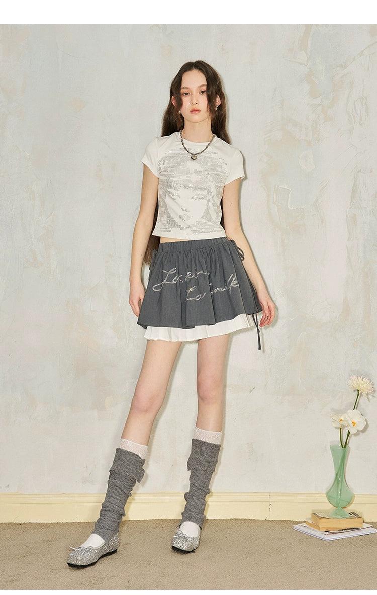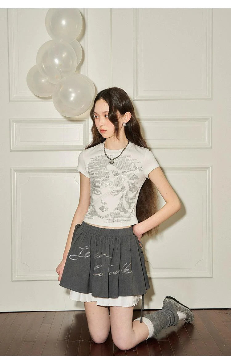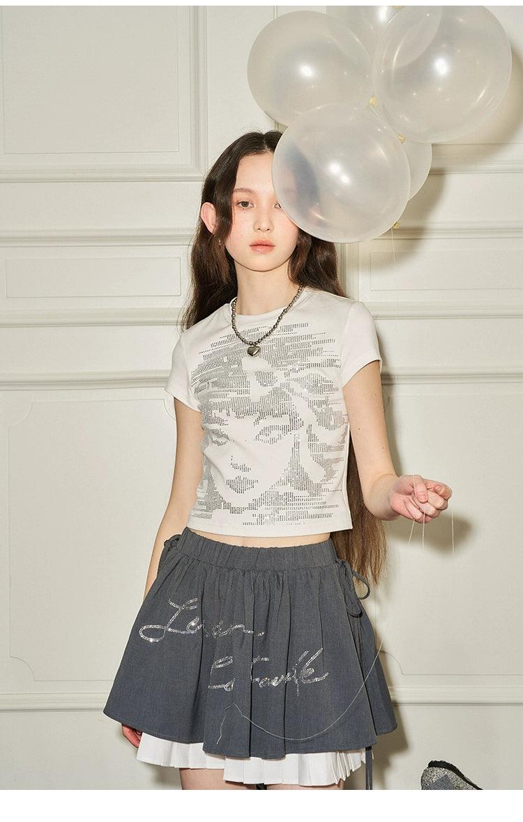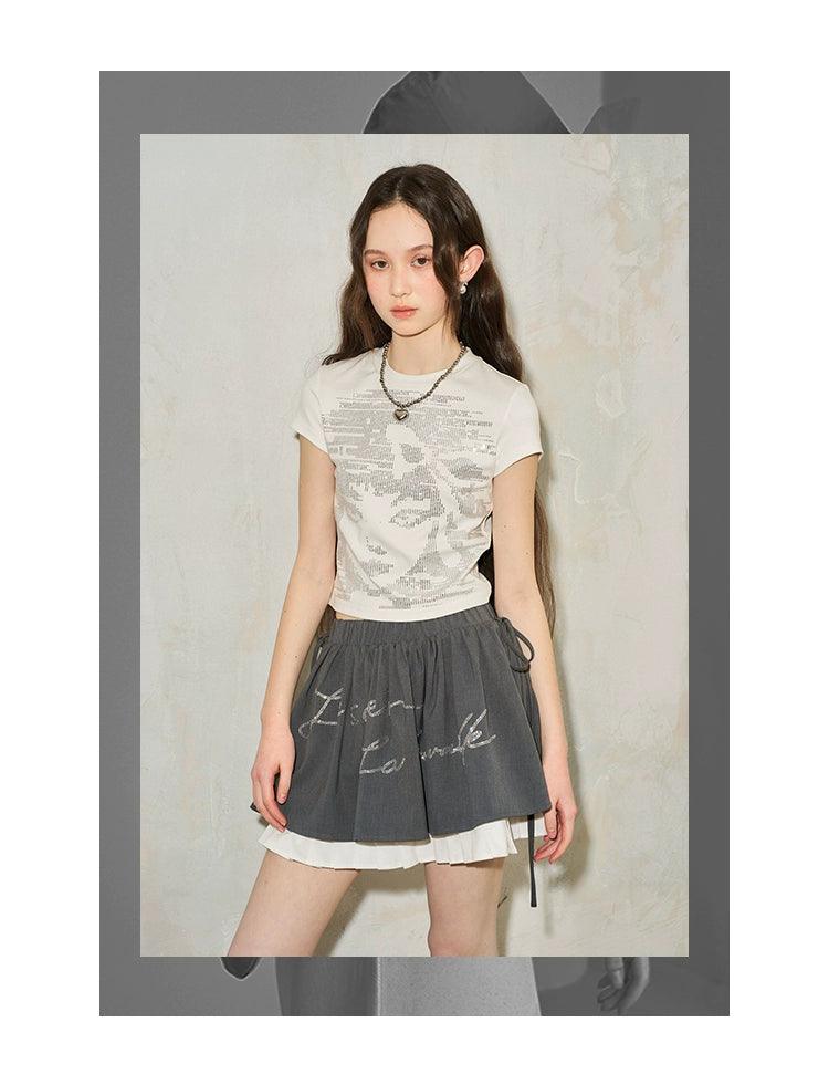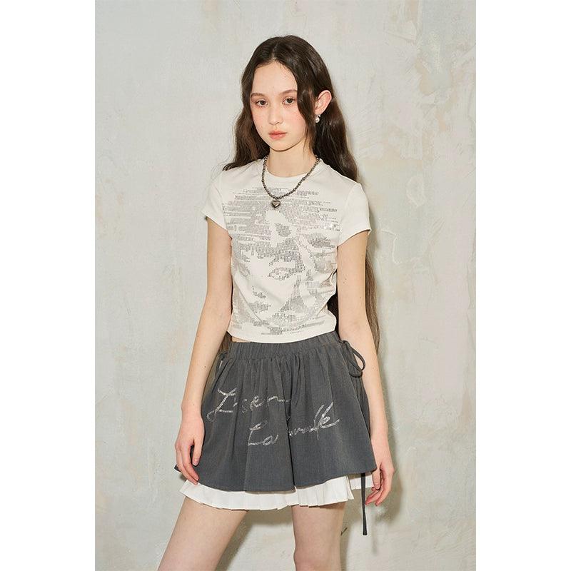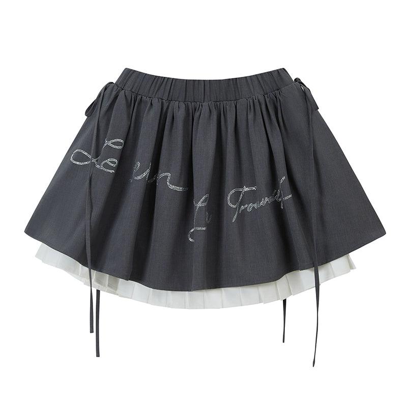 Casual Girly Double-strap Rhinestone Pleated Short Skirt: This rhinestone lettered half-skirt features a wavy pleated hem. Combined with a versatile gray-white color scheme. it brings a lively variation to the piece. Side straps are added to help you easily create an eye-catching casual girly fashion look.