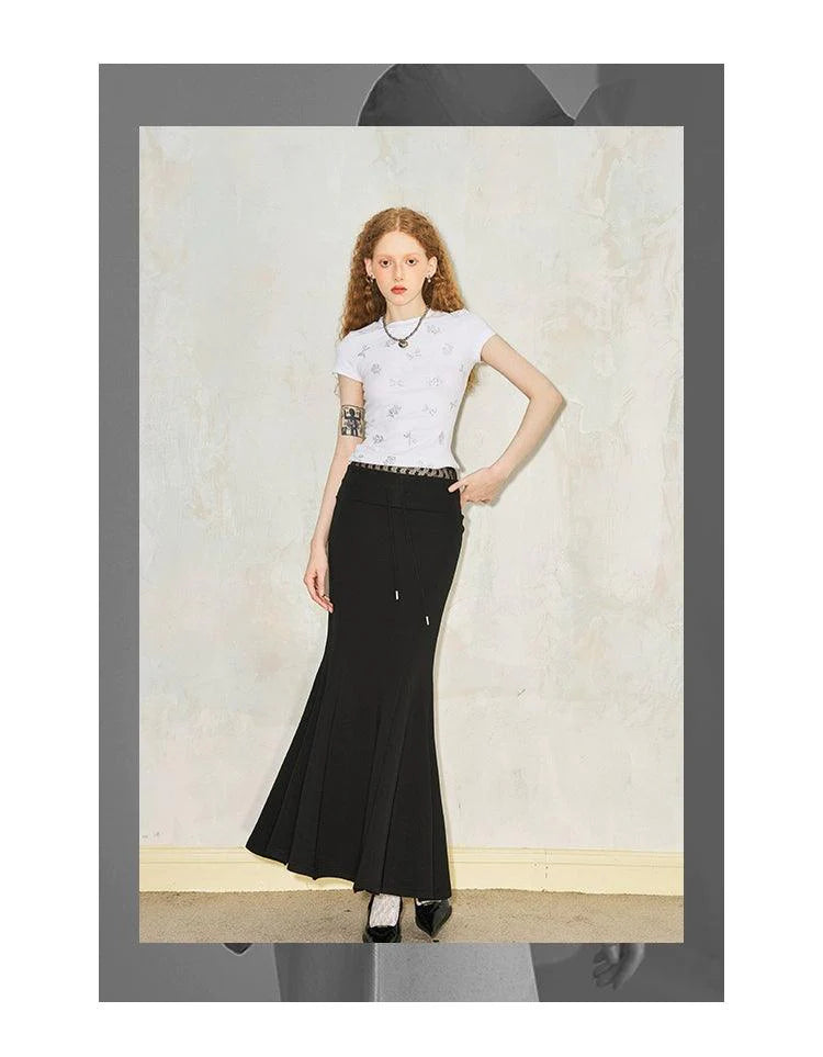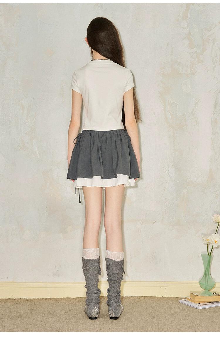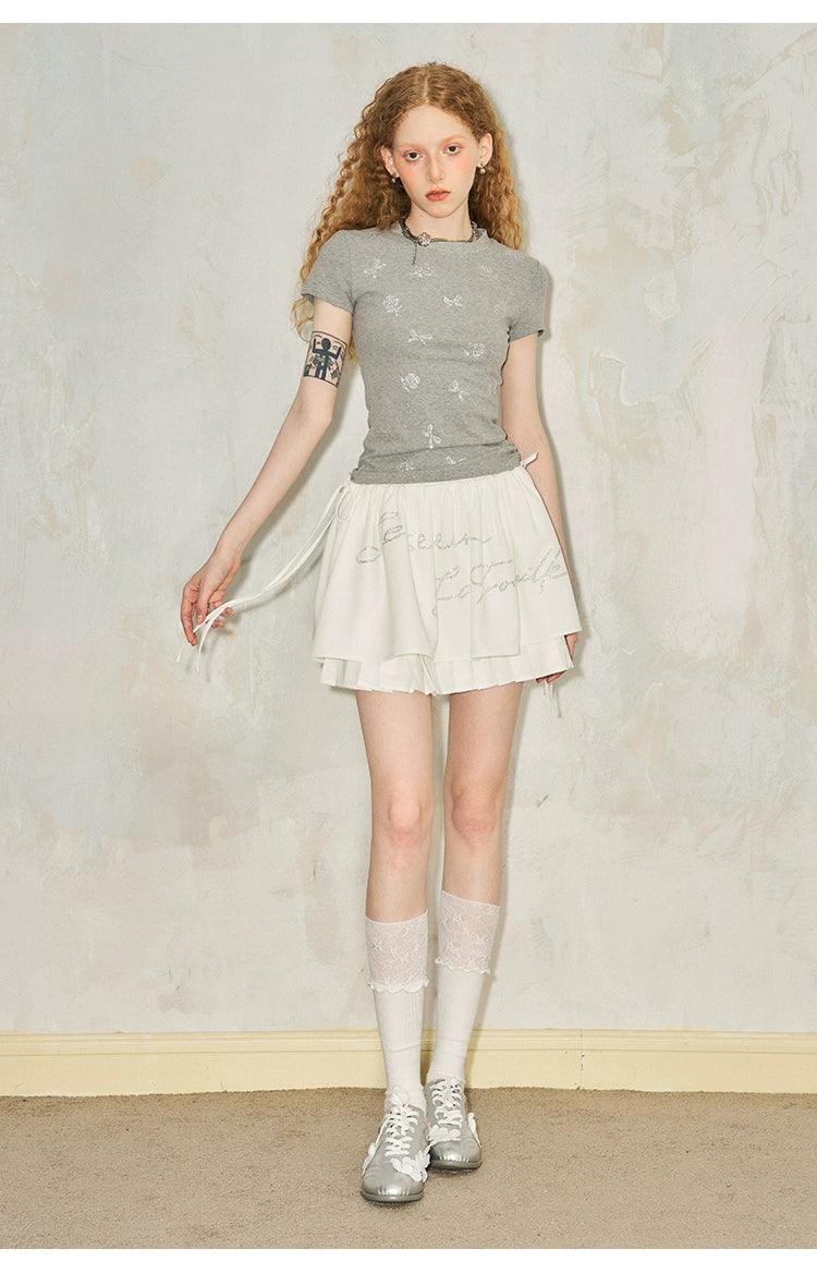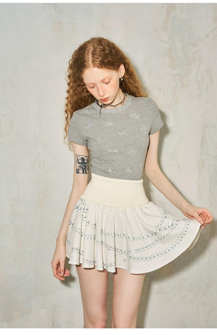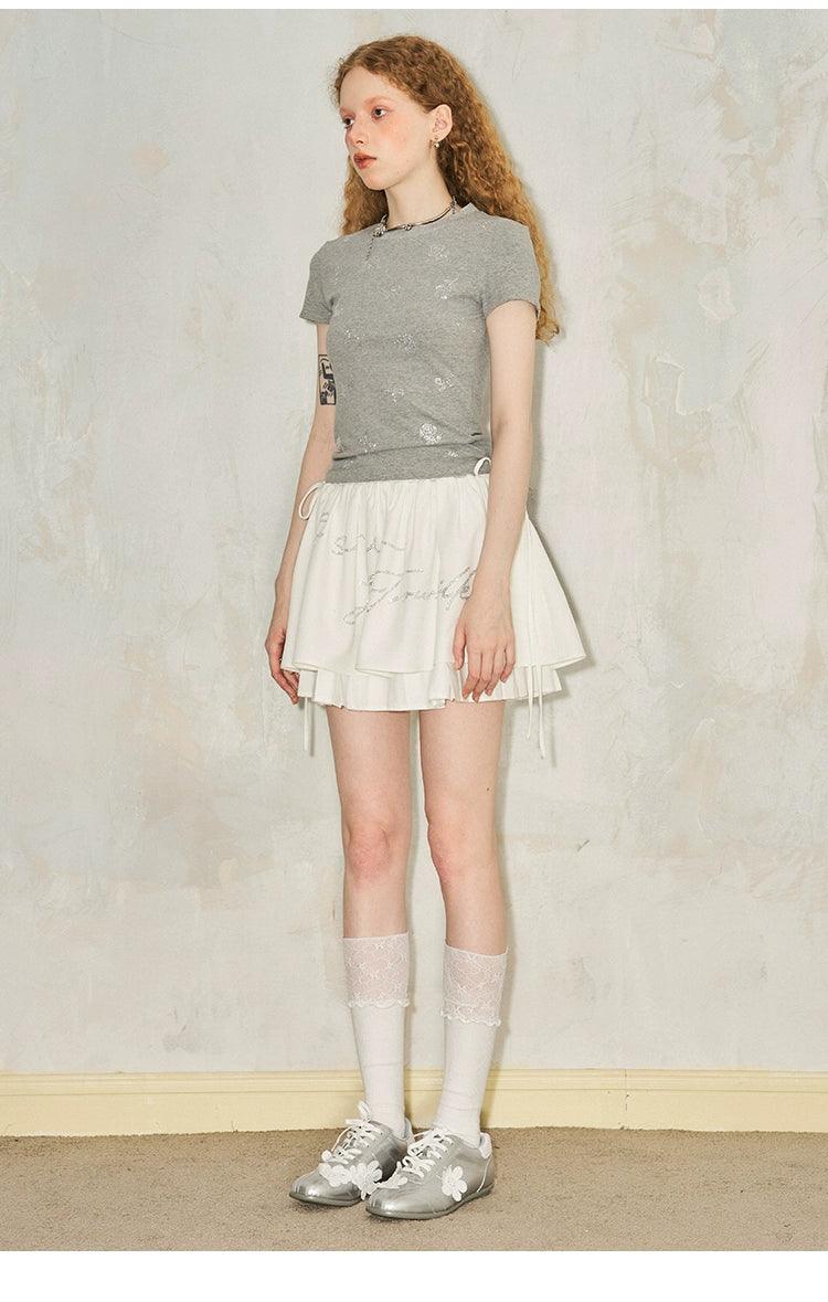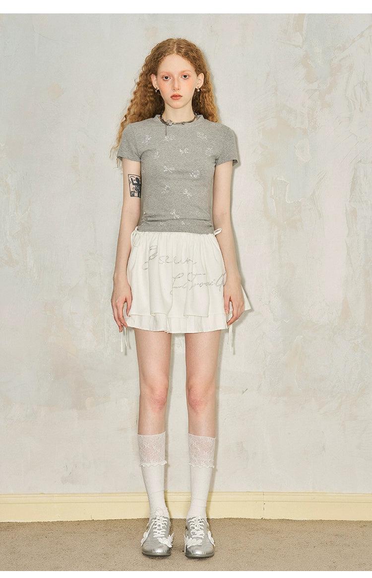 Casual Girly Double-strap Rhinestone Pleated Short Skirt: This rhinestone lettered half-skirt features a wavy pleated hem. Combined with a versatile gray-white color scheme. it brings a lively variation to the piece. Side straps are added to help you easily create an eye-catching casual girly fashion look.
