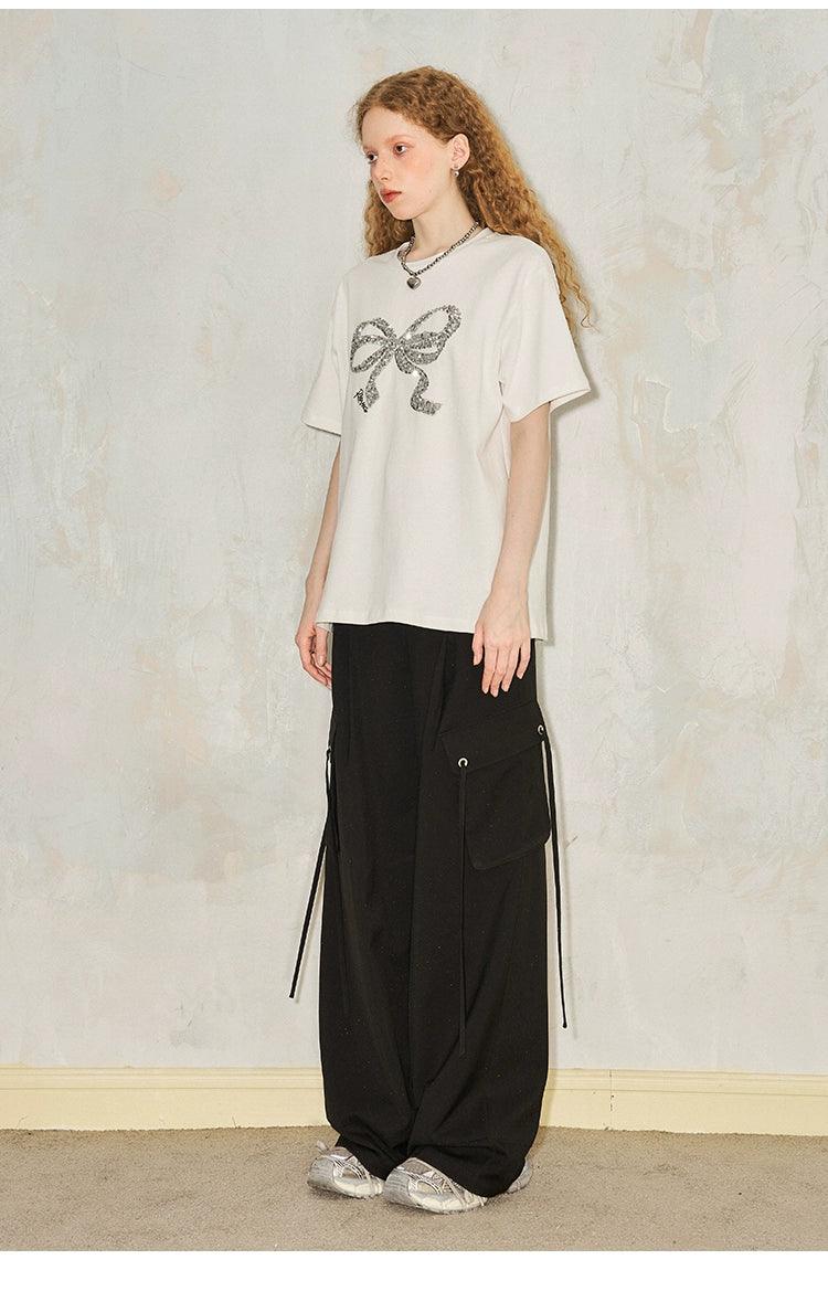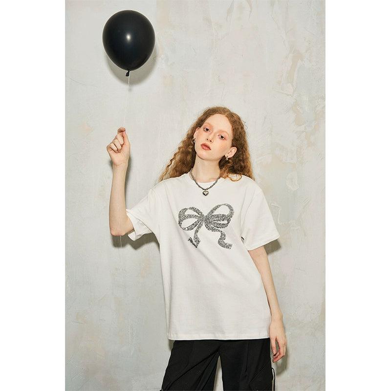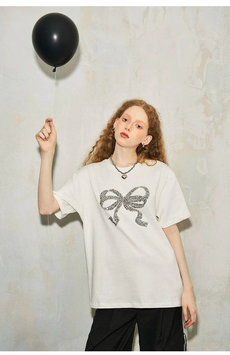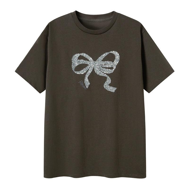 Bow Sequin T-shirt: The round neck and loose fit are easy to wear. aligning with the current pursuit of a relaxed and comfortable loose feel. appealing to a wide audience. The heavily worked bow sequin embroidery adds a lively variation to the T-shirt. giving it a refined and interesting layered look.