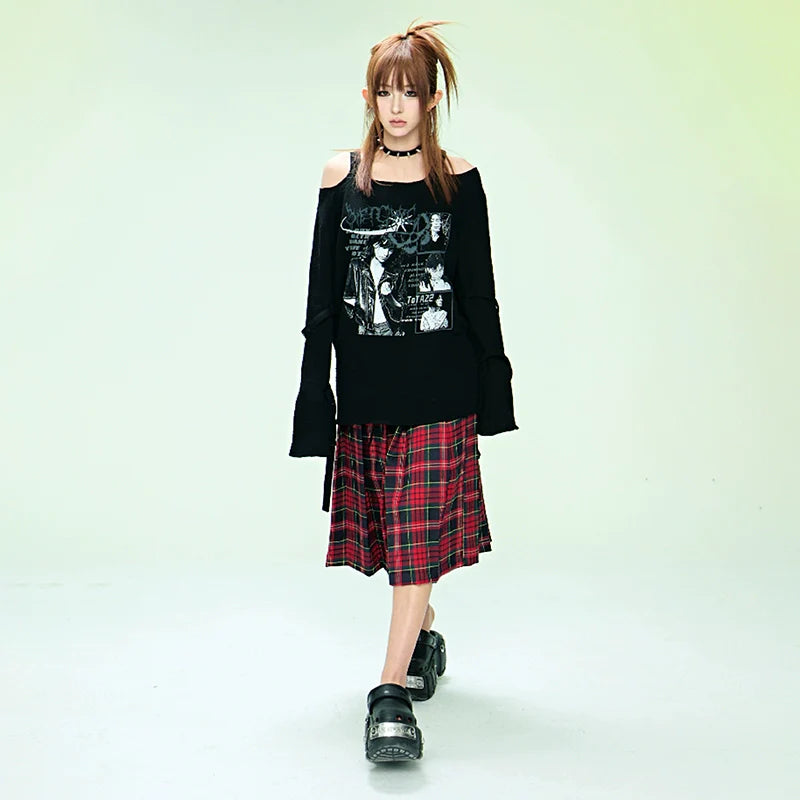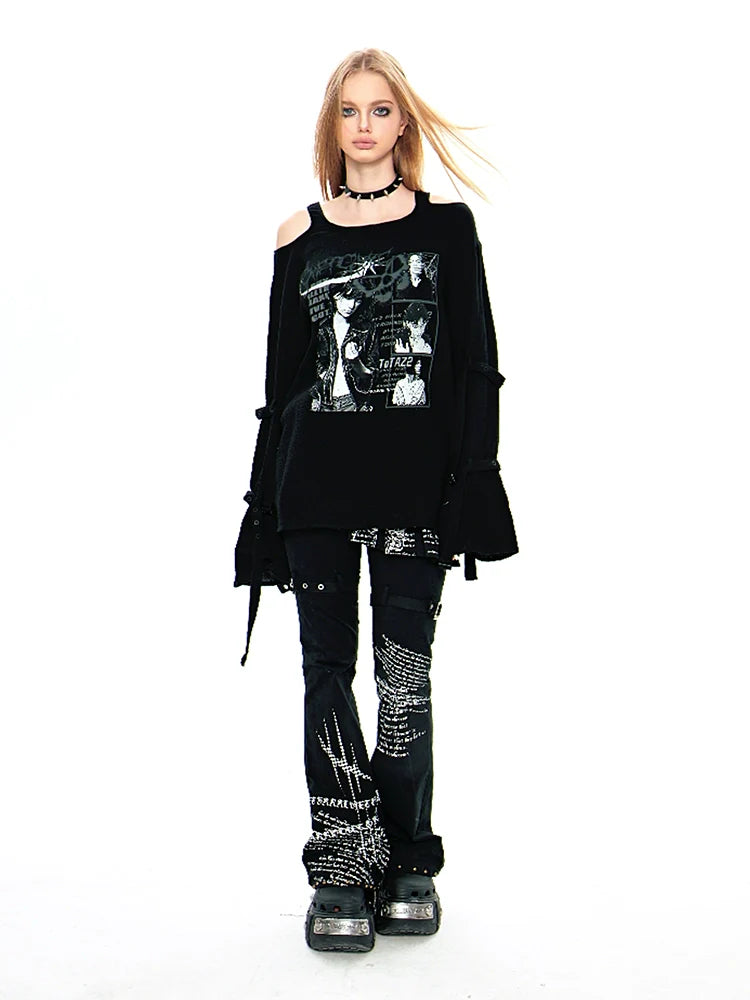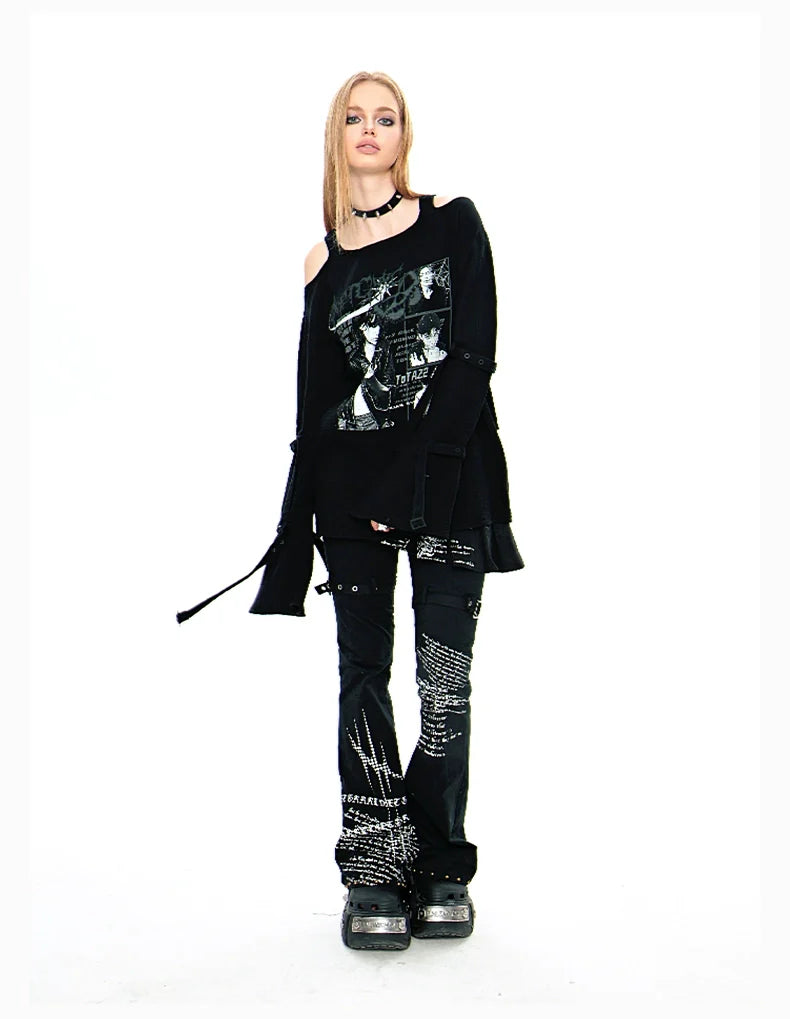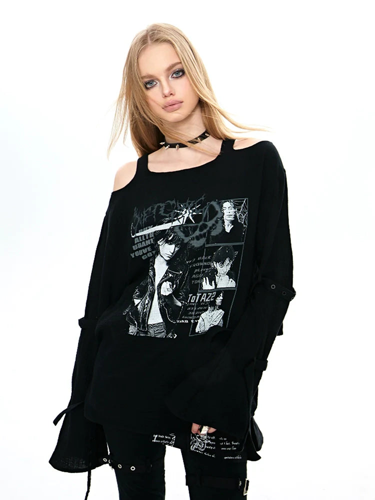 Diet Grrrl Gothic Punk Cold Shoulder Sweater - Black Graphic Print Long Sleeve Top With Thumb Holes