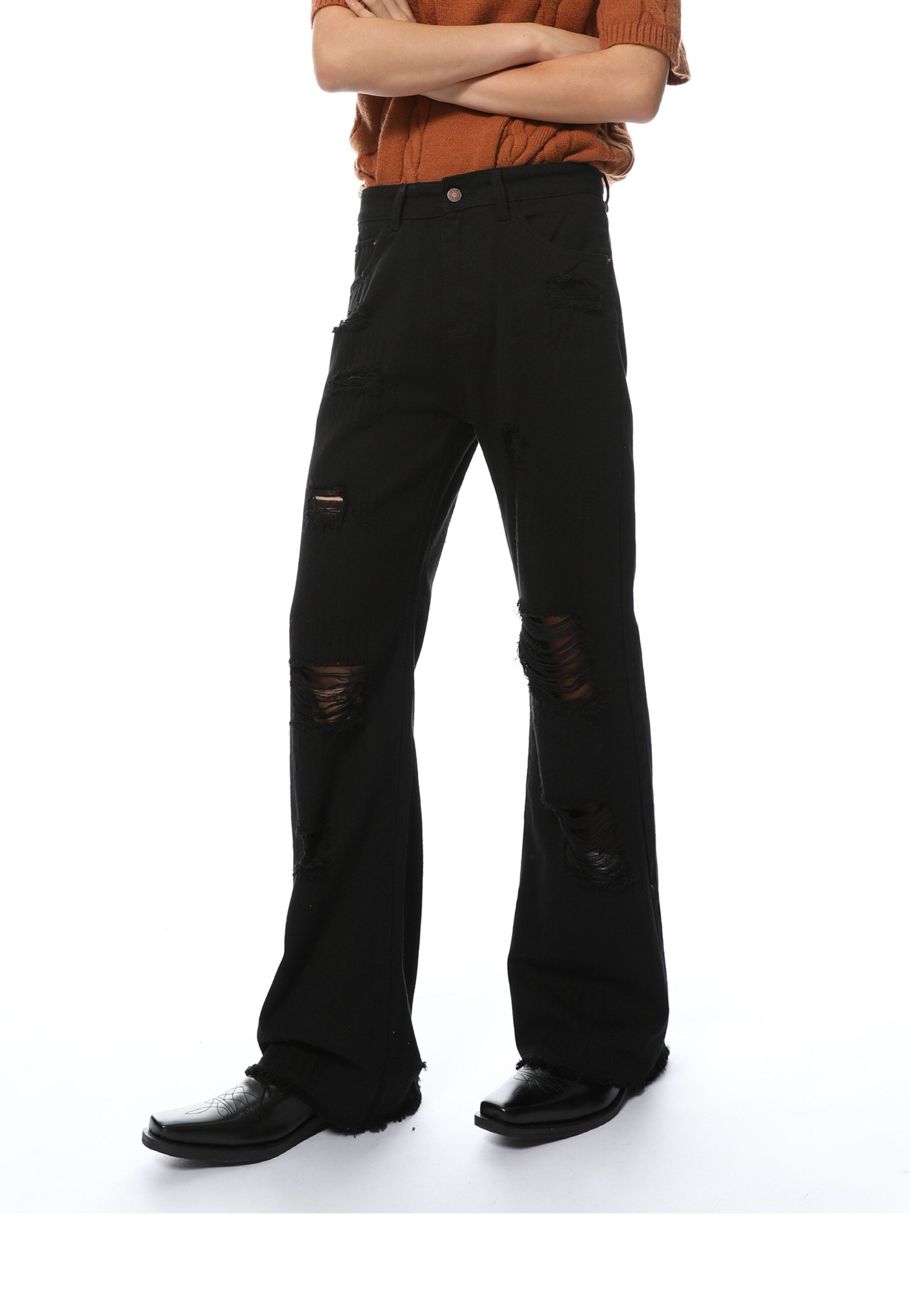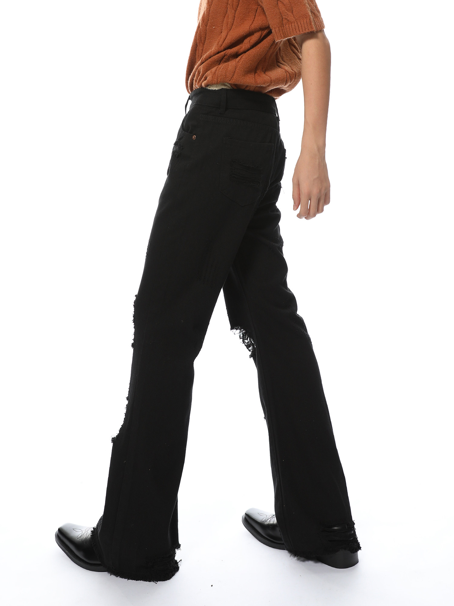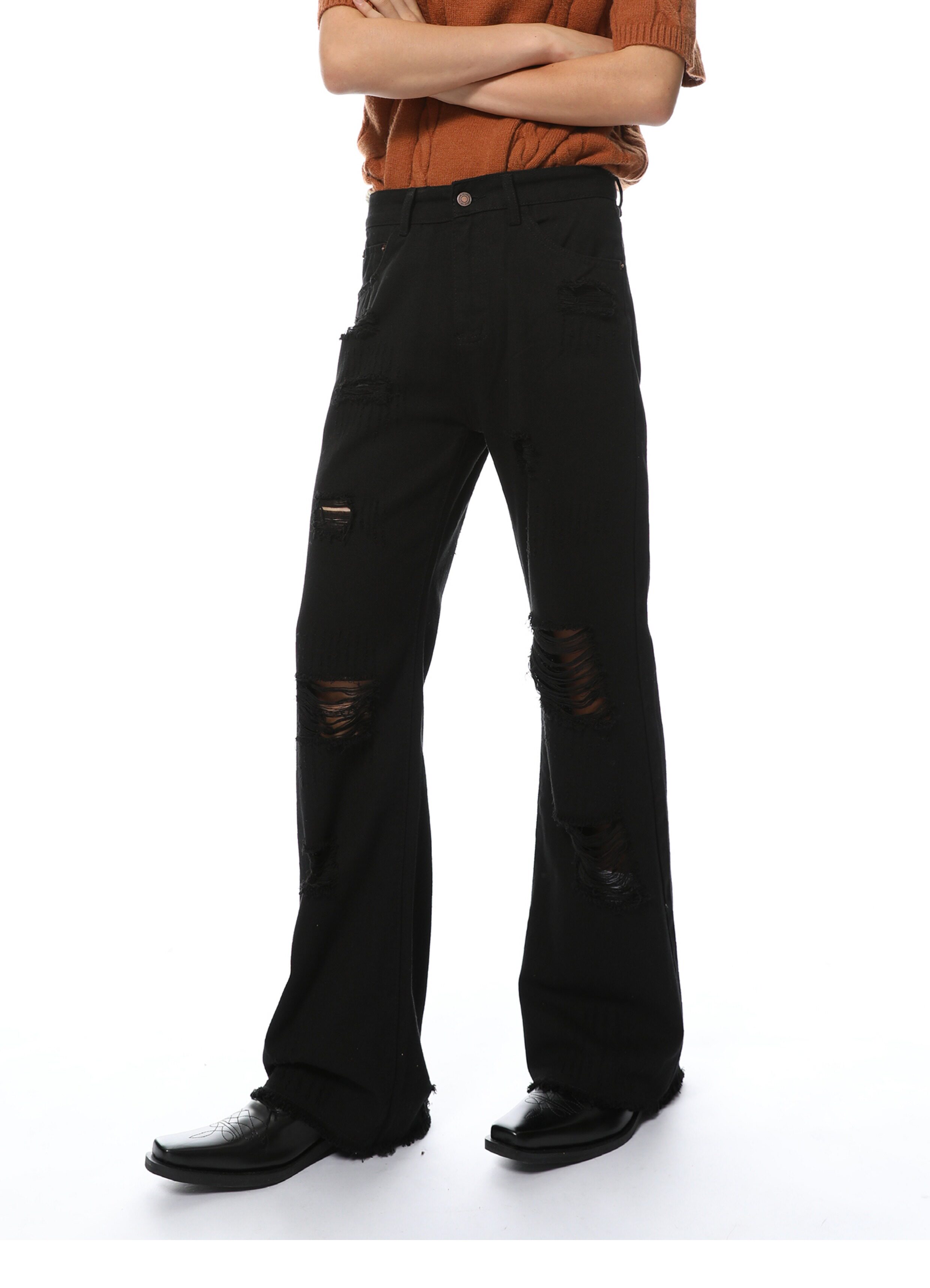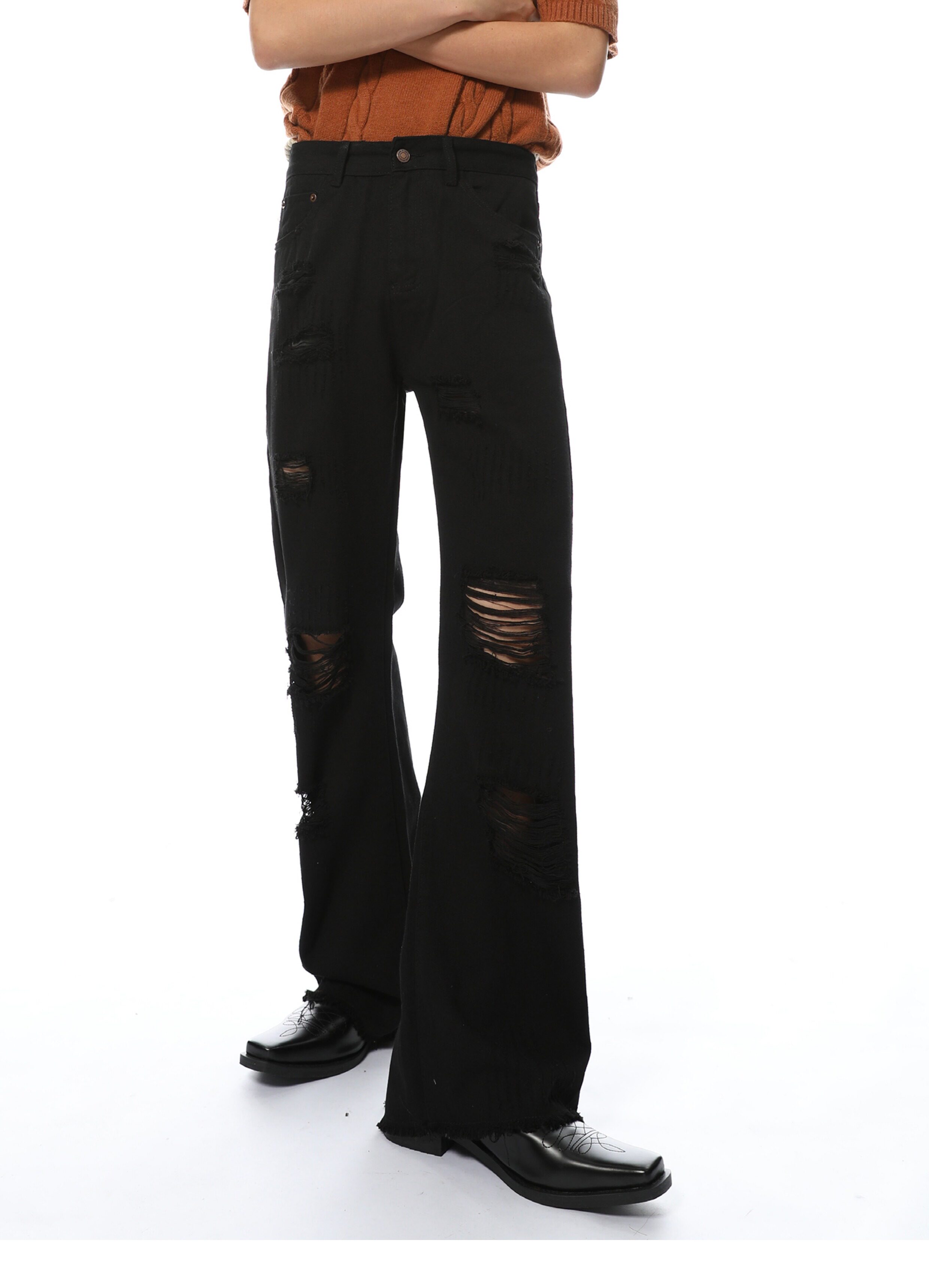 Elevate your denim game with our Distressed Black Wide-Leg Denim Jeans. Made from high-quality denim material. these jeans feature a trendy distressed design and a flattering wide-leg fit. Perfect for any occasion. these jeans will give you a chic and stylish look that never goes out of style.