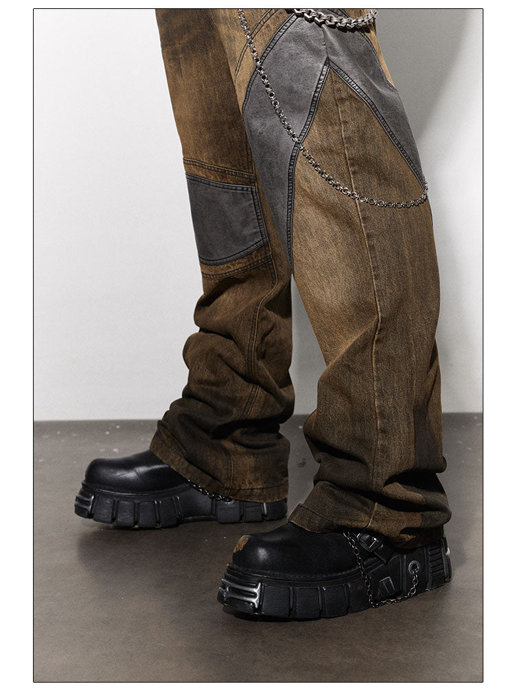 Crafted with expert precision. our Distressed Brown Leather-Patched Jeans with Studded Belt bring a touch of rock and roll to any outfit. Made of high-quality materials. these jeans feature durable leather patches and a bold studded belt for added edge. Elevate your style game with these versatile and stylish jeans.